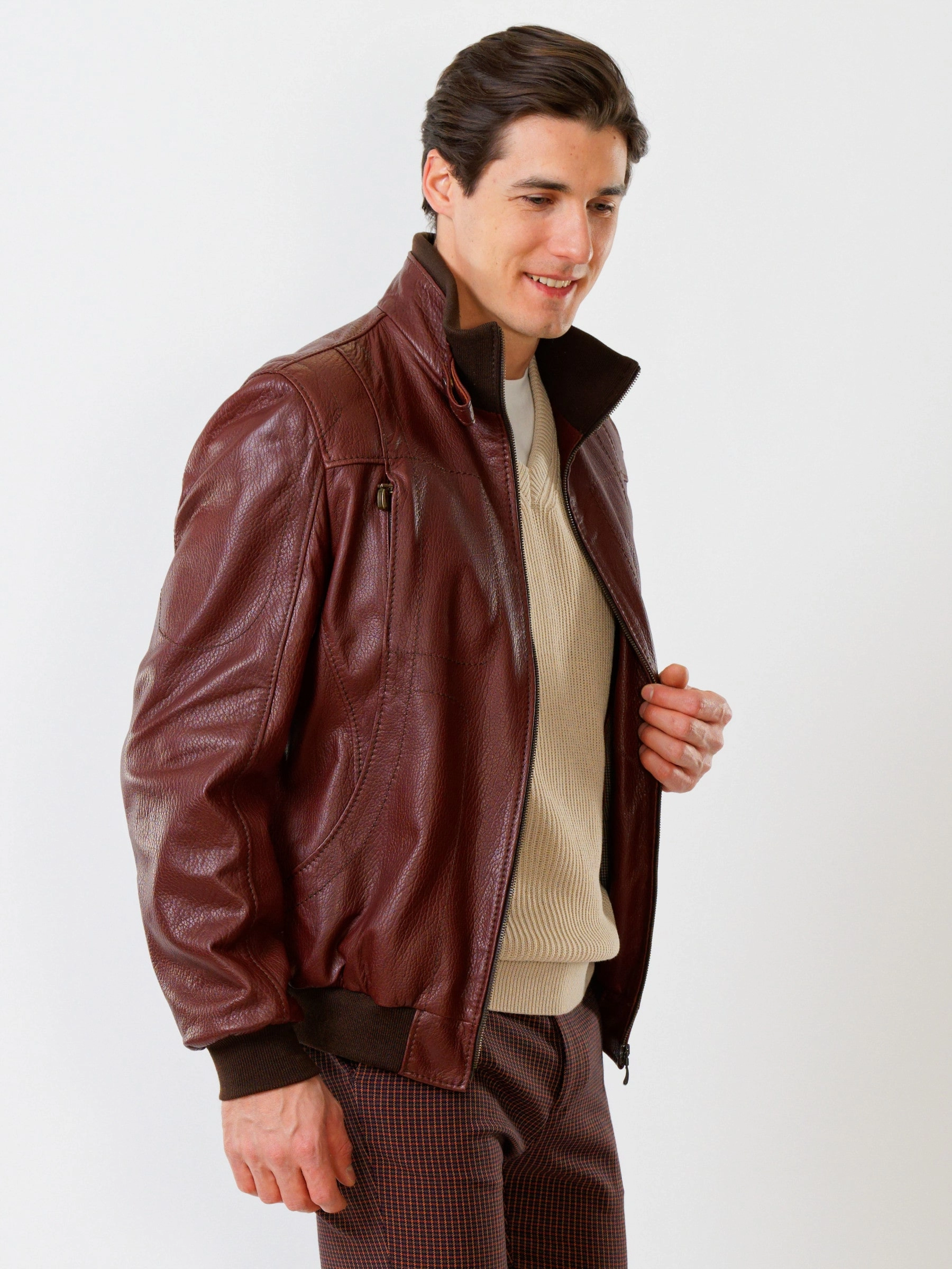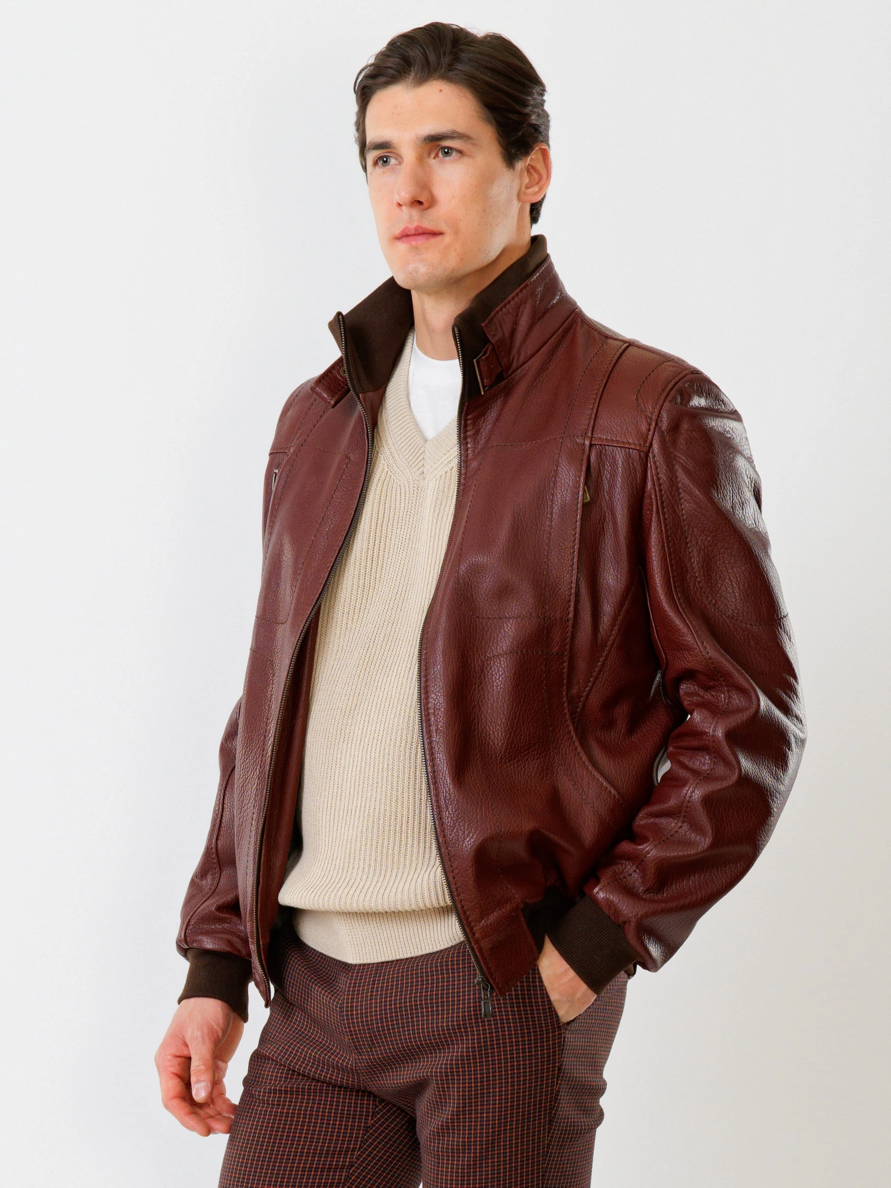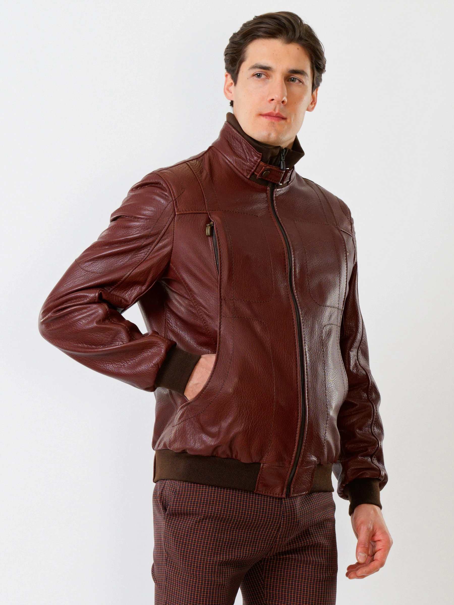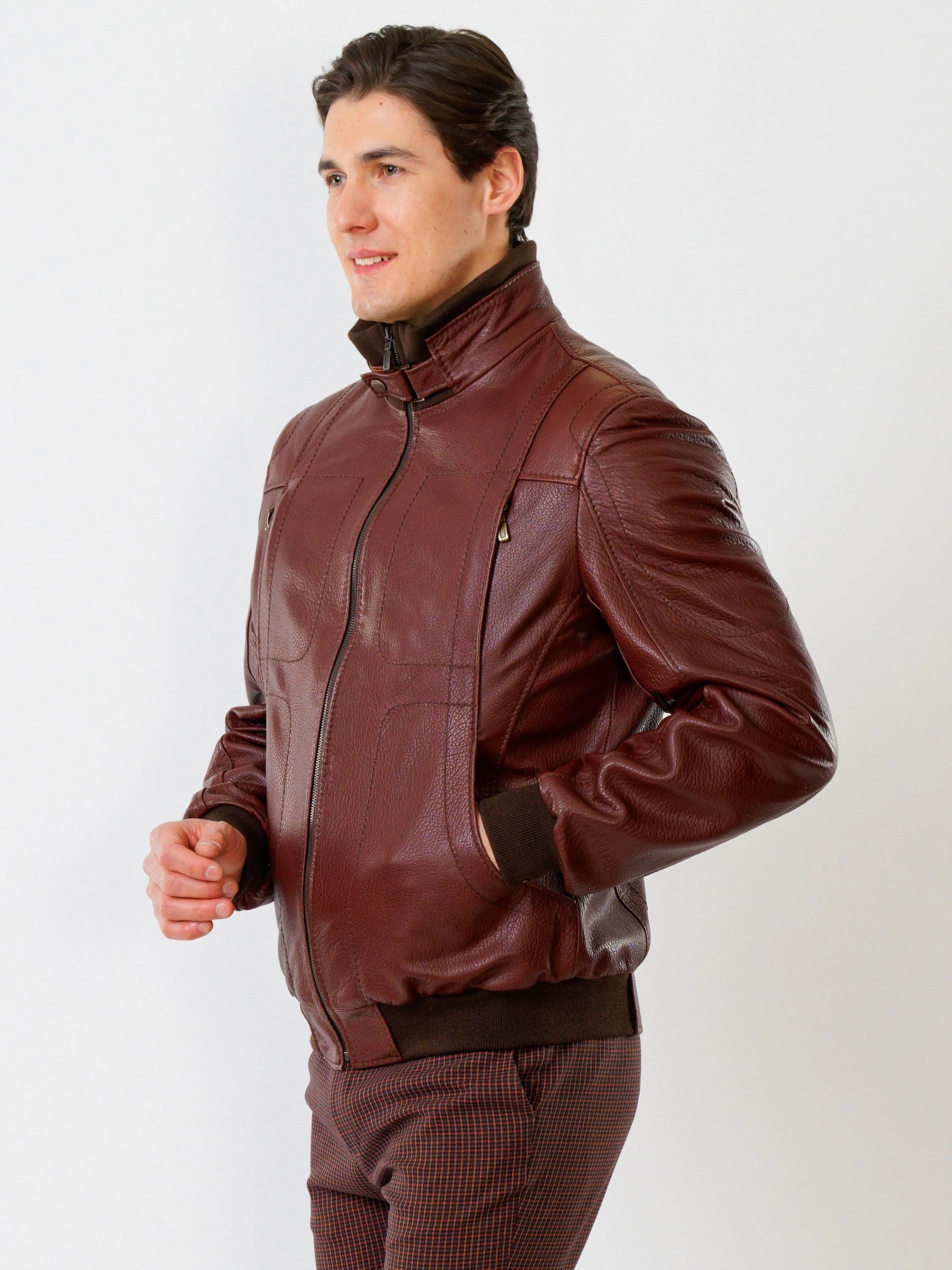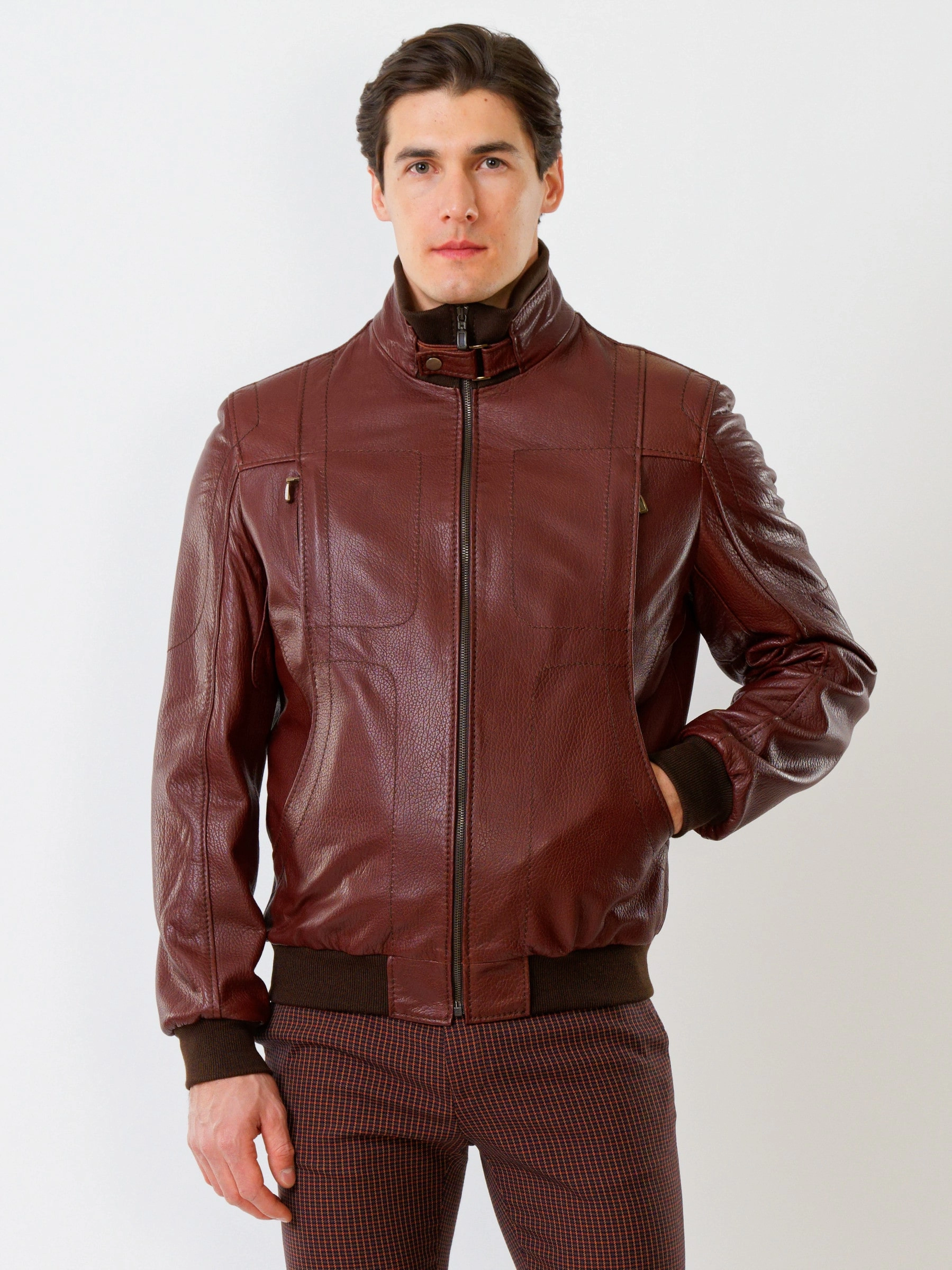 Спортивный стиль. Кожа премиального качества. Воротник-стойка. Застёжка-молния. Рукав втачной. Манжеты и низ модели выполнены из износостойкой трикотажной резинки. Предусмотрены удобные внутренние карманы для документов. Безупречная работа наших портных. Комфортная посадка по фигуре.