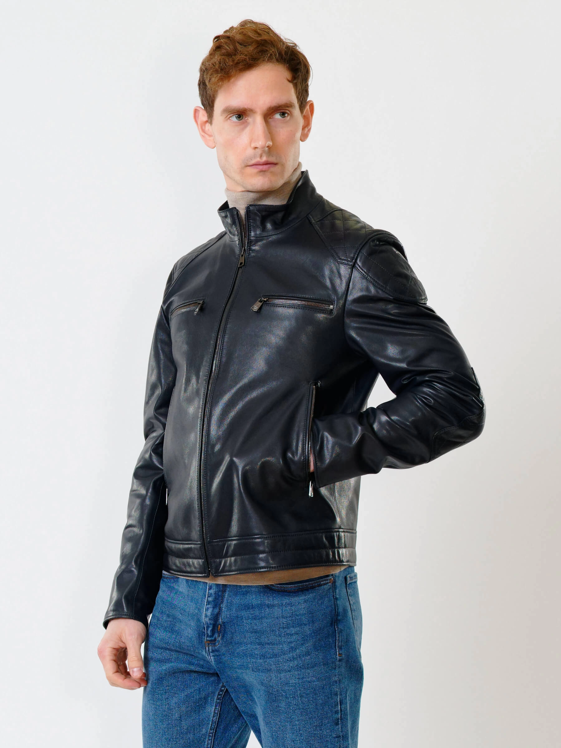 Короткую куртку полуприлегающего силуэта выполнили из гладкой кожи премиального качества. Невысокий воротник-стойка. Локоть и плечо втачного рукава выделили стеганным ромбовидным узором. Нагрудные и боковые карманы, как и само изделие застегиваются крупными молниями. Безупречная работа наших портных. Идеальная посадка по фигуре и прекрасная свобода движений.