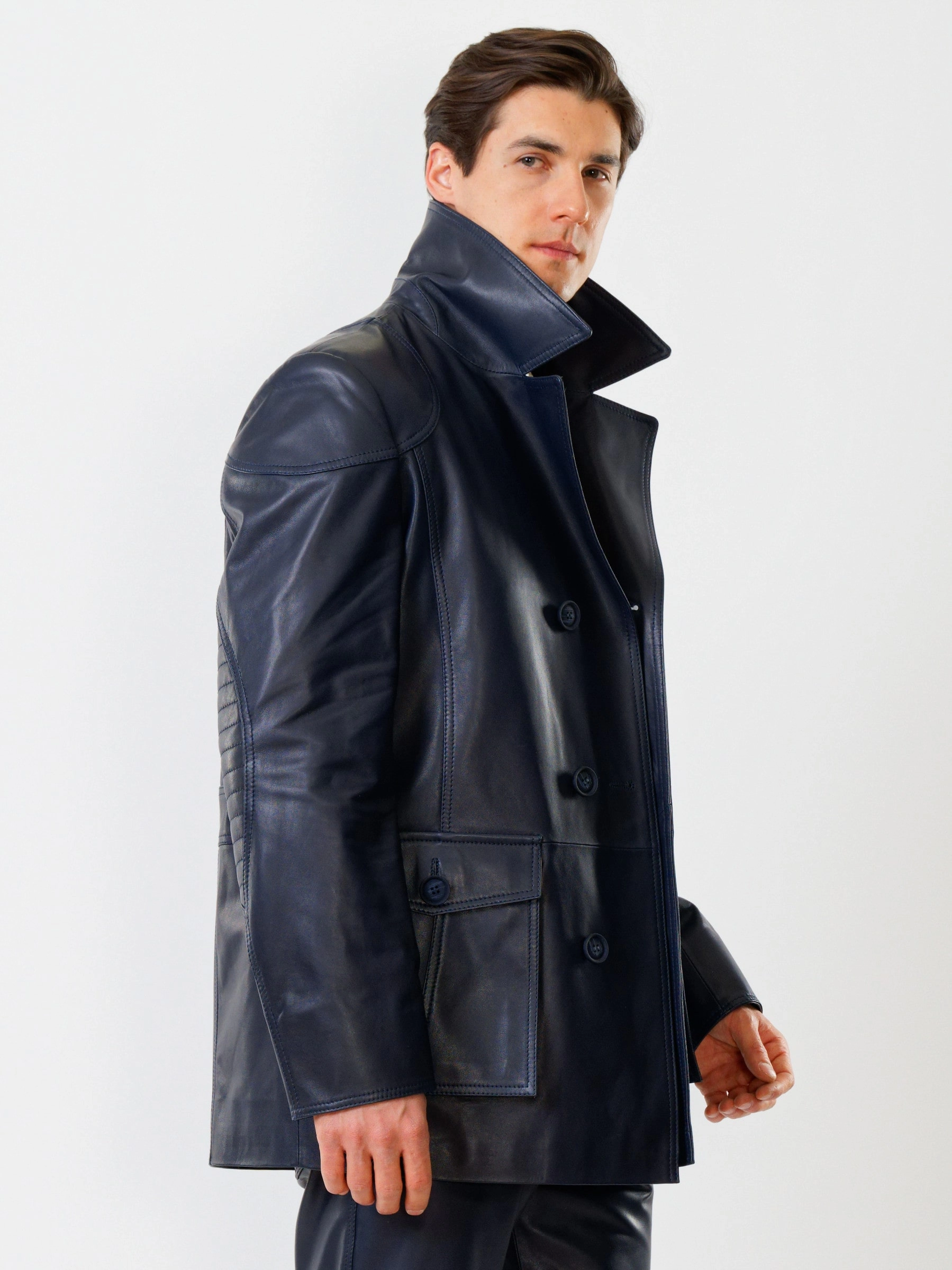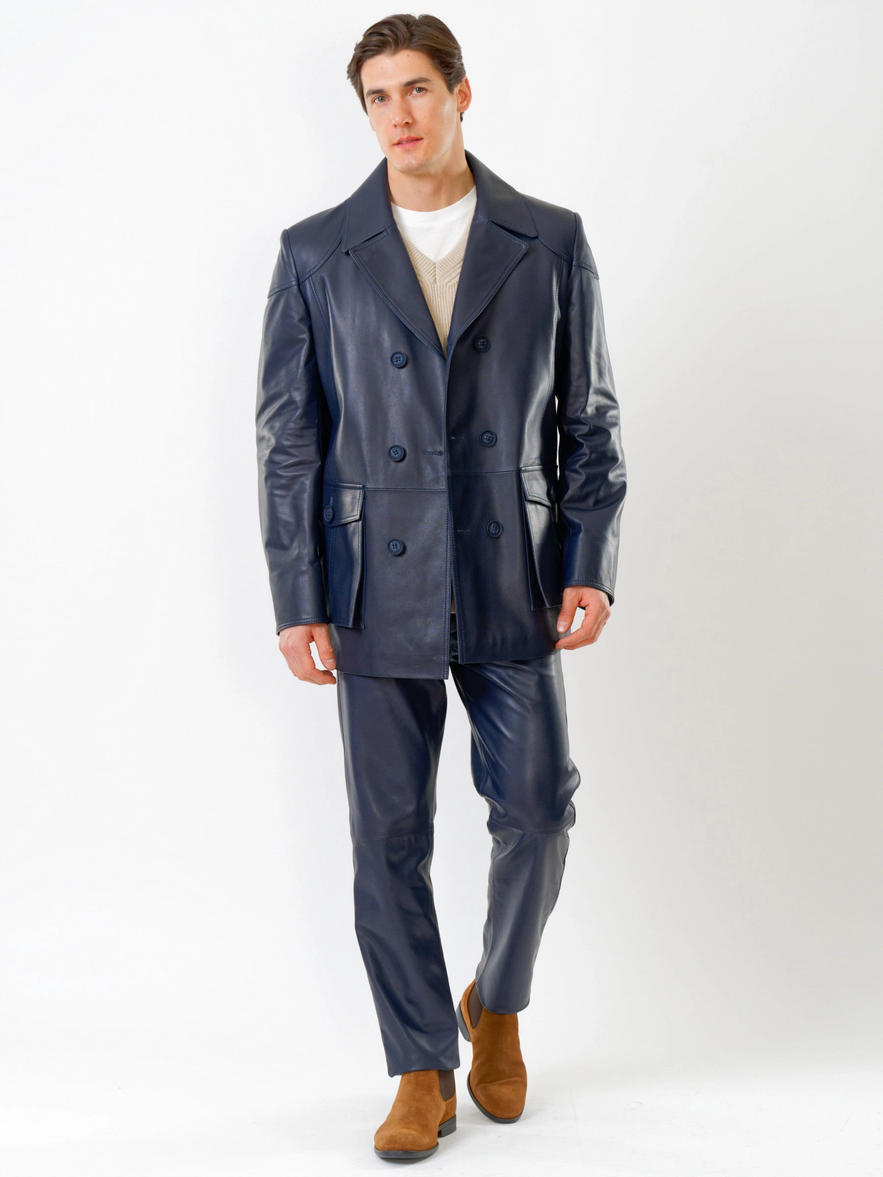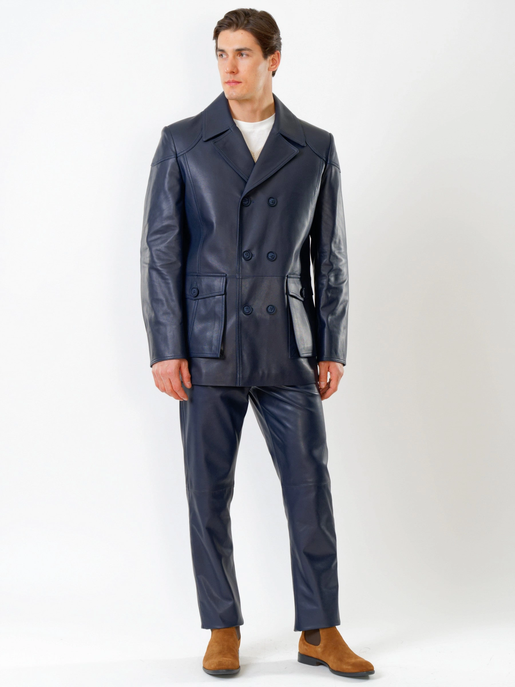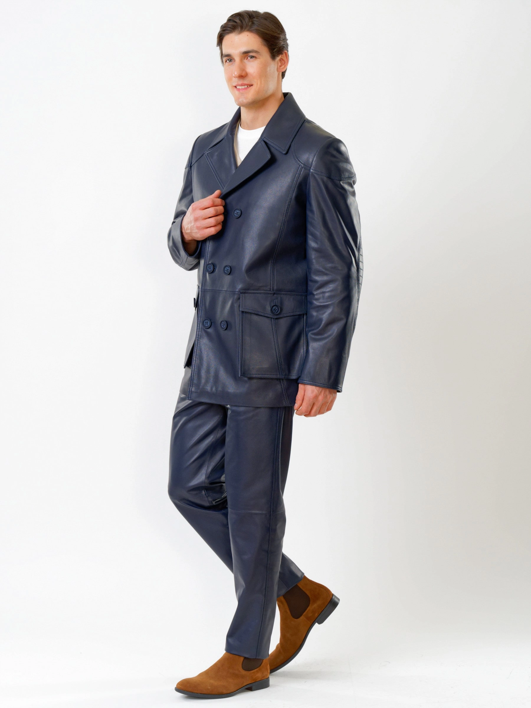 Двубортный кожаный бушлат с накладными карманами и кожаные брюки. Всегда дополнят Ваш индивидуальный образ. Кожа премиального качества. Безупречная работа портных. Комфортная посадка по фигуре.