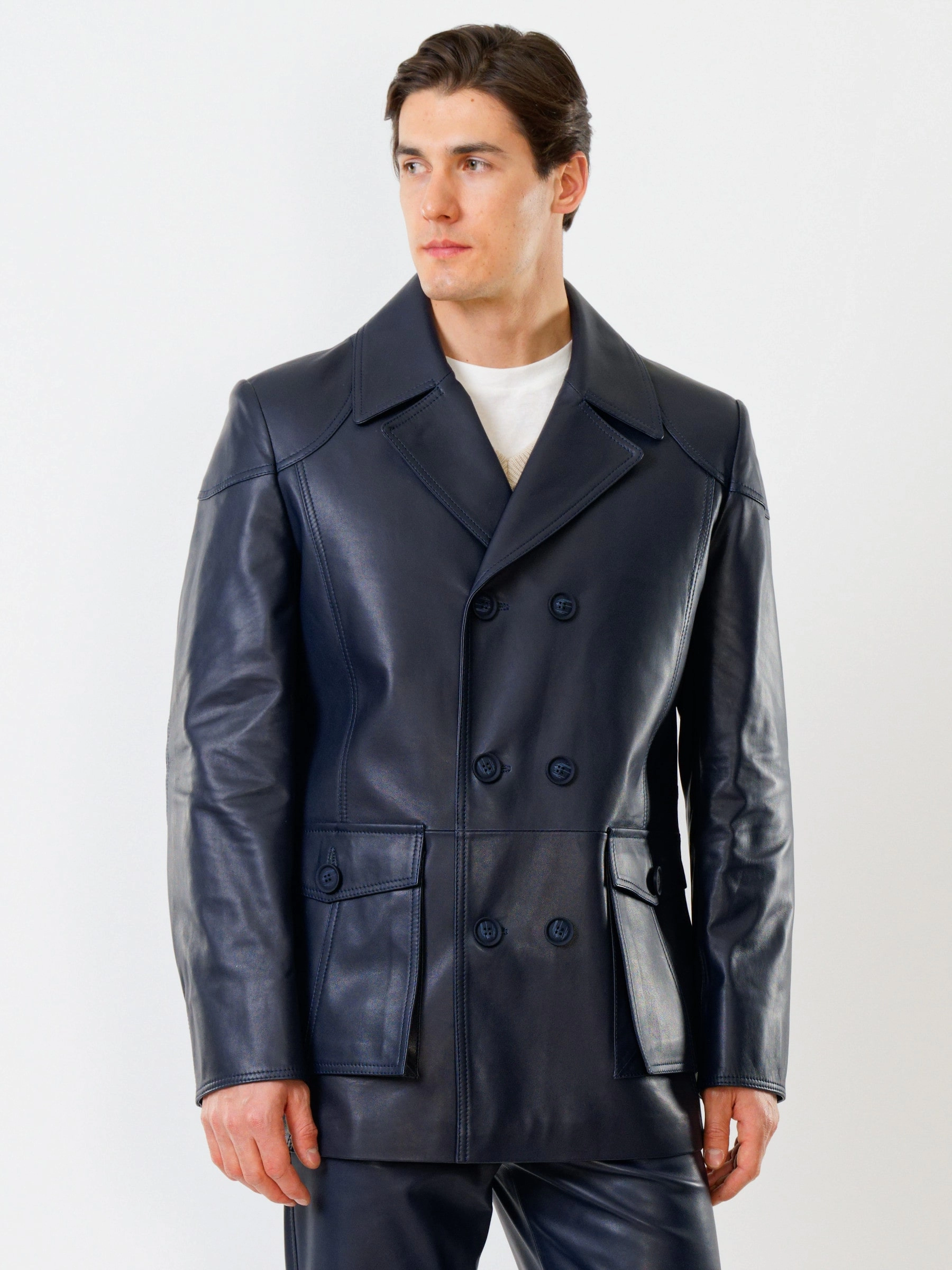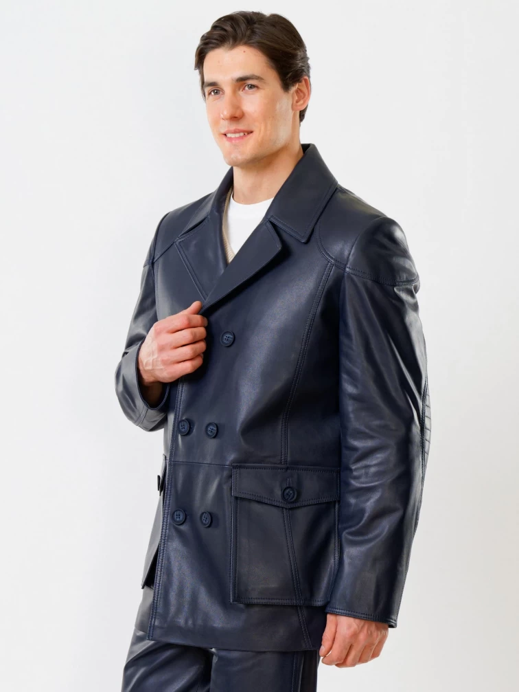 Двубортная мужская кожаная куртка бушлат 549, синяя, размер 48, артикул 28360