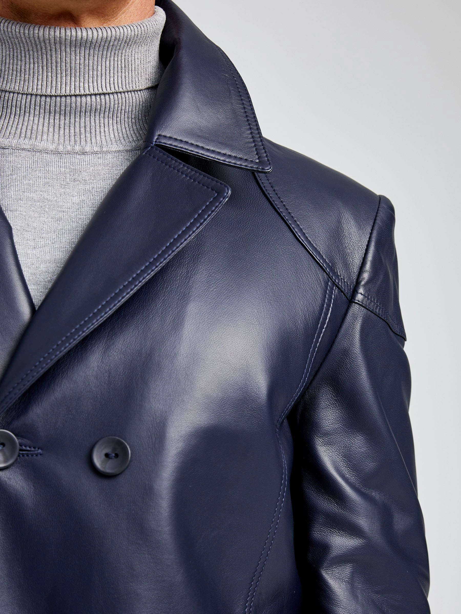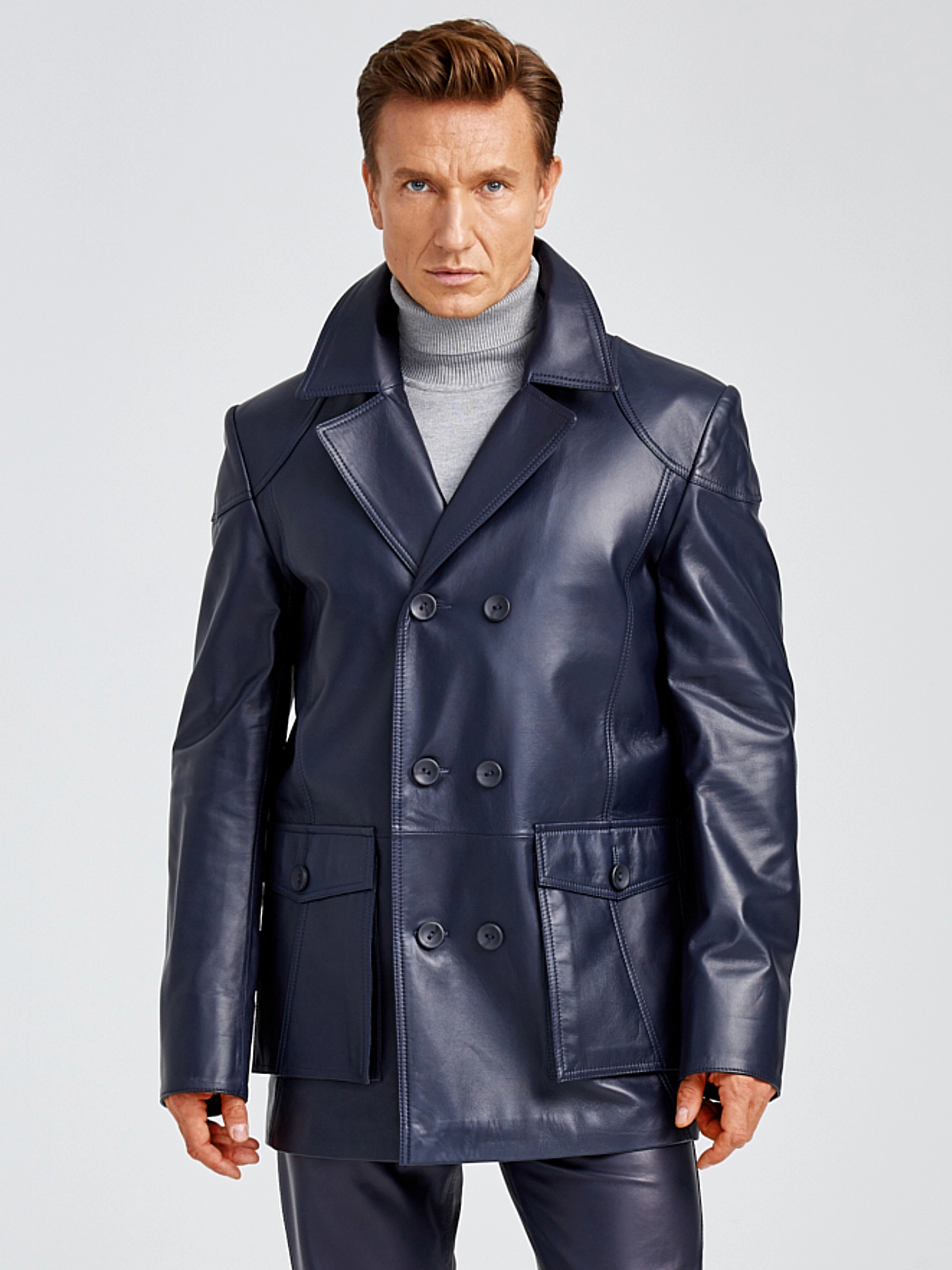 Двубортная мужская кожаная куртка бушлат 549, синяя, размер 48, артикул 28881