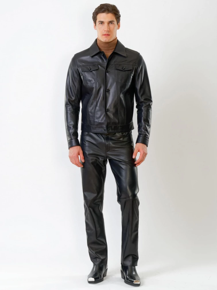 Кожаная куртка в «джинсовом стиле». Нагрудные карманы, отстрочки рельефов полочек, пуговицы-болты, всё повторяет дизайн классических курток из деним. С курткой прекрасно сочетаются кожаные брюки. Кожа премиального качества. Безупречная работа портных. Комфортная посадка по фигуре.