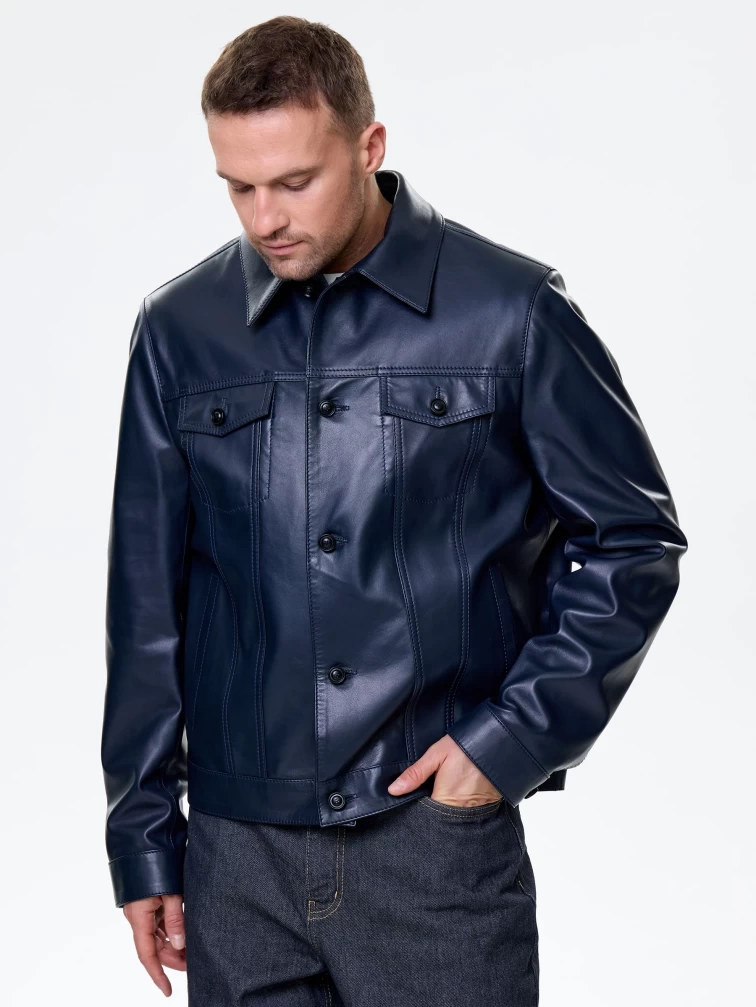 Товар короткая мужская кожаная куртка в джинсовом стиле 550, синяя, размер 48, артикул 29750 выполнен из натуральной кожи с застежкой кнопки. Рассчитан на сезон: весна-лето. Длина изделия 67 см, силуэт полуприлегающий.