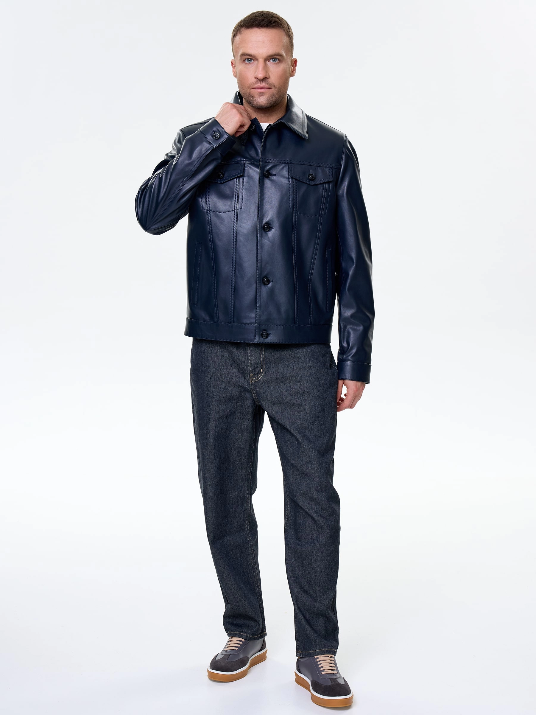 Короткая мужская кожаная куртка в джинсовом стиле 550, синяя, размер 48, артикул 29750