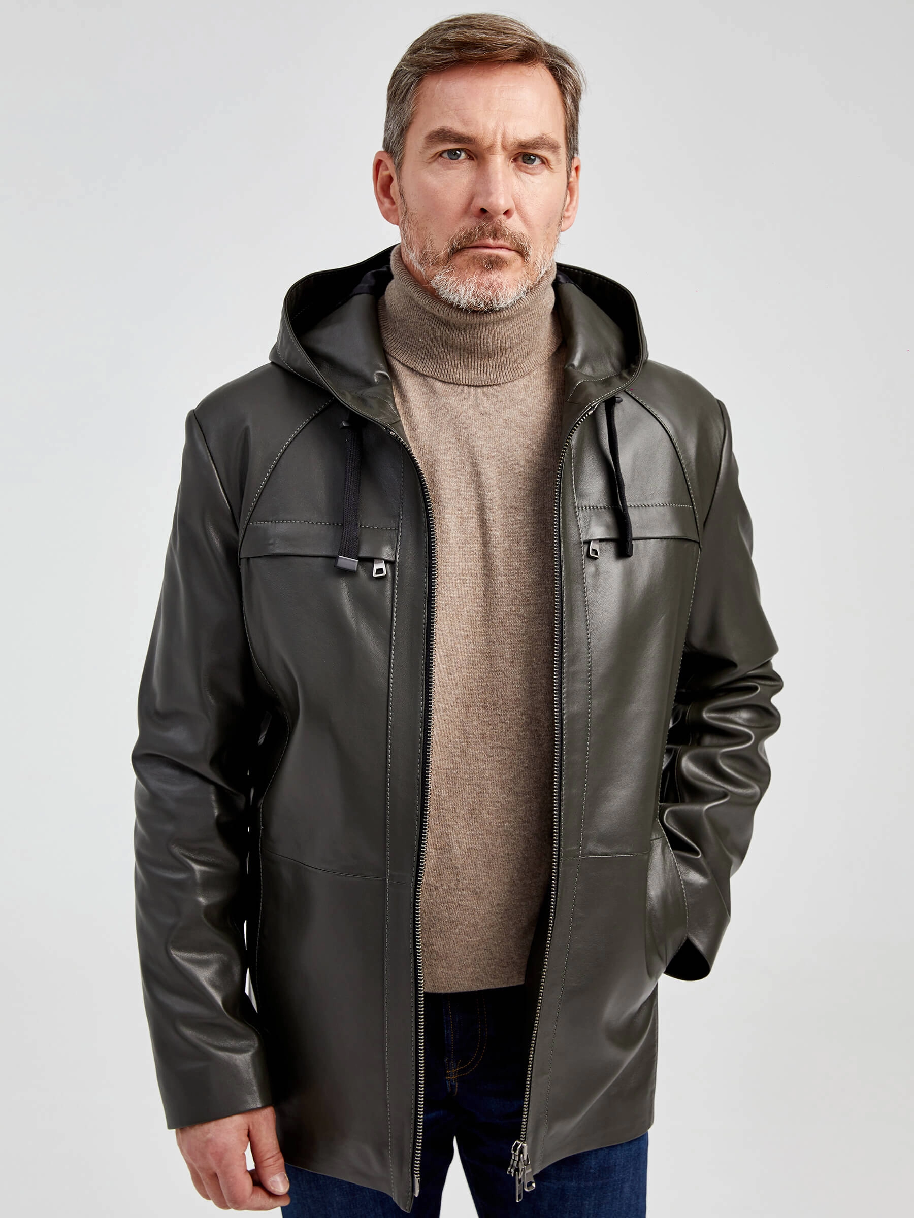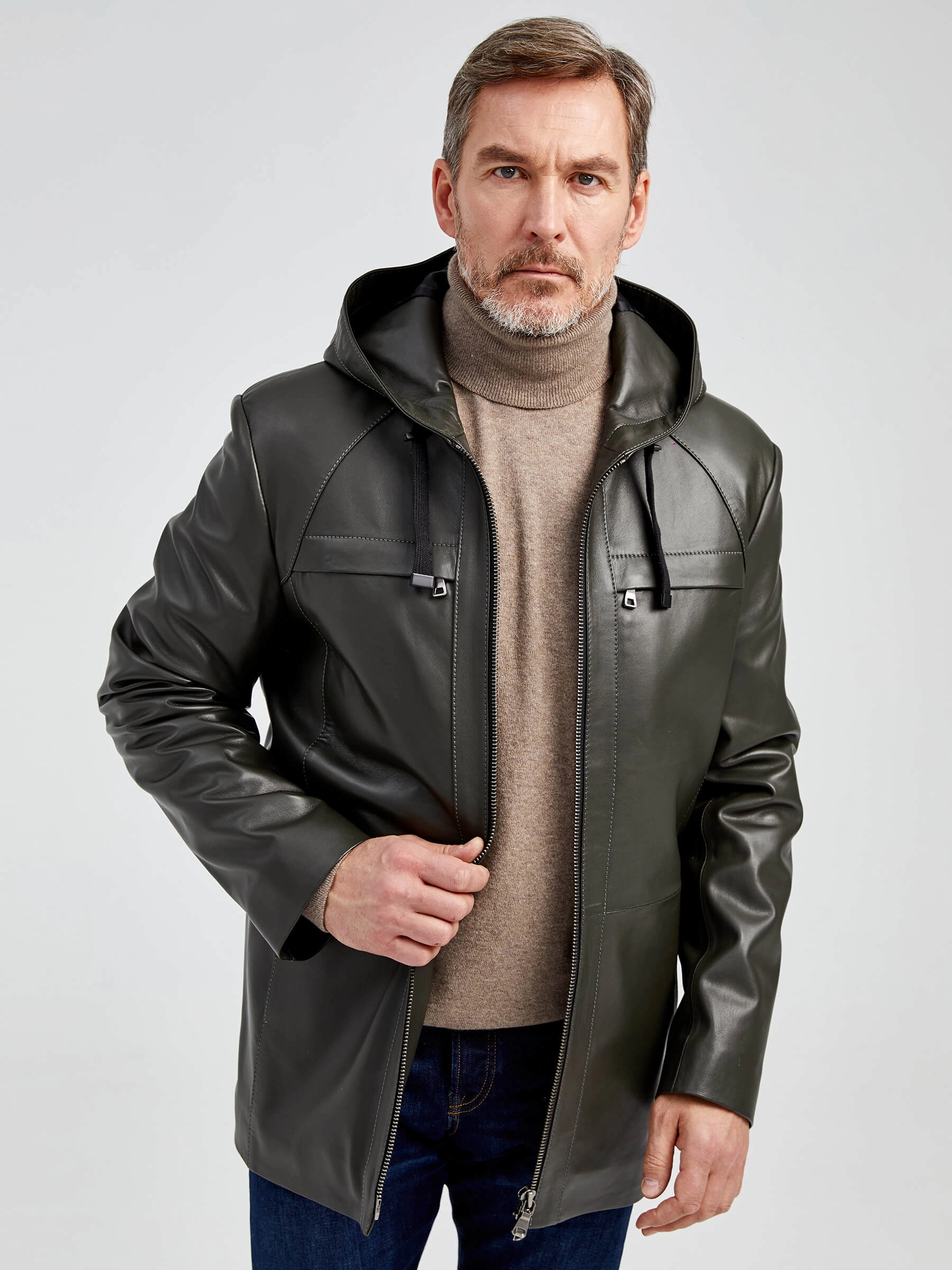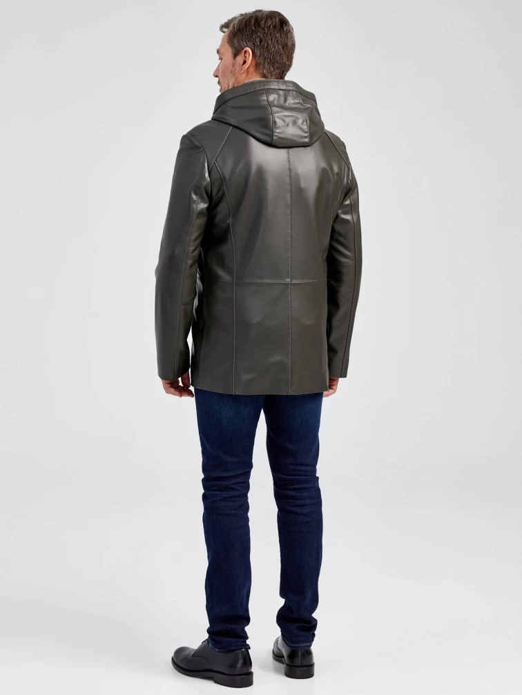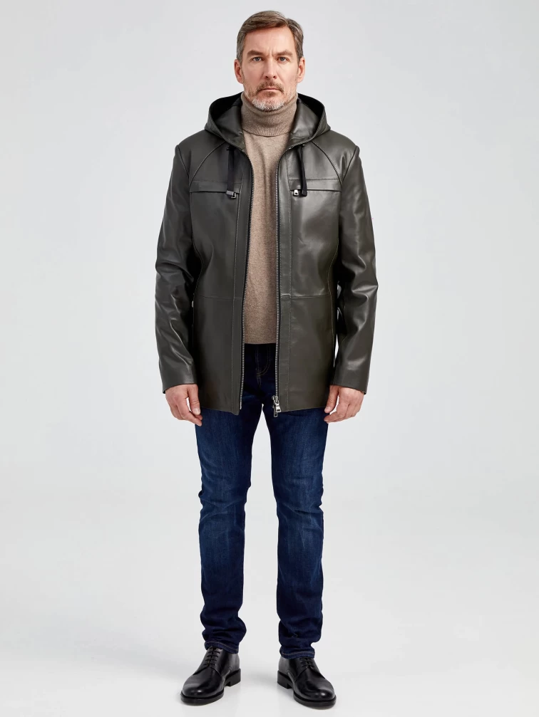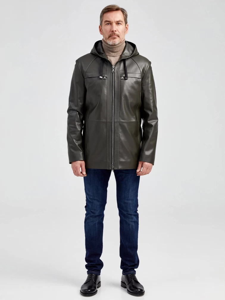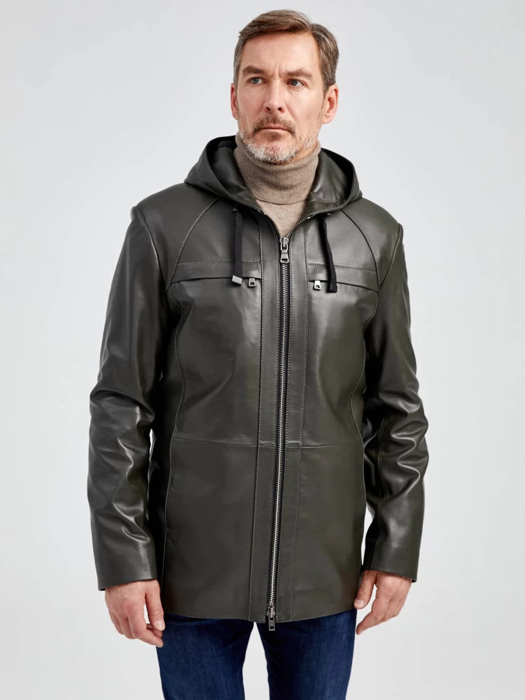 Удлиненная мужская кожаная куртка с капюшоном премиум класса 552, оливковая, размер 48, артикул 28941