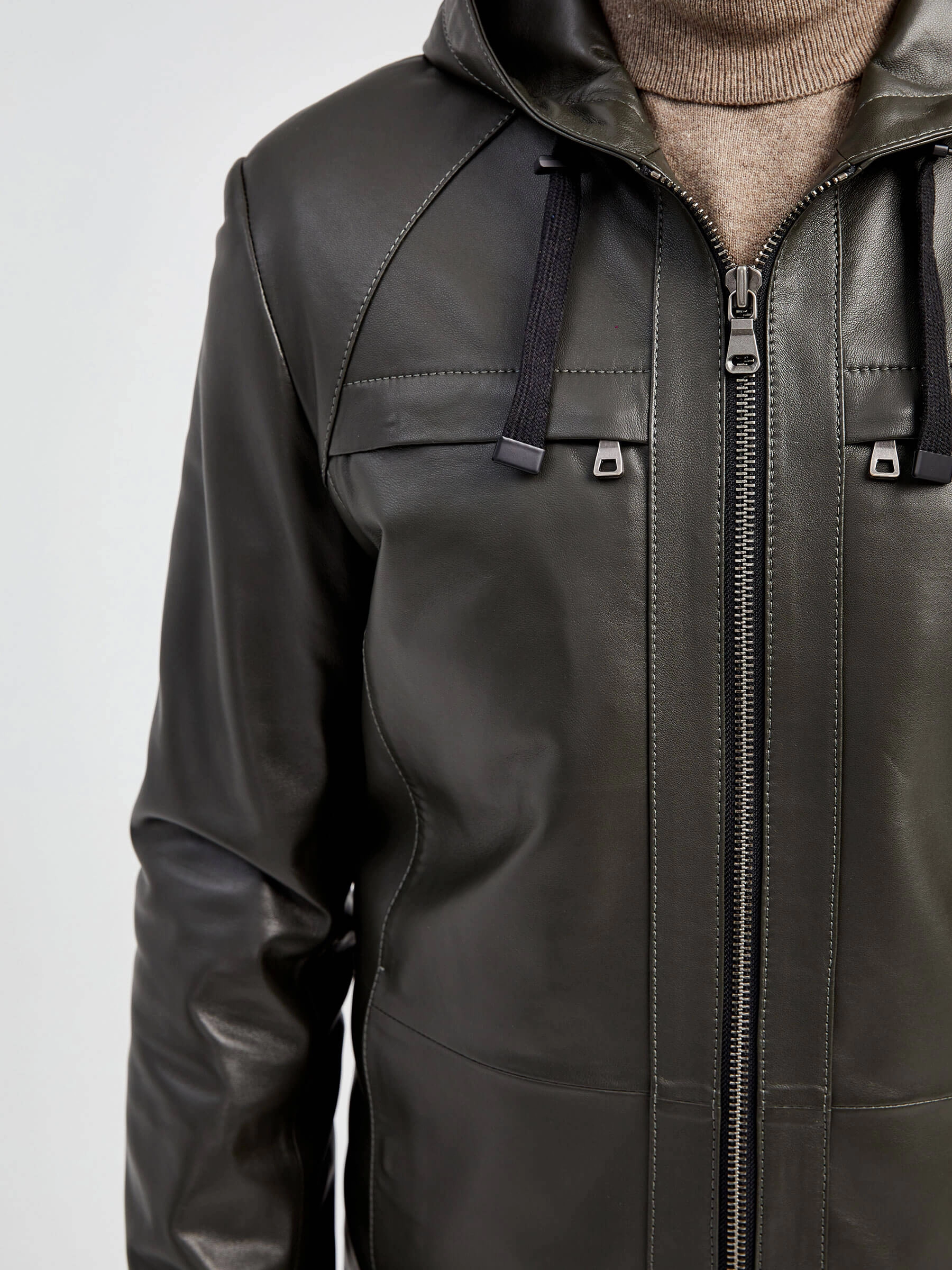 Кожаная куртка в спортивном стиле с капюшоном. Премиальное качество. Объём капюшона регулируется кулисами. Нагрудные карманы на молниях прикрыты клапанами. Дизайнеры PRIMO VELLO выбрали для этой модели великолепно отполированную кожу с благородным матовым блеском. Высочайший уровень качества подчёркивают безупречная работа портных и комфортная посадка по фигуре.