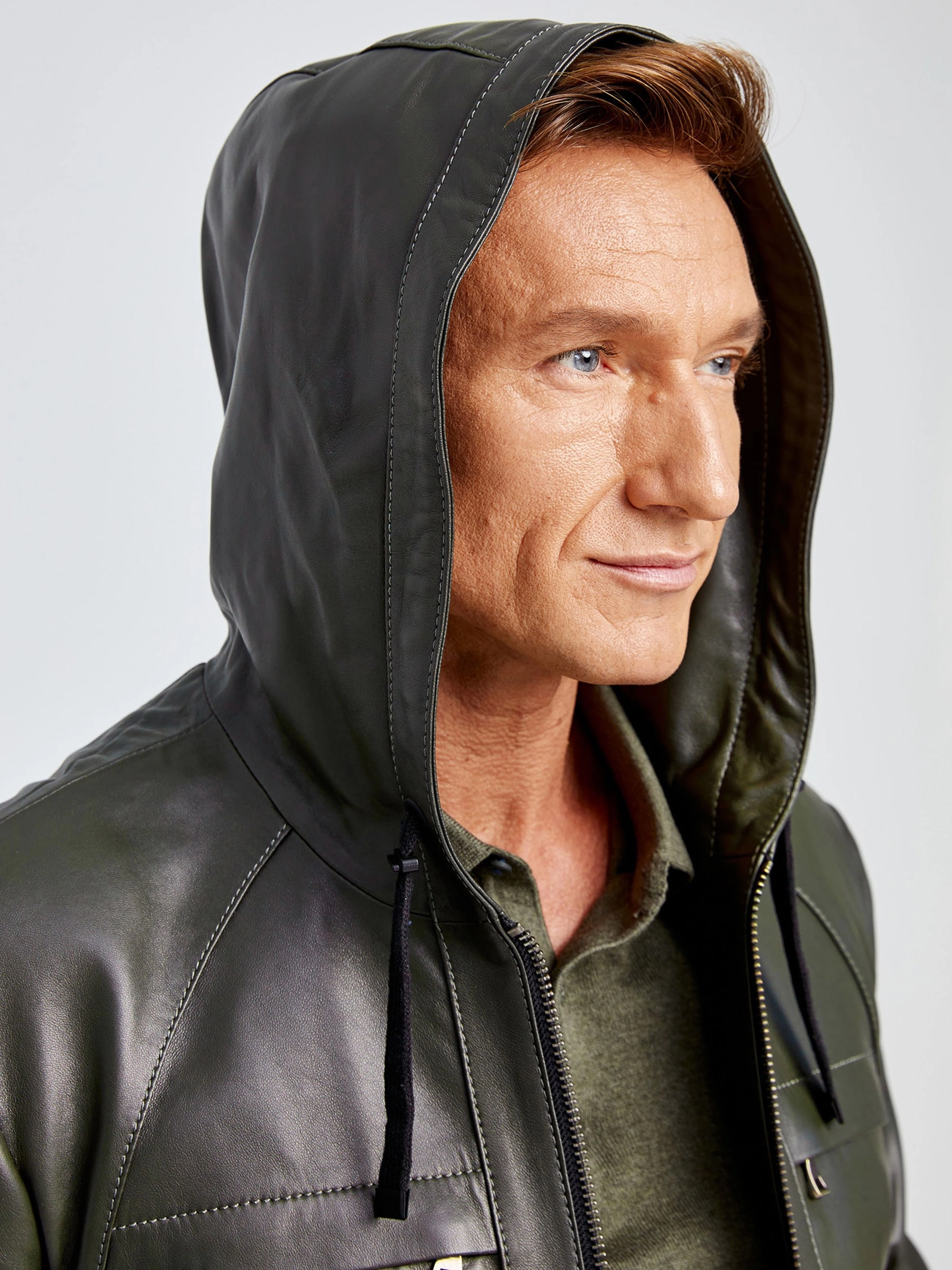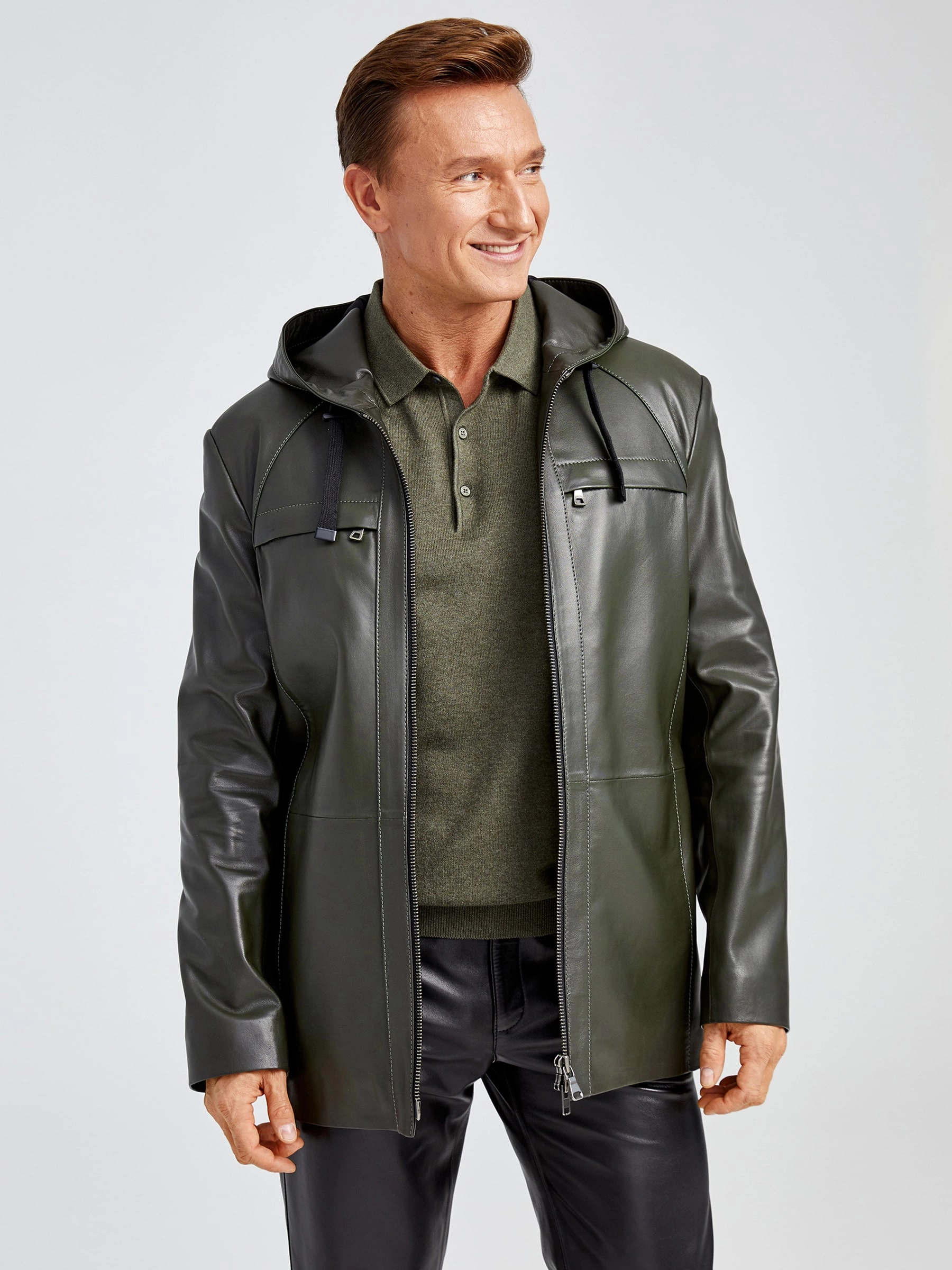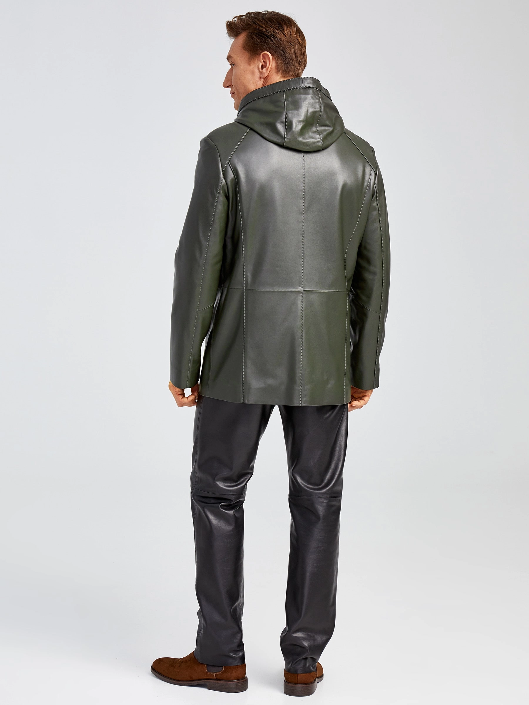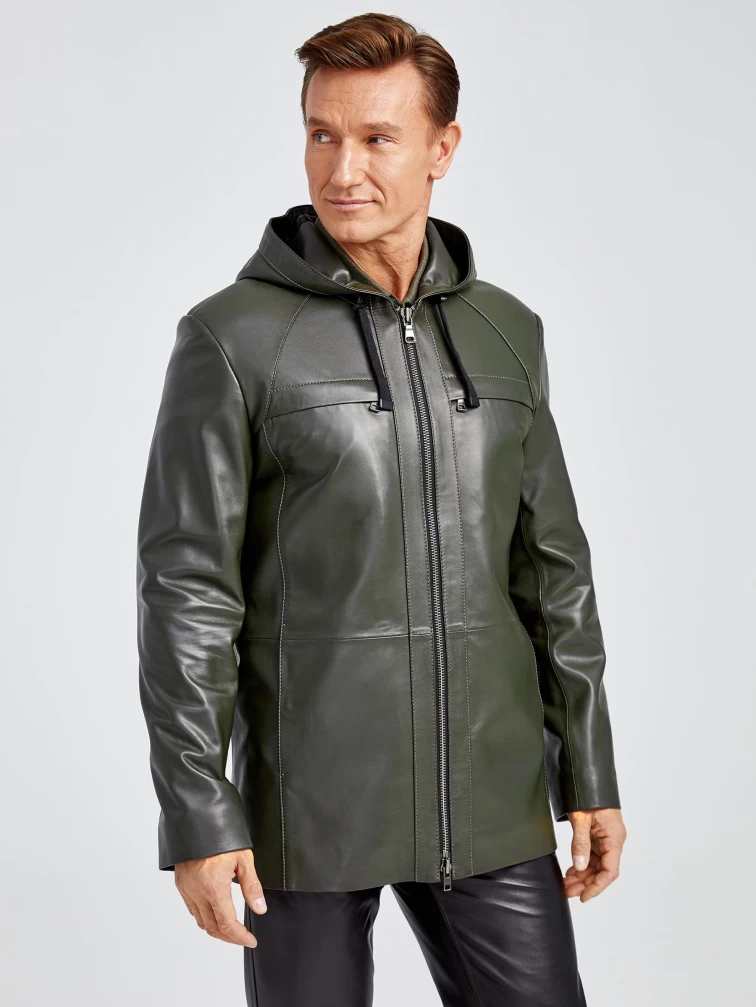 Удлиненная мужская кожаная куртка с капюшоном премиум класса 552, оливковая, размер 48, артикул 28892
