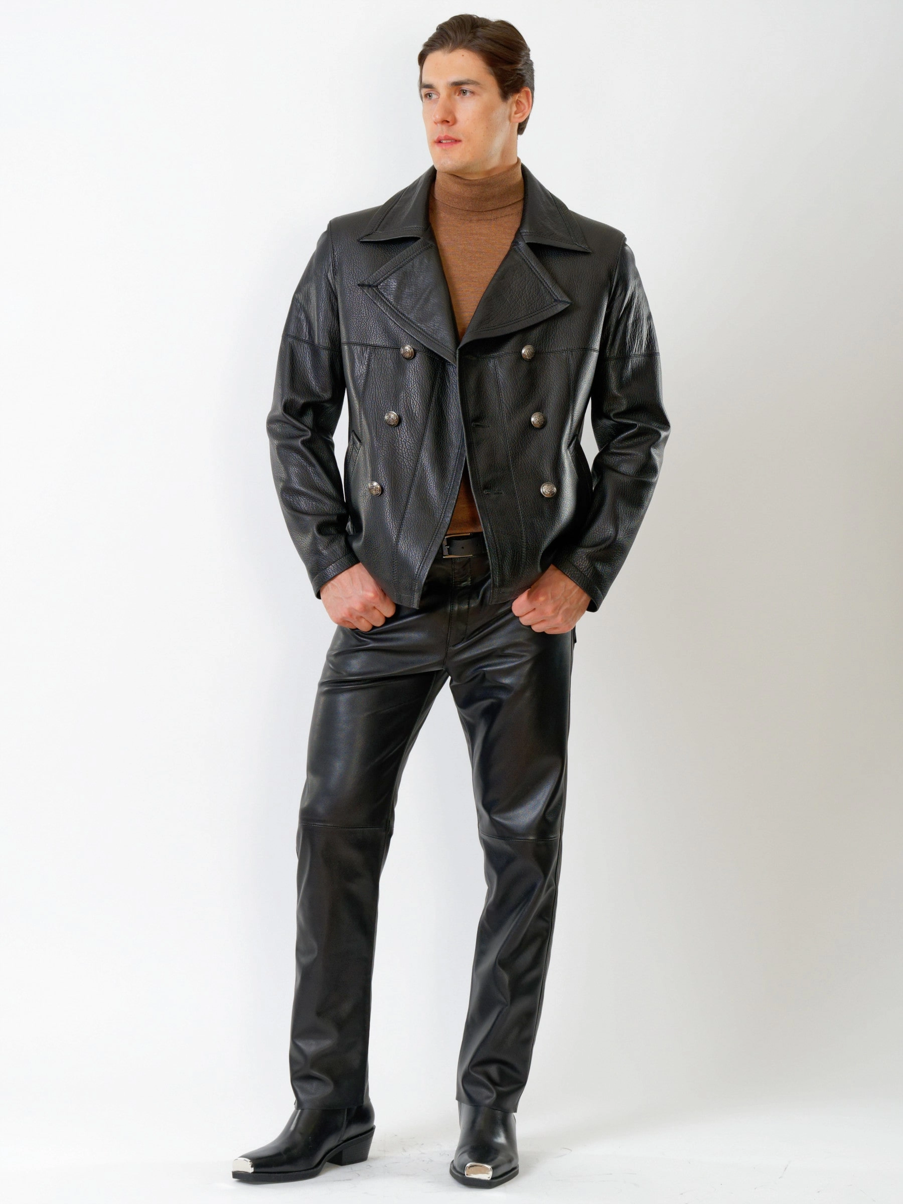 Двубортная кожаная куртка великолепна в сочетании с кожаными брюками. Кожа премиального качества. Безупречная работа портных. Комфортная посадка по фигуре.