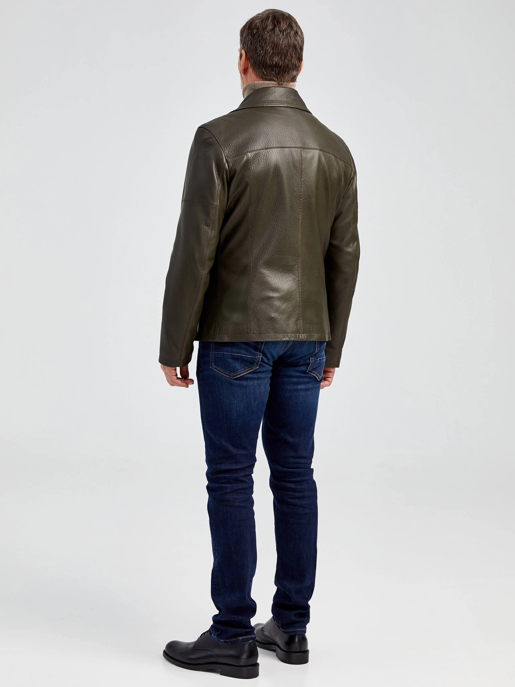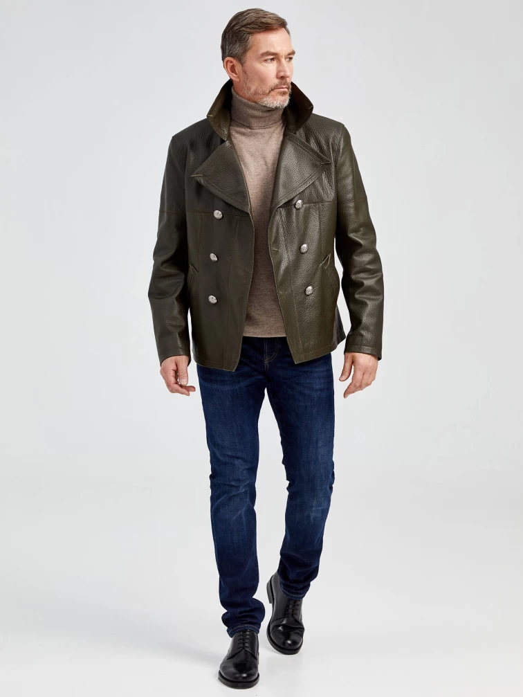 Двубортная мужская кожаная куртка Клуб, оливковая, размер 48, артикул 28972