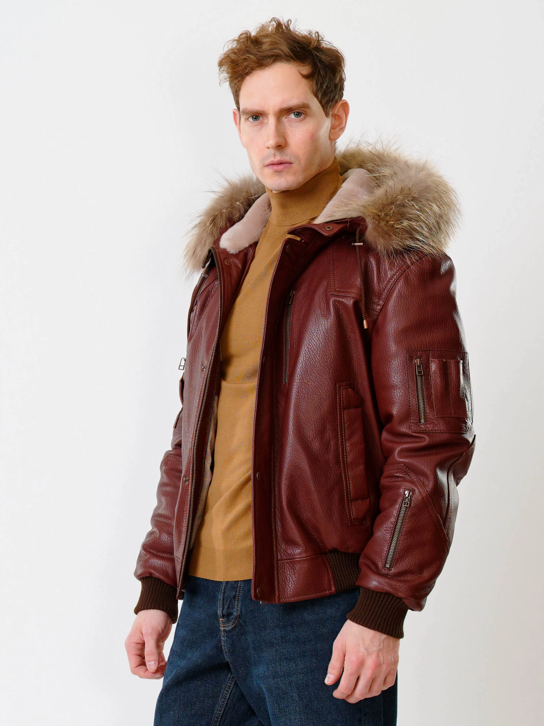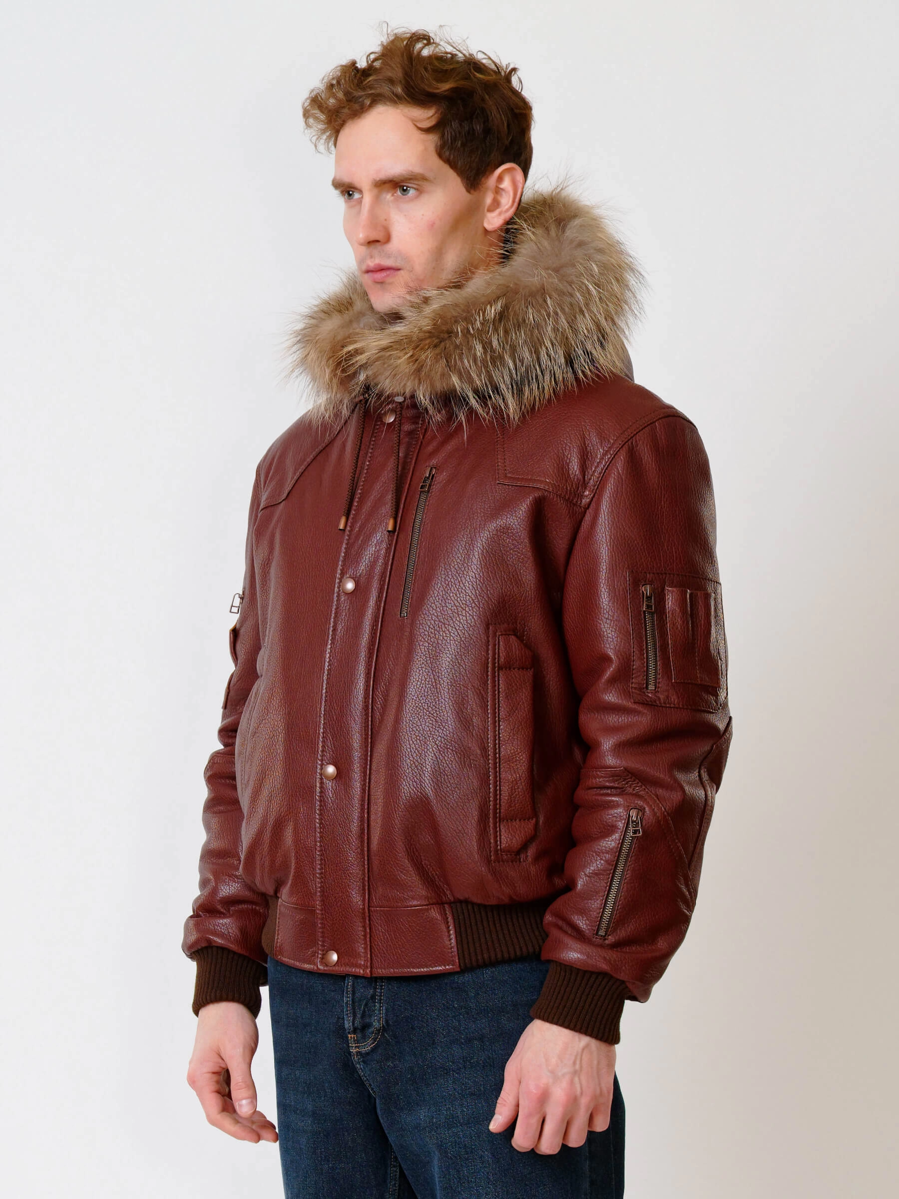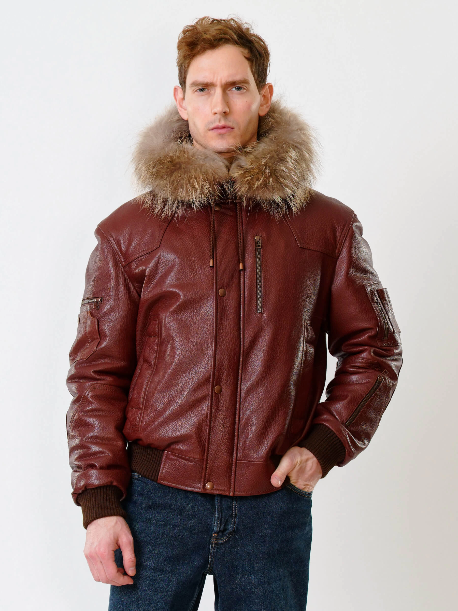 Укороченный вариант куртки «Аляска» в современной интерпретации. Кожа высшего качества. Современный утеплитель. Удобный капюшон. Напульсники рукавов и низ модели из трикотажной резинки. Тонкорунная овчина внутри капюшона. Опушь капюшона из меха енота. Множество наружных и внутренних карманов. Свободный крой обеспечивает комфортную посадку по фигуре. Куртка очень удобна за рулём.