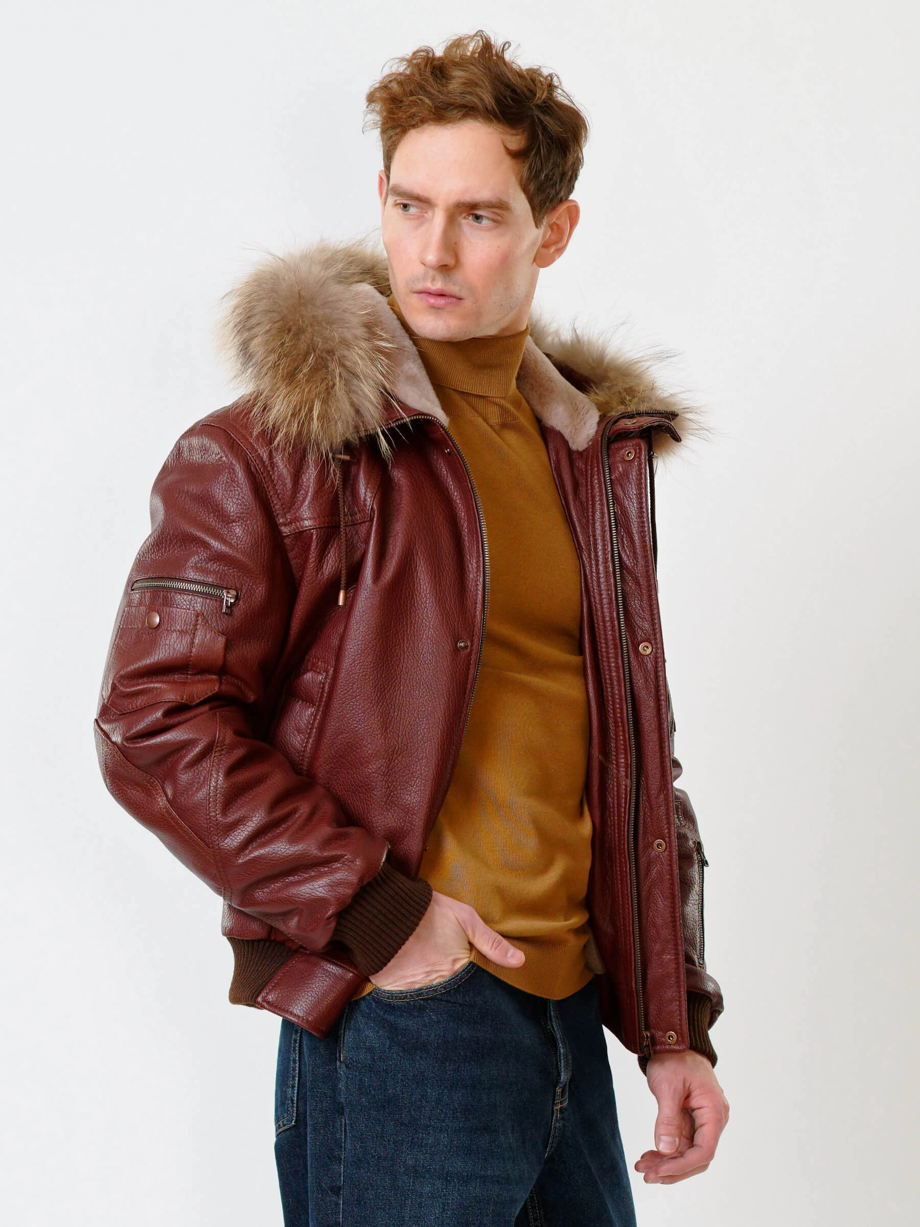 Товар кожаная мужская куртка аляска утепленная с мехом енота 509, виски, размер 48, артикул 40190 выполнен из натуральной кожи с застежкой молния. Рассчитан на сезон: осень-зима. Длина изделия 68 см, силуэт свободный.