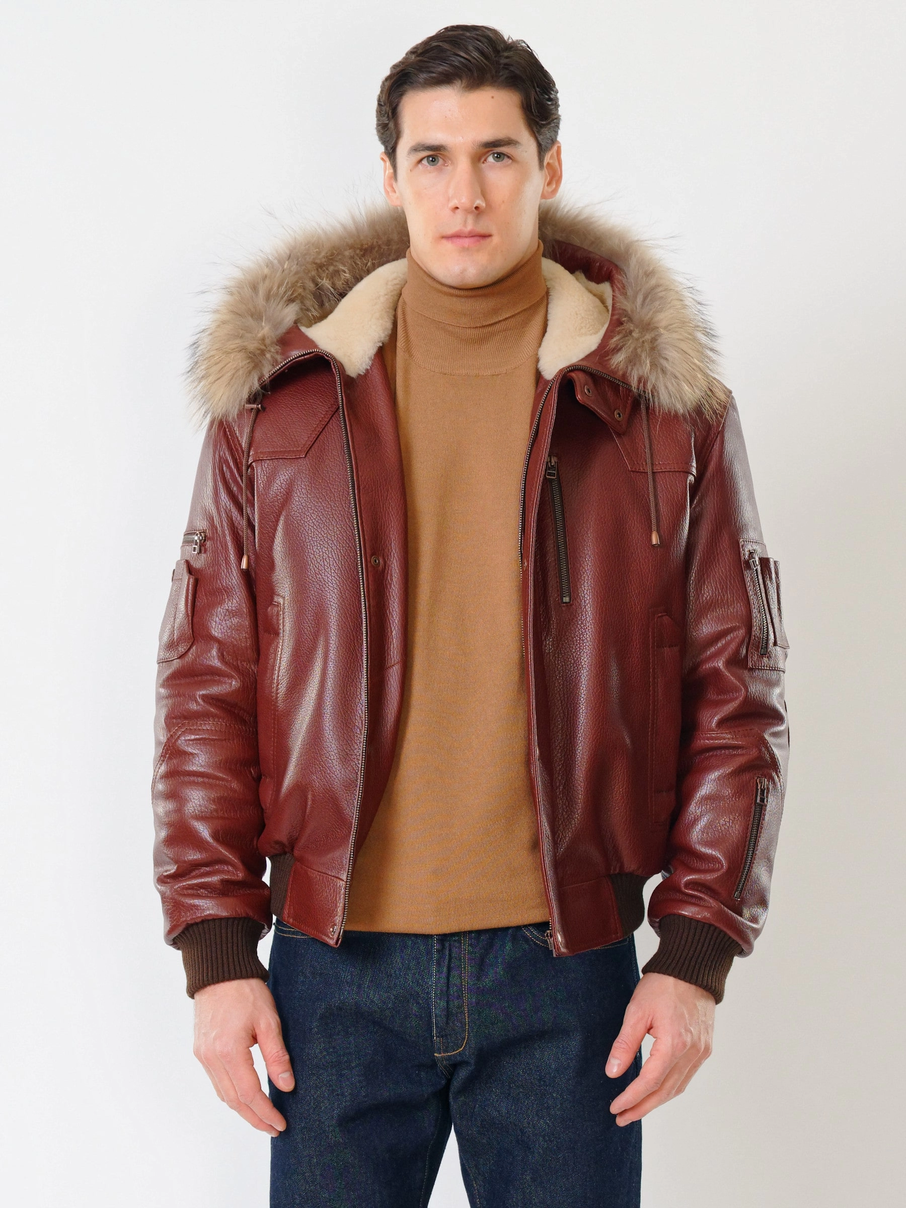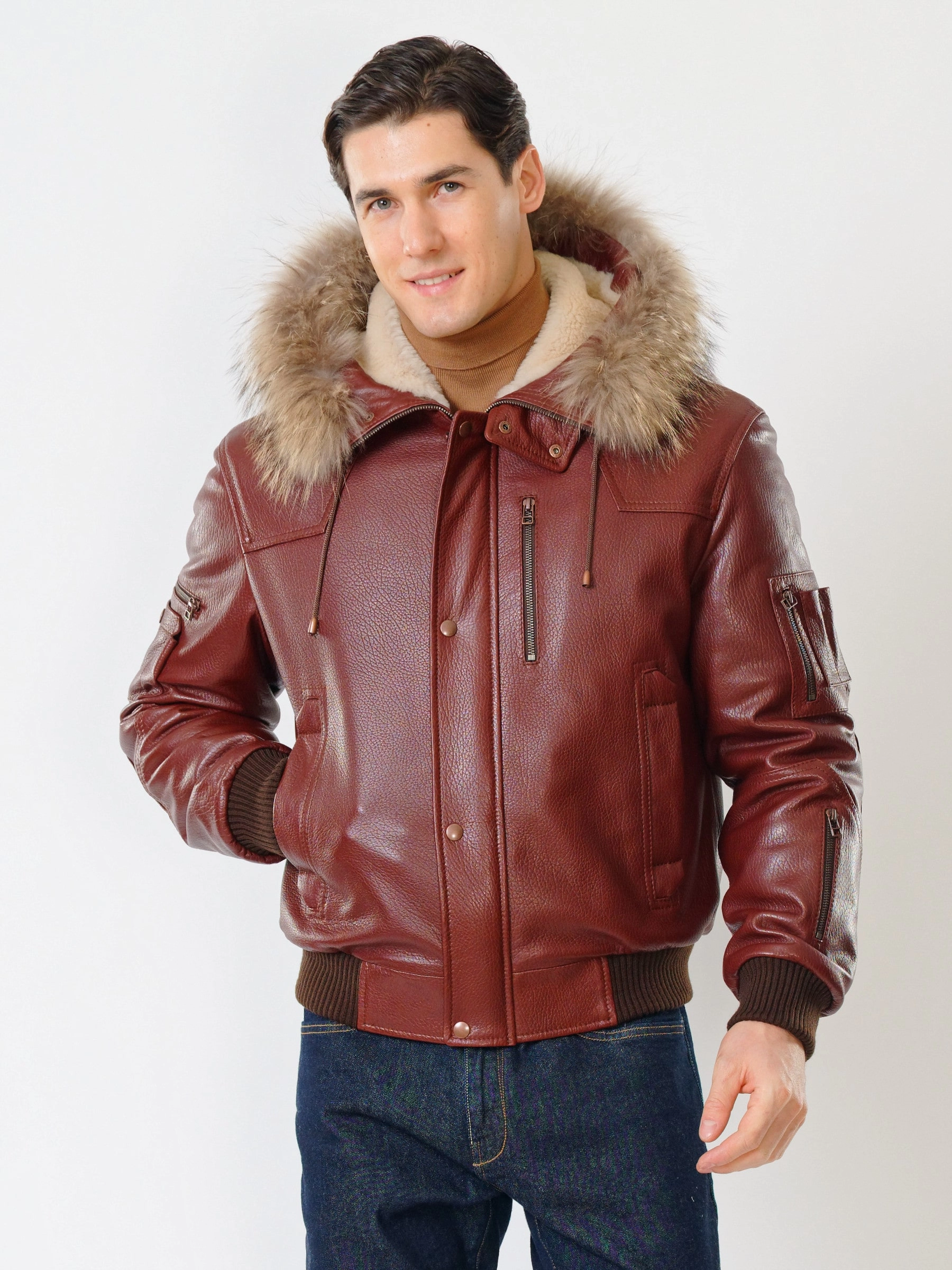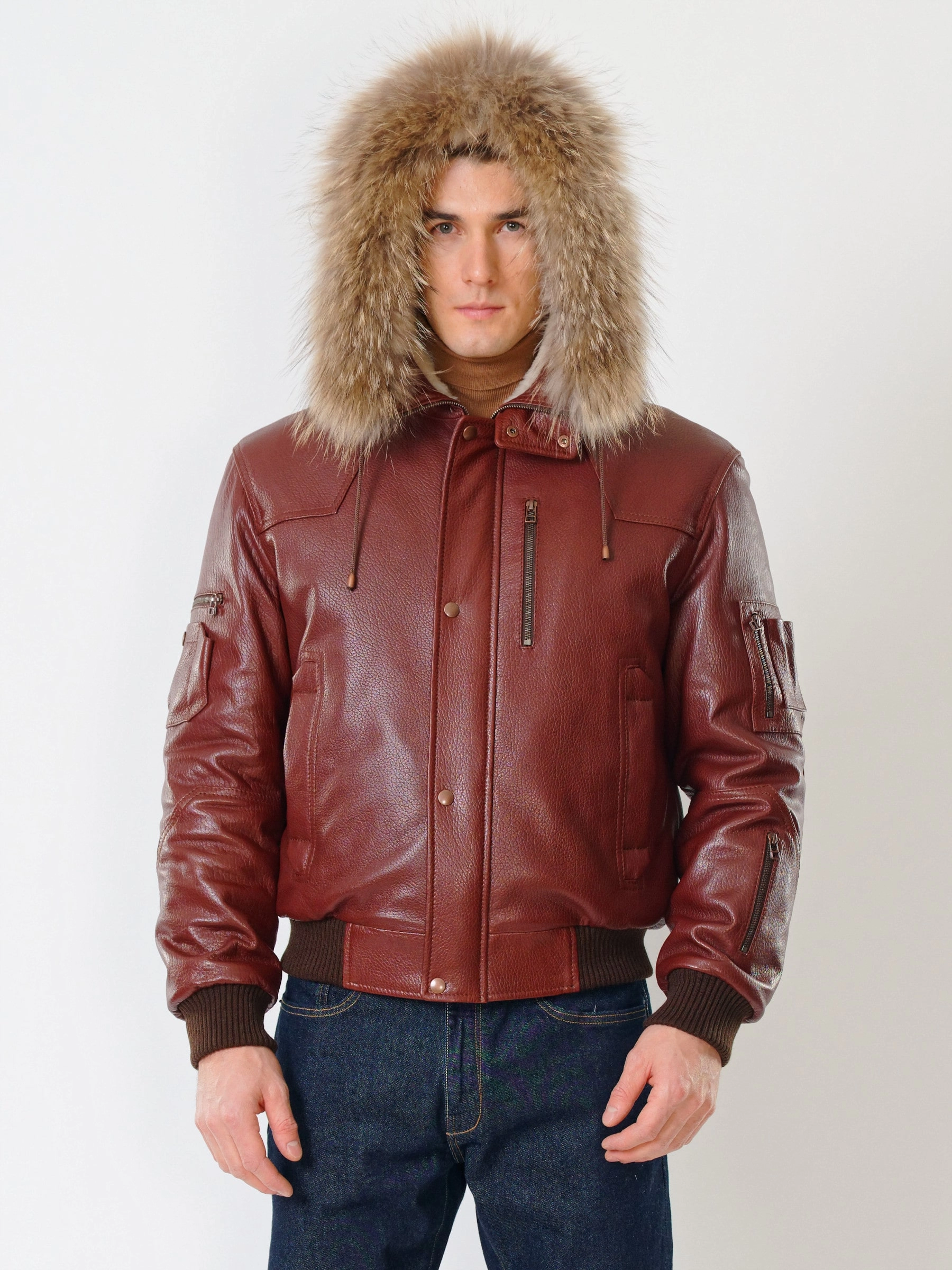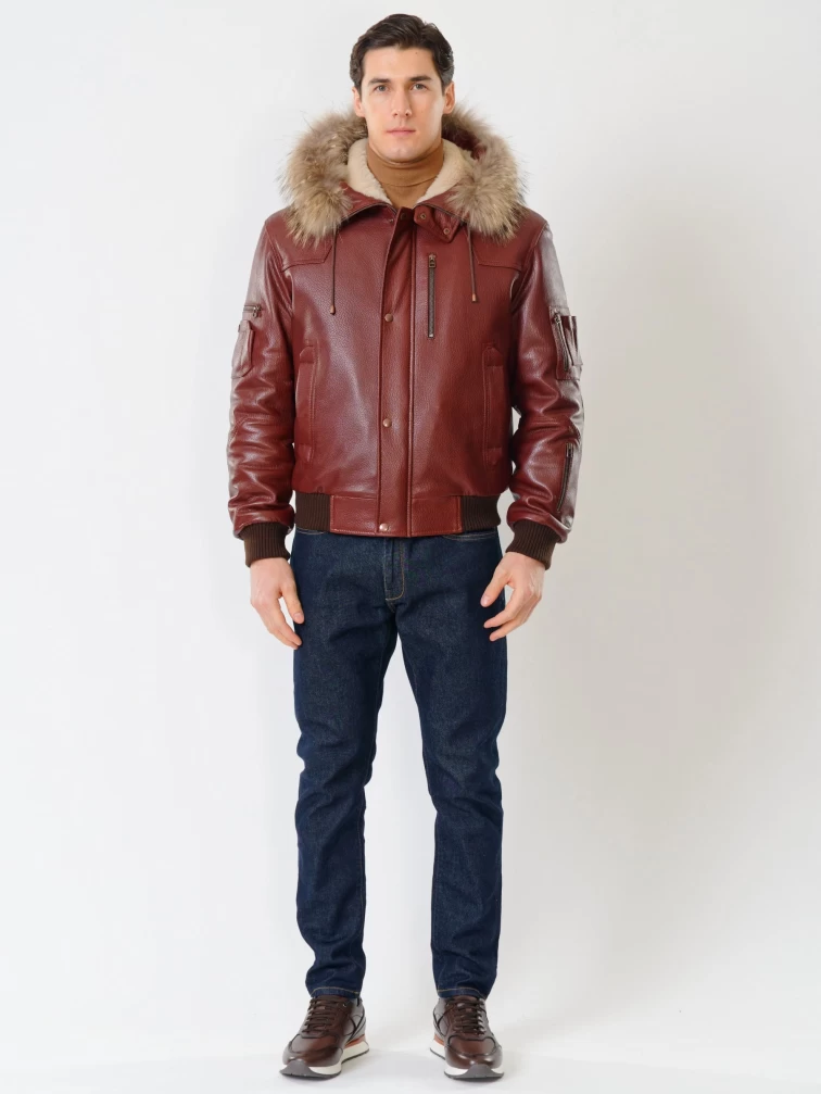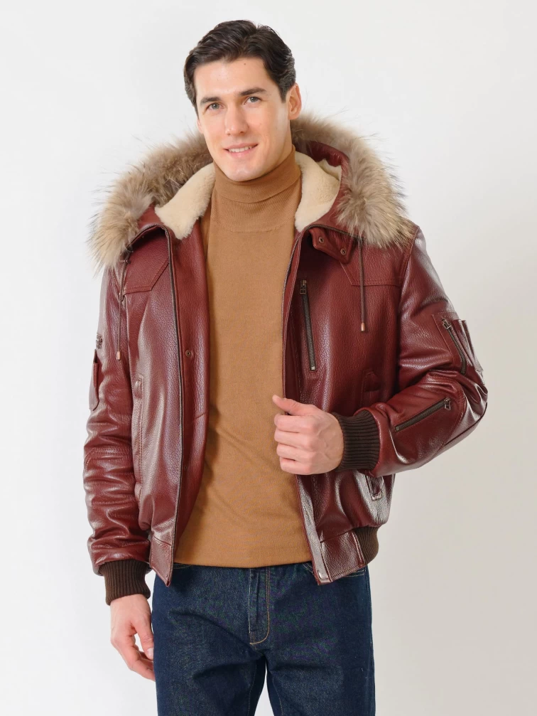Кожаная мужская куртка аляска утепленная с мехом енота 509, виски, размер 48, артикул 40251
