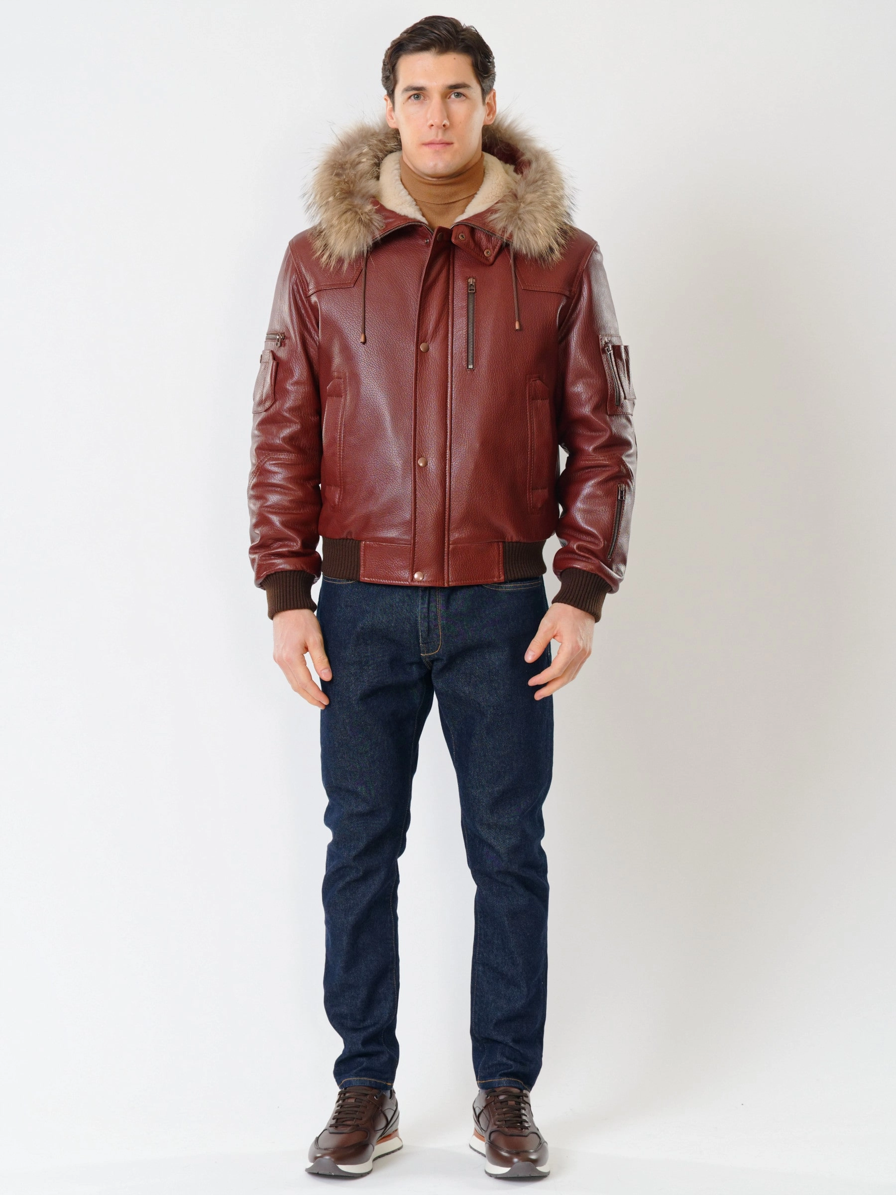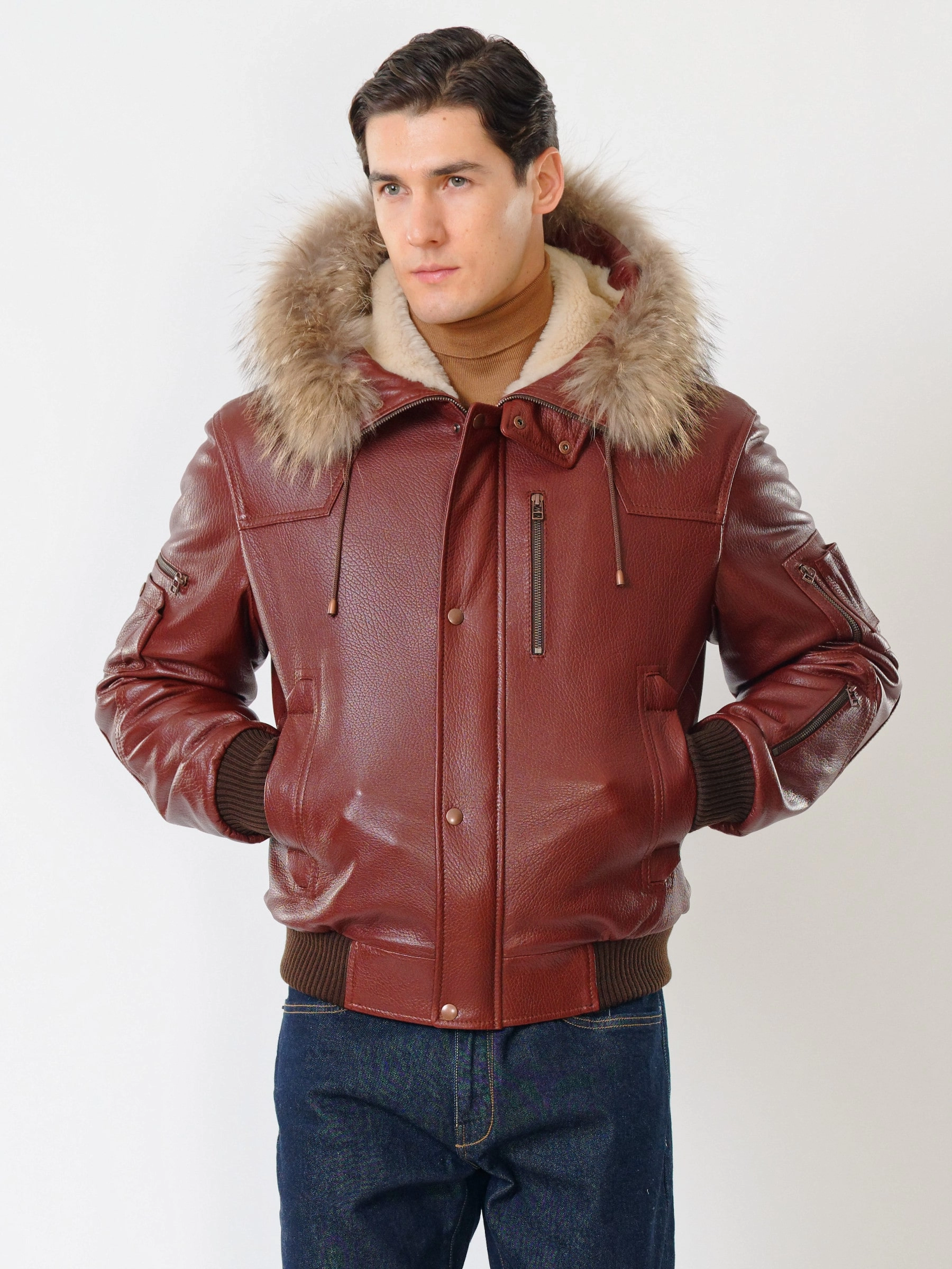 Товар кожаная мужская куртка аляска утепленная с мехом енота 509, виски, размер 48, артикул 40251 выполнен из натуральной кожи с застежкой молния. Рассчитан на сезон: осень-зима. Длина изделия 68 см, силуэт свободный.