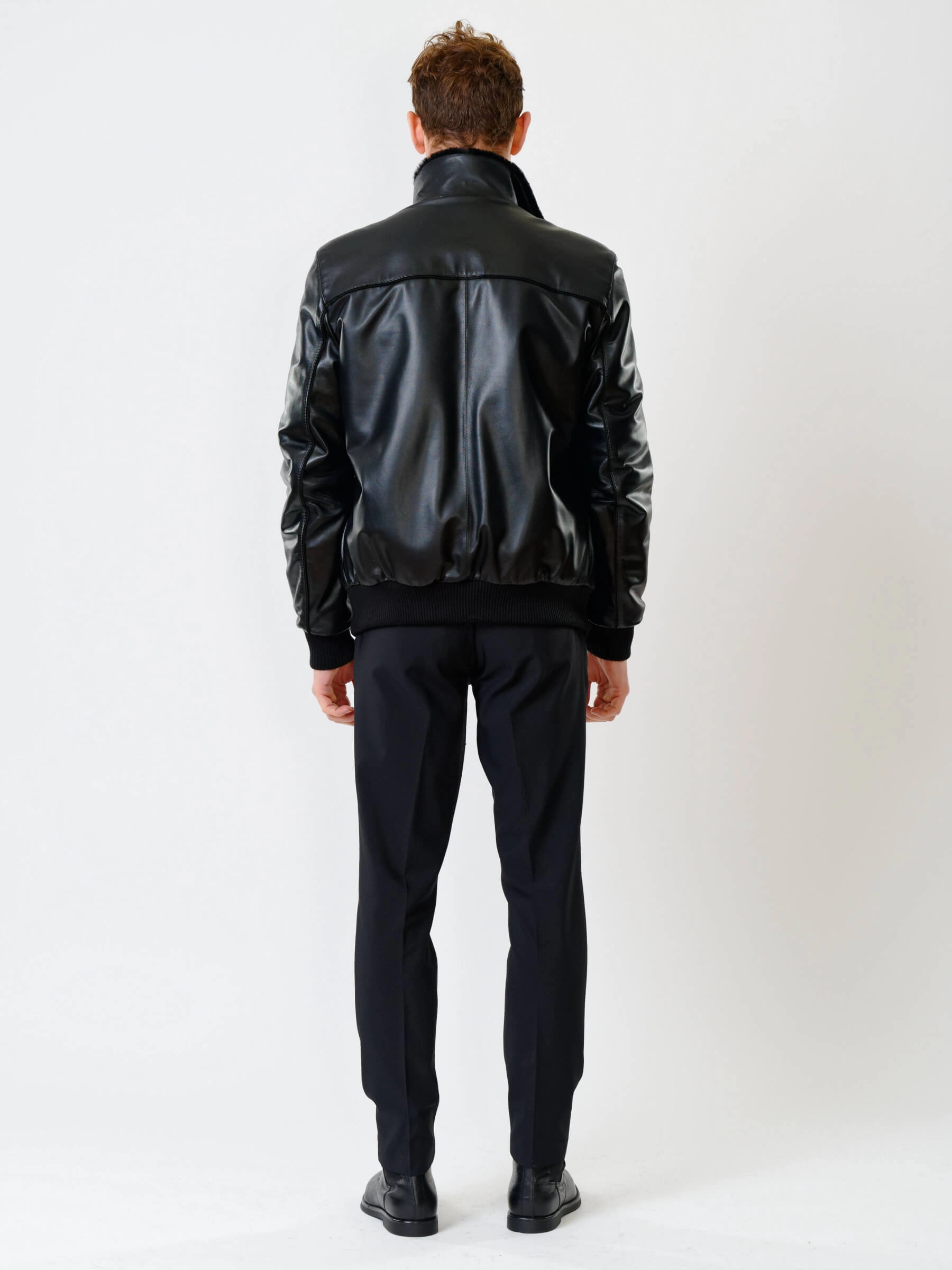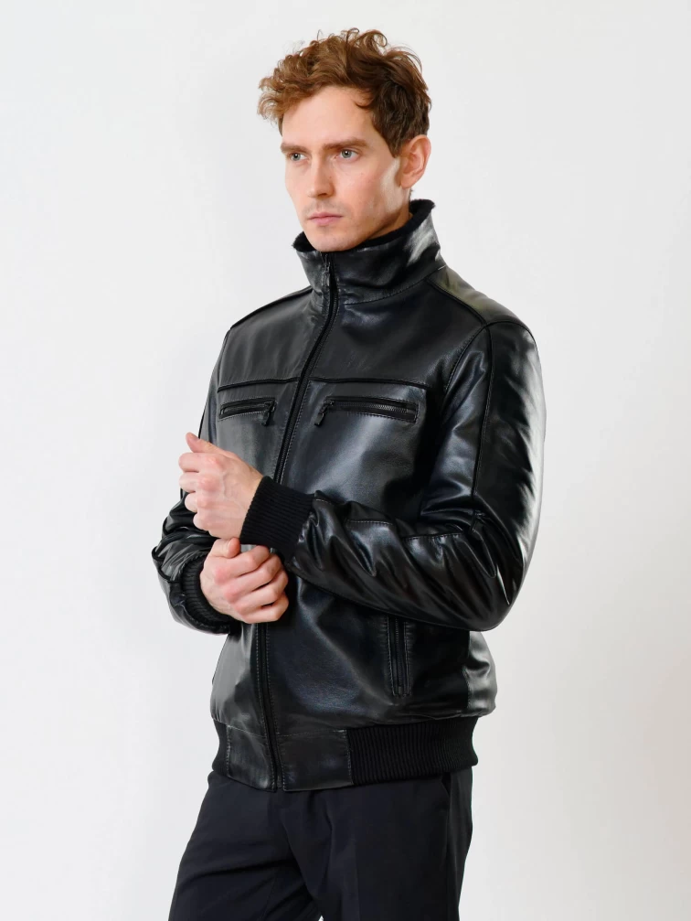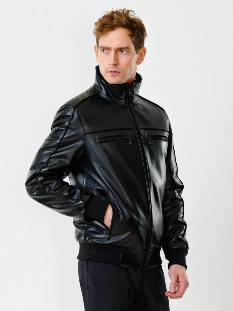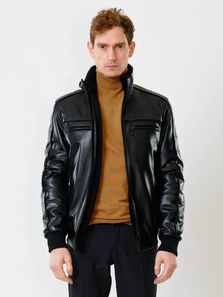 Короткая кожаная мужская дубленка бомбер 515, черная, размер 50, артикул 40200