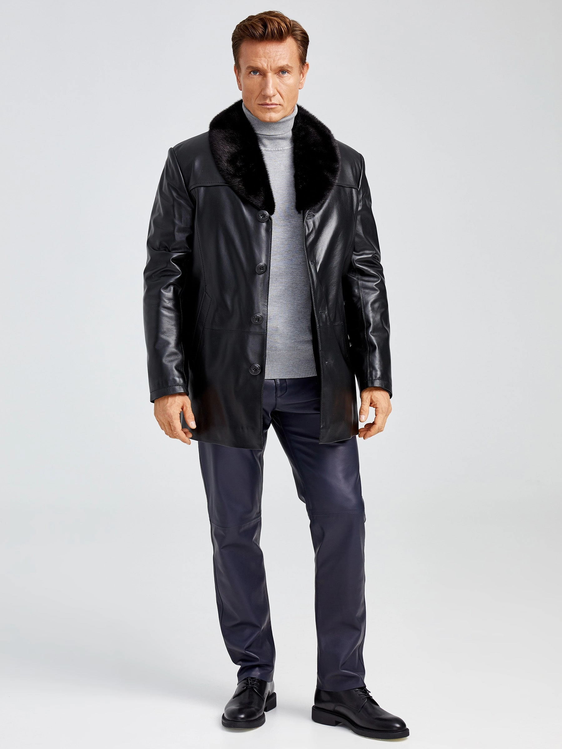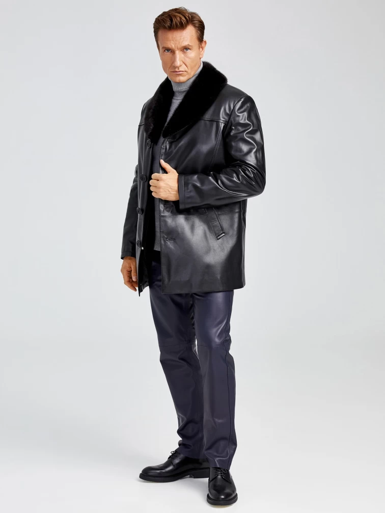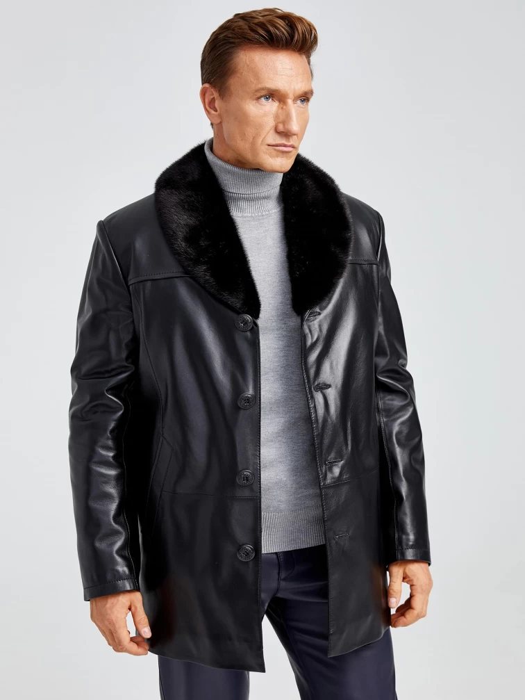 Мужская зимняя кожаная куртка с норковым воротником премиум класса 534мех, черная, размер 58, артикул 40401