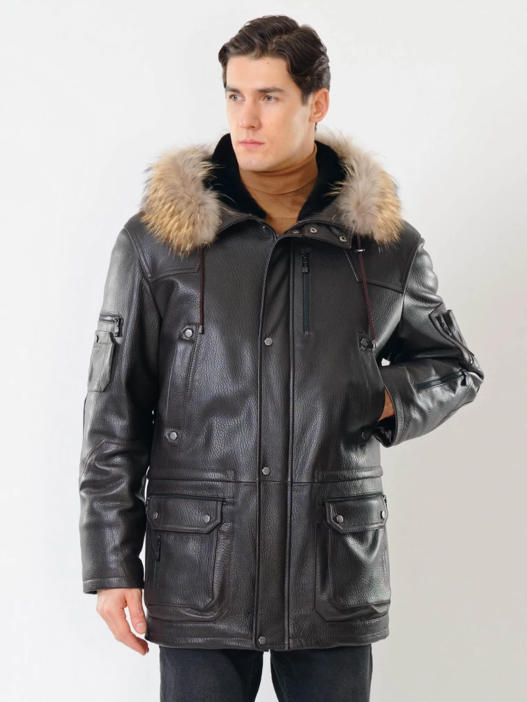 Утепленная мужская кожаная куртка аляска с мехом енота Алекс, коричневая, размер 52, артикул 40301