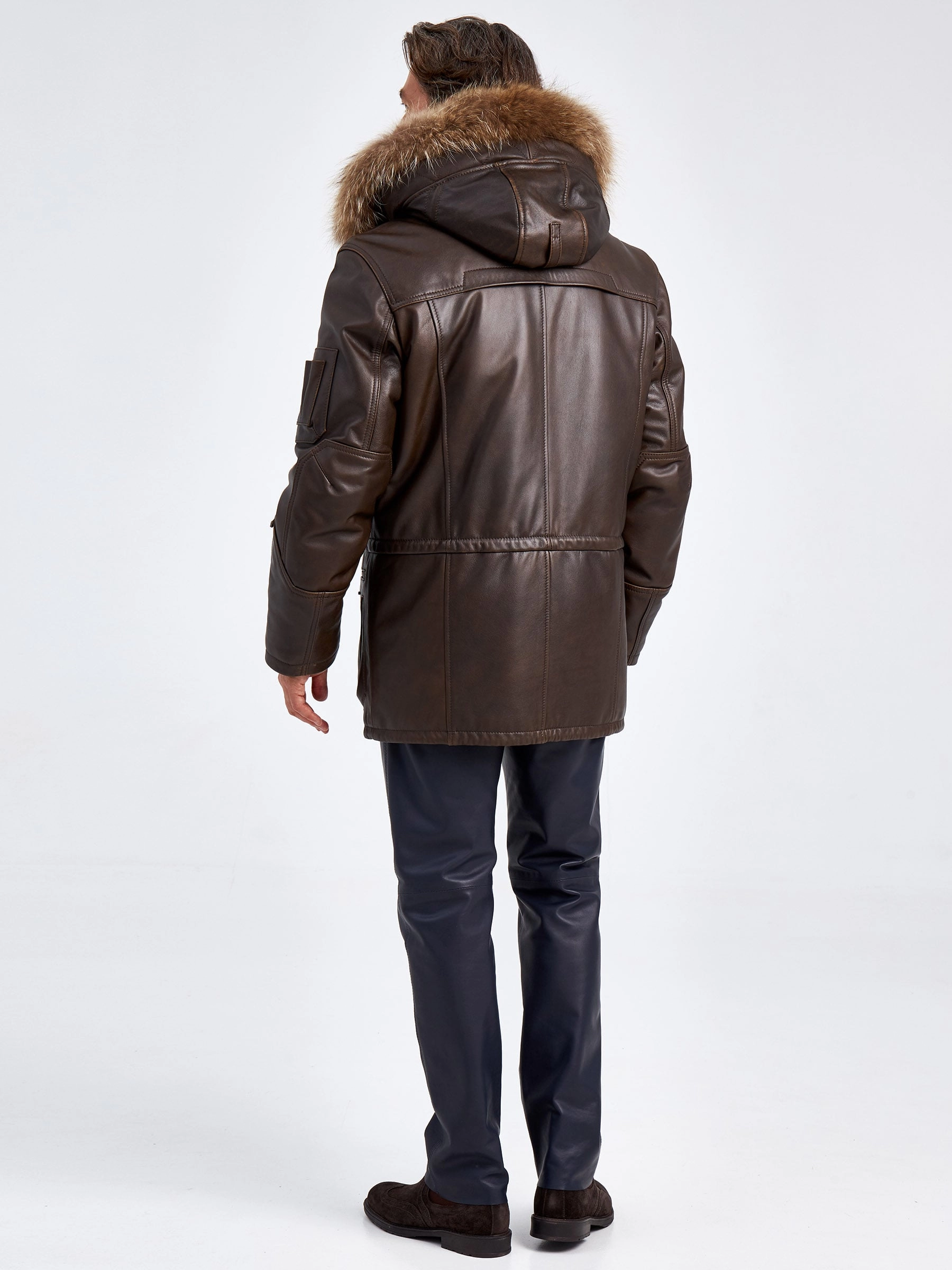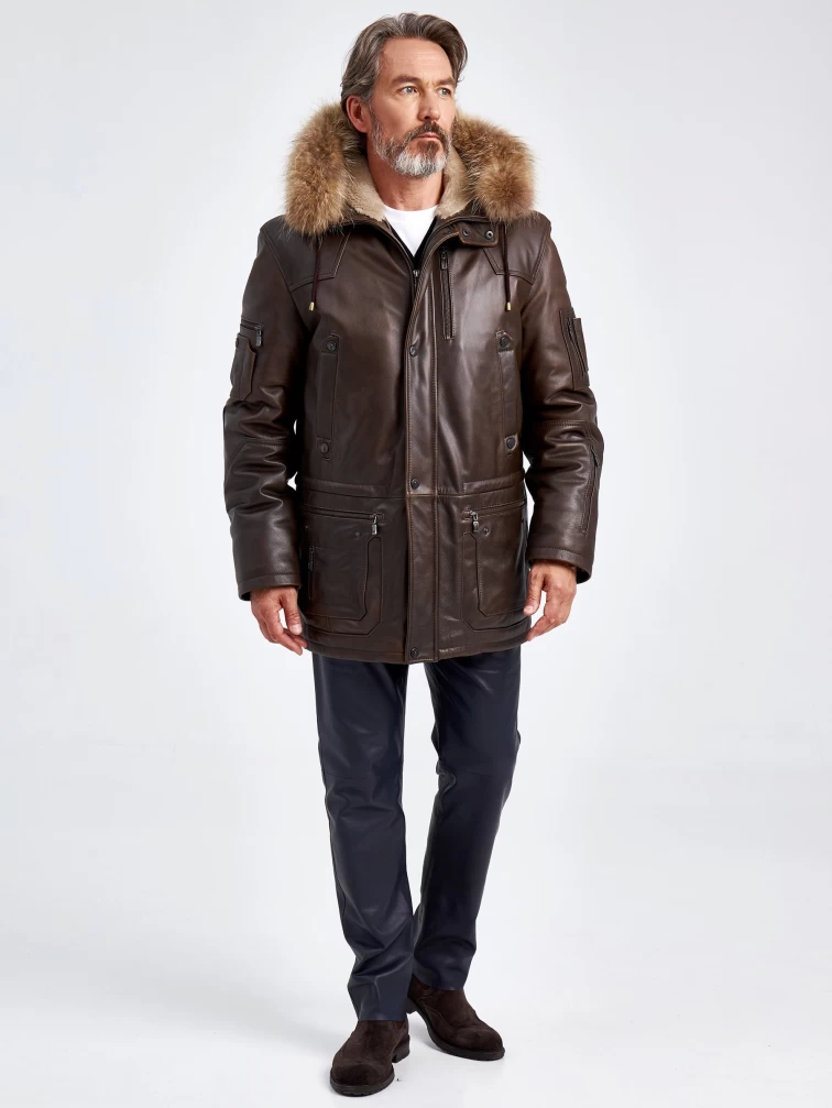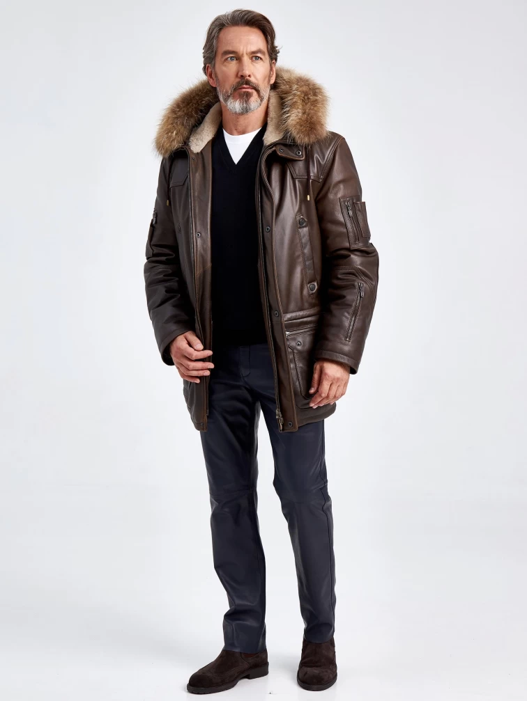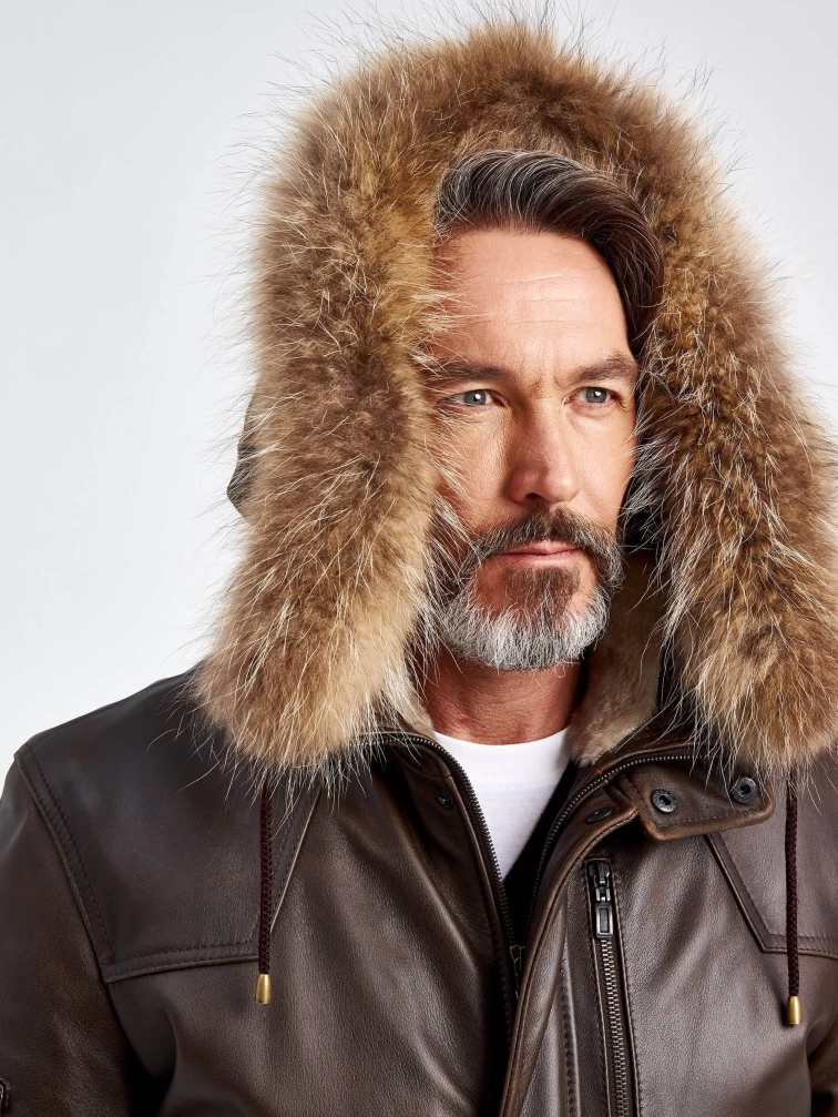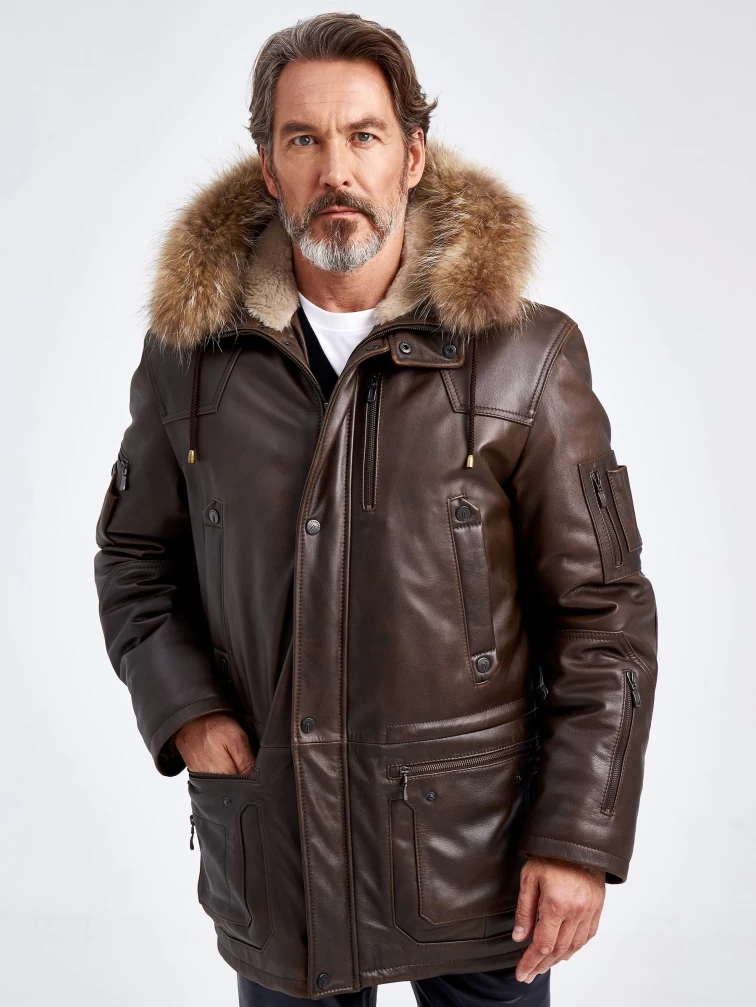 Утепленная мужская кожаная куртка аляска с мехом енота Алекс, темно-коричневая, размер 44, артикул 40721