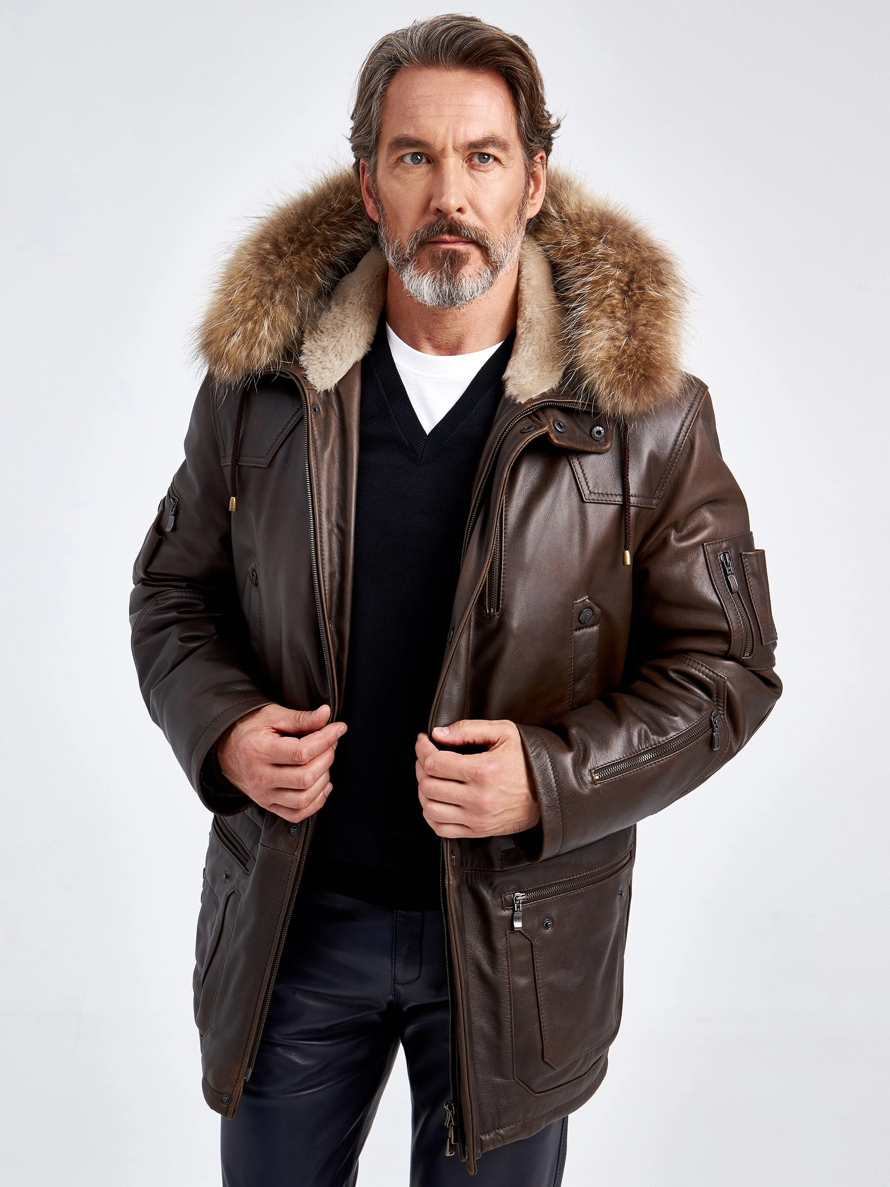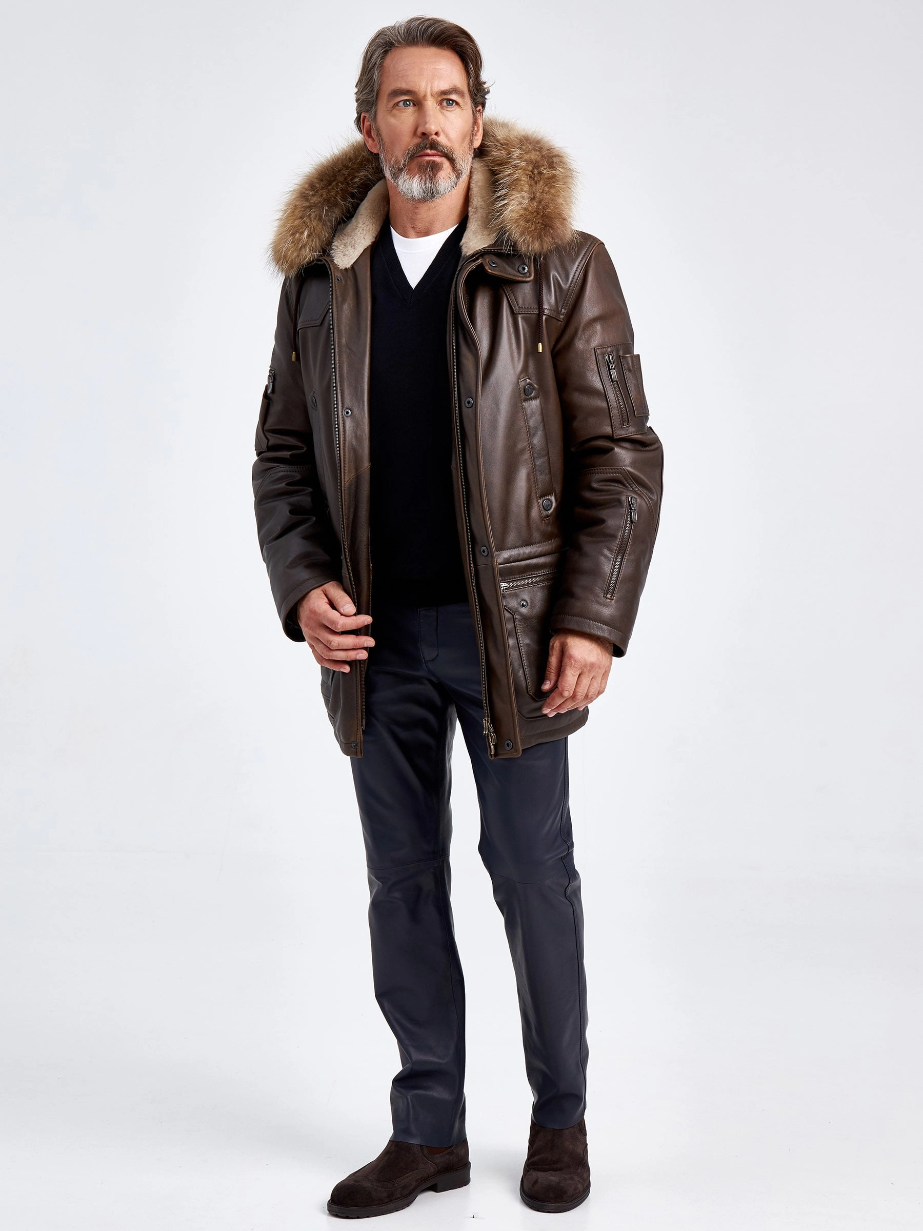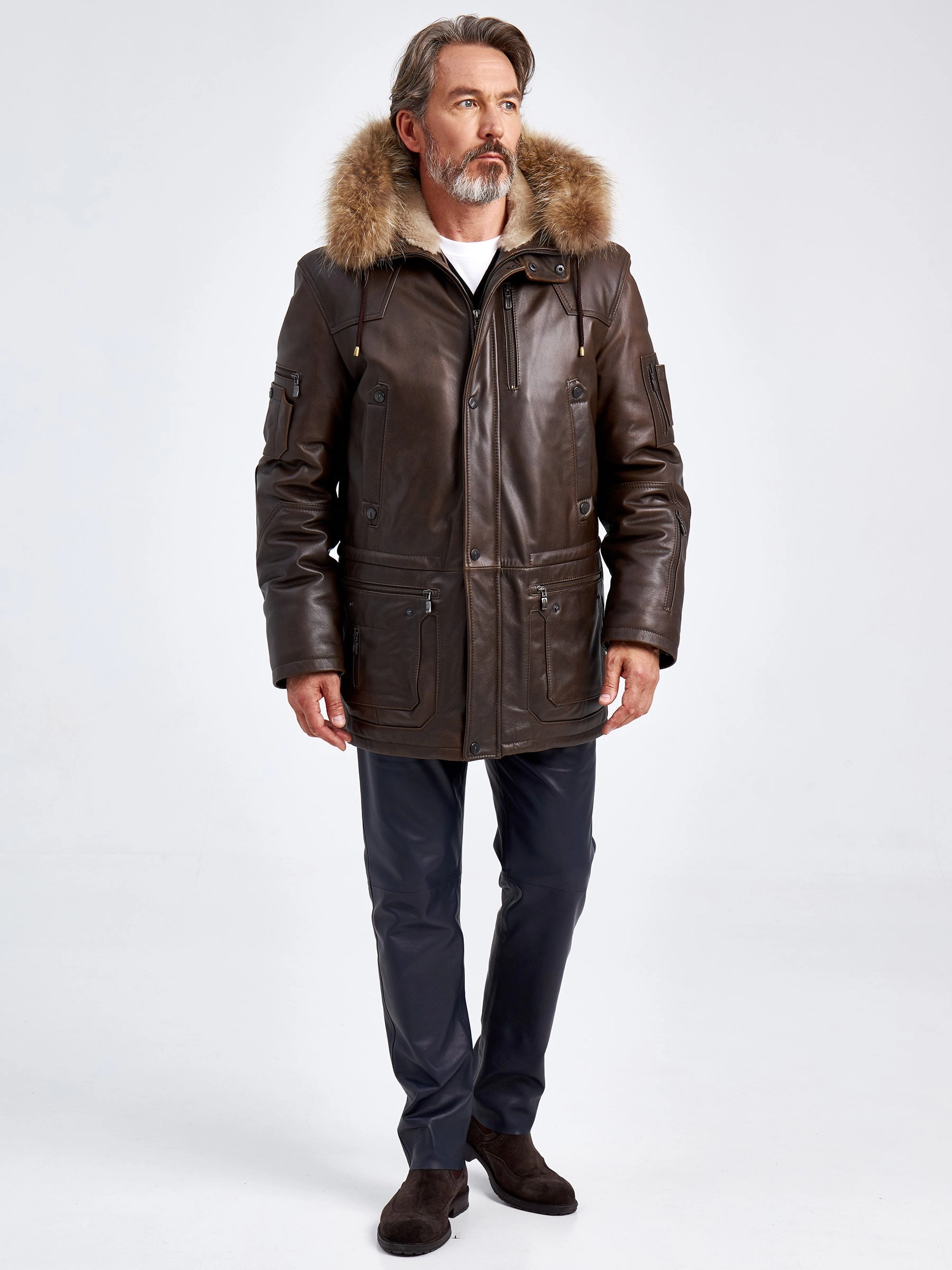 Куртка «Аляска» в современной интерпретации. Кожа высшего качества. Современный утеплитель. Удобный капюшон. Тонкорунная овчина внутри капюшона. Опушь капюшона из меха енота. Множество наружных и внутренних карманов. Свободный крой обеспечивает комфортную посадку по фигуре. Куртка очень удобна за рулём.