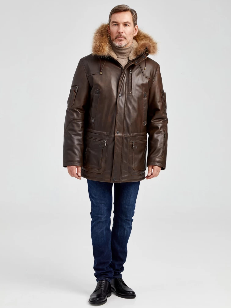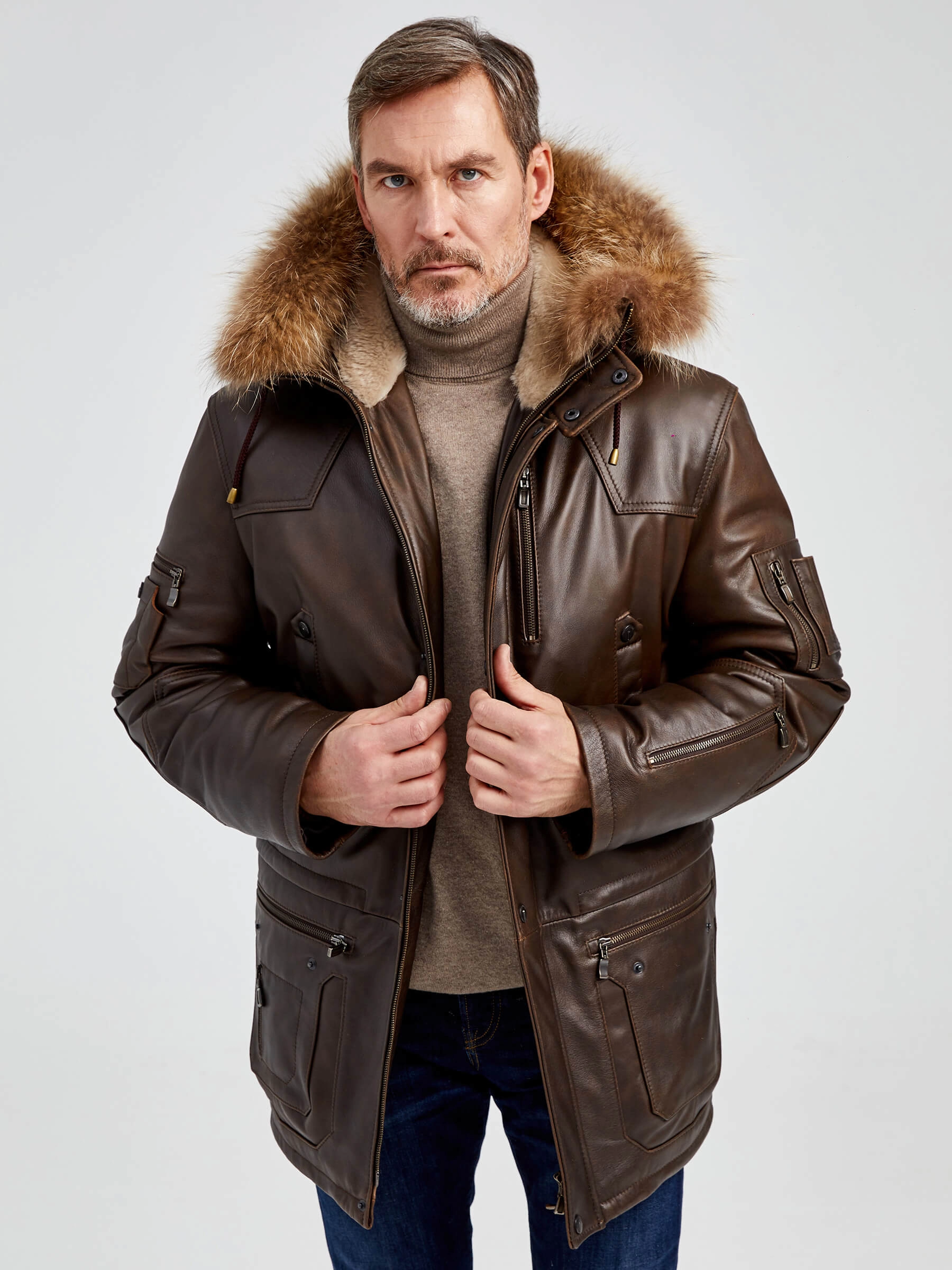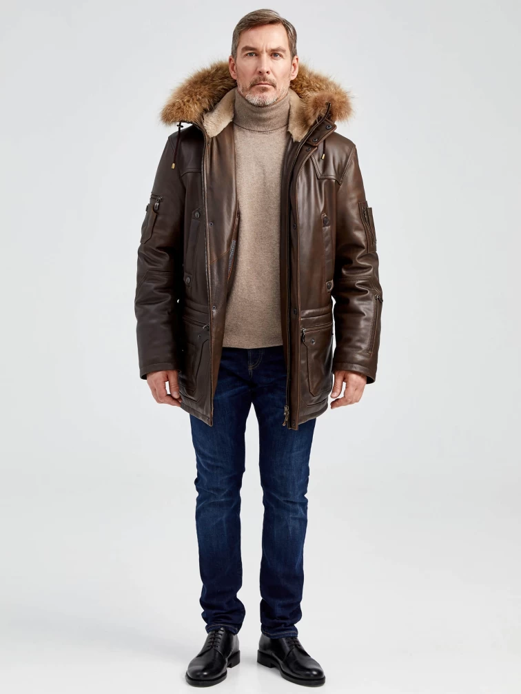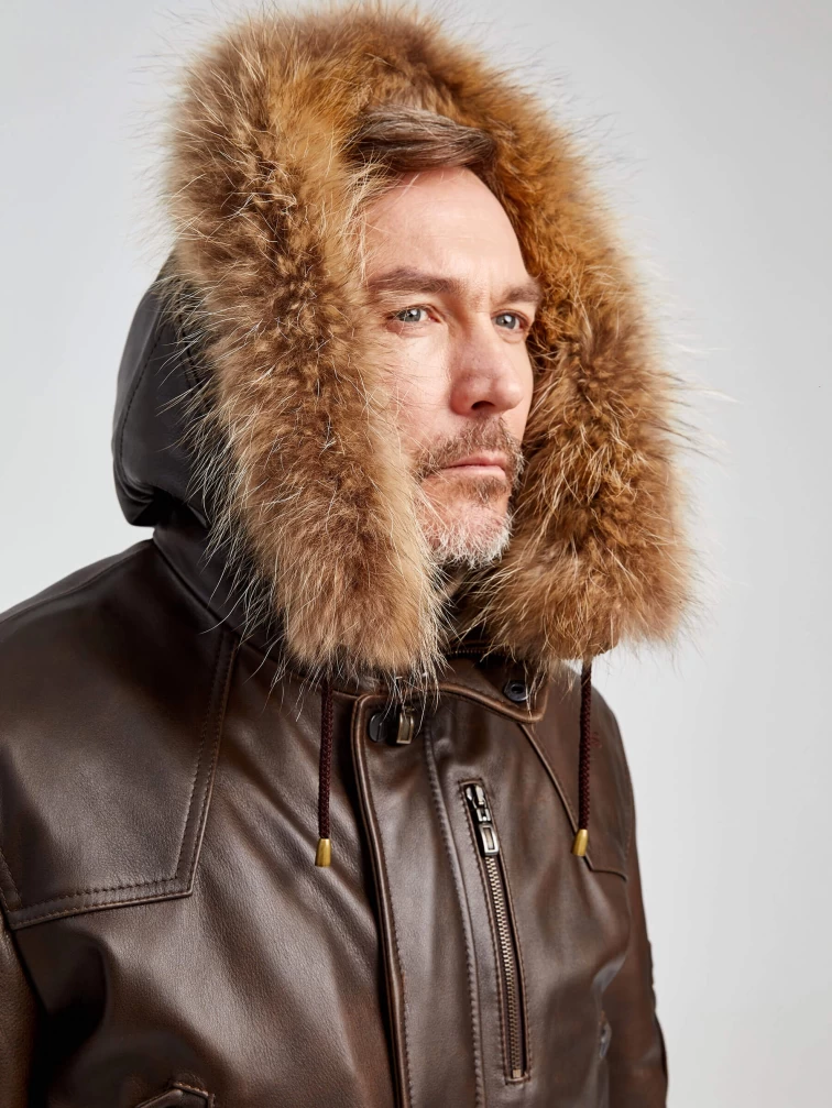 Утепленная мужская кожаная куртка аляска с мехом енота Алекс, светло-коричневая, размер 44, артикул 40451