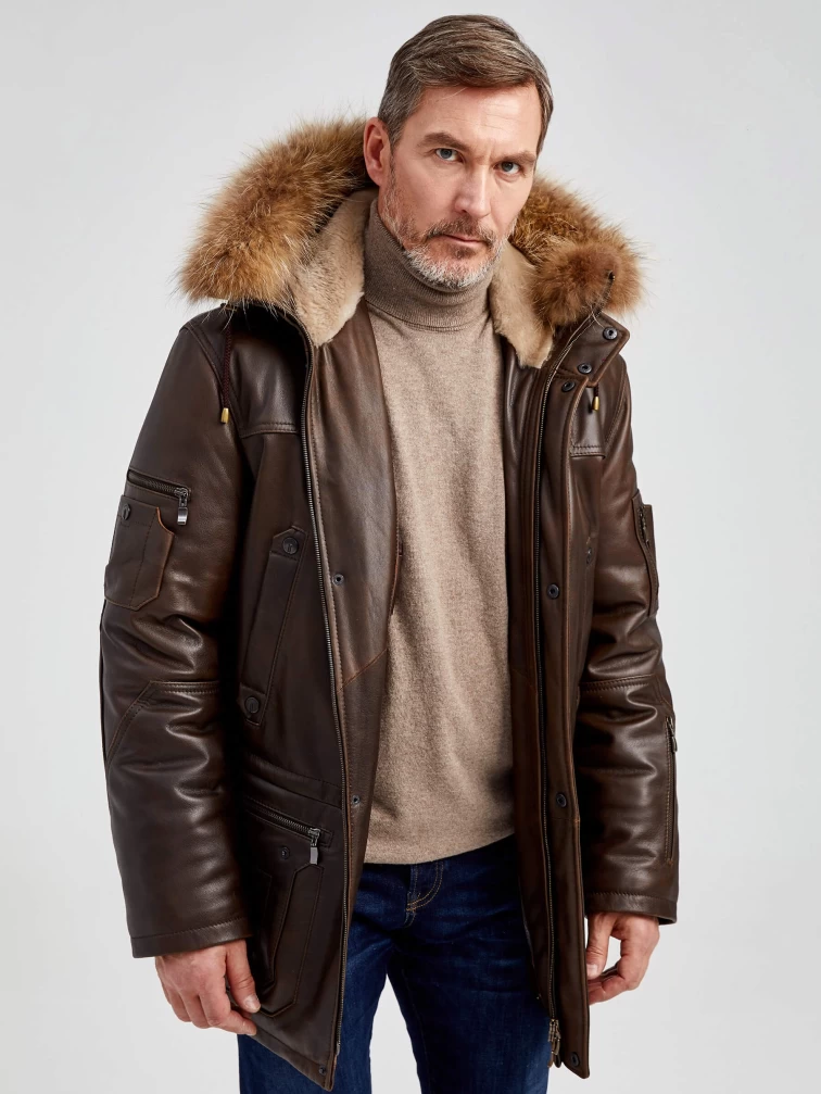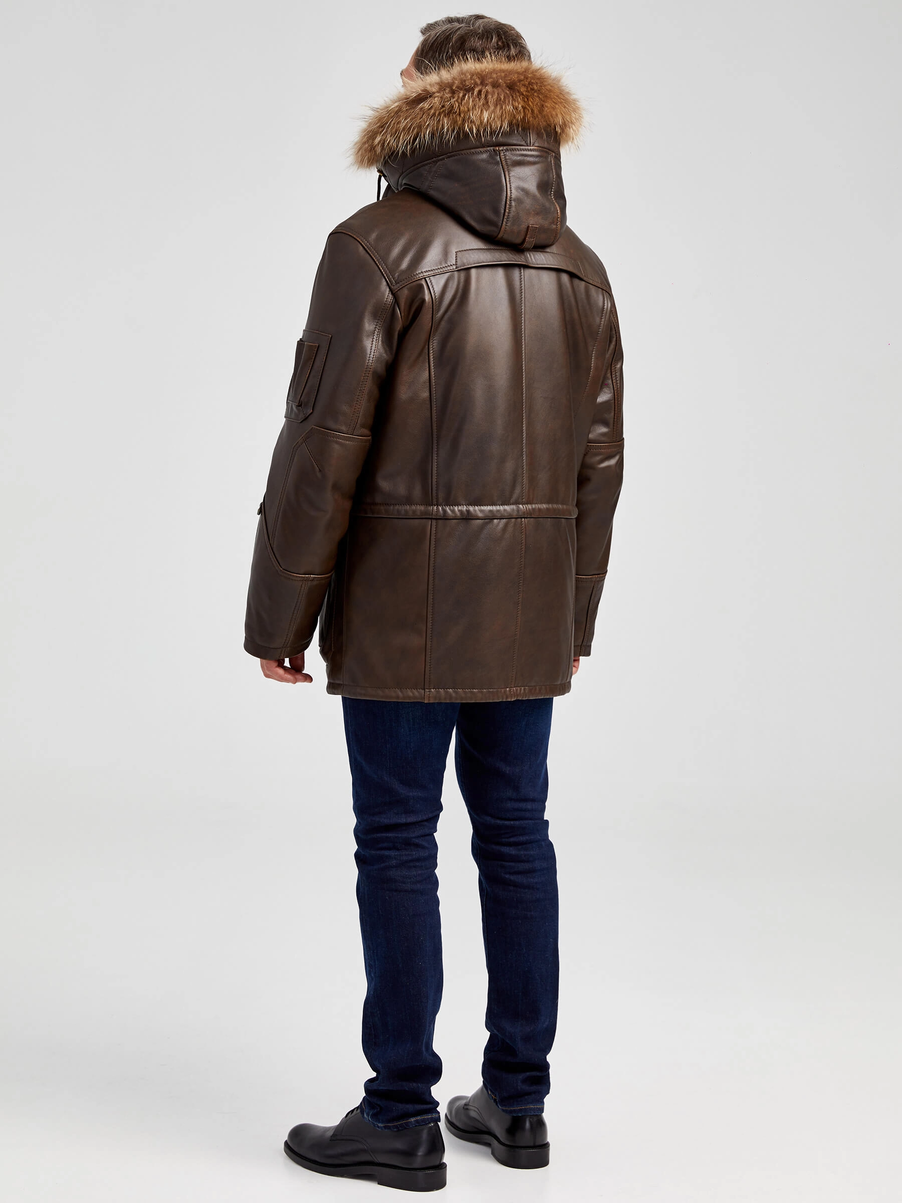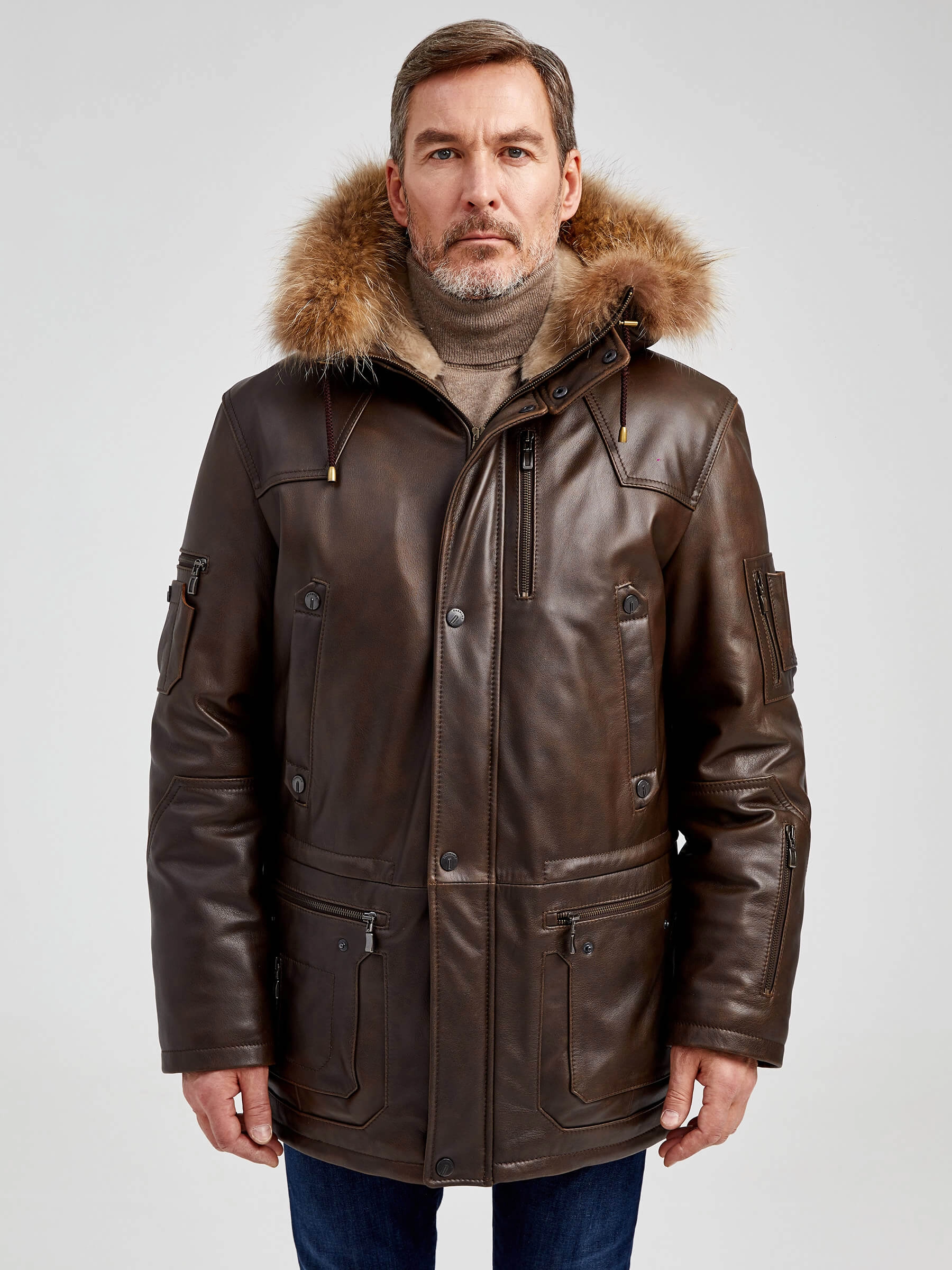 Утепленная мужская кожаная куртка аляска с мехом енота Алекс, светло-коричневая, размер 44, артикул 40451
