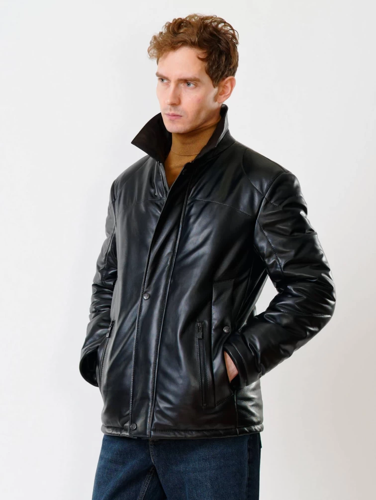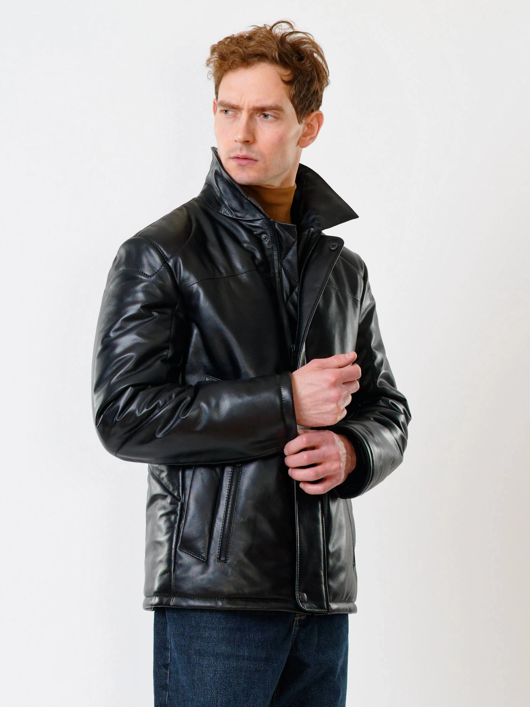 Товар мужской кожаный пуховик с воротником меха енота премиум класса джастин, черный, размер 48, артикул 40230 выполнен из натуральной кожи с застежкой молния. Рассчитан на сезон: осень-зима. Длина изделия 74 см, силуэт полуприлегающий.