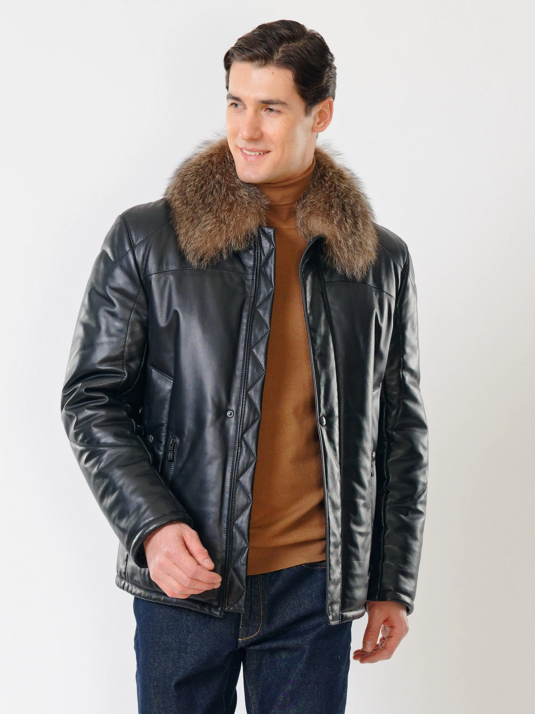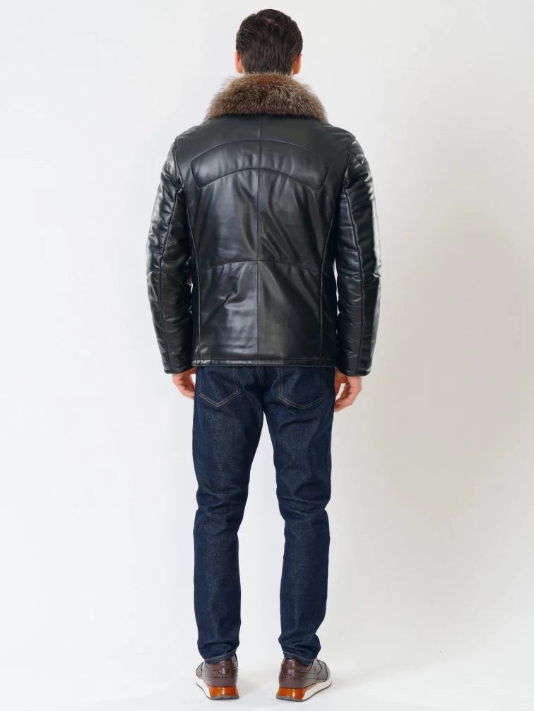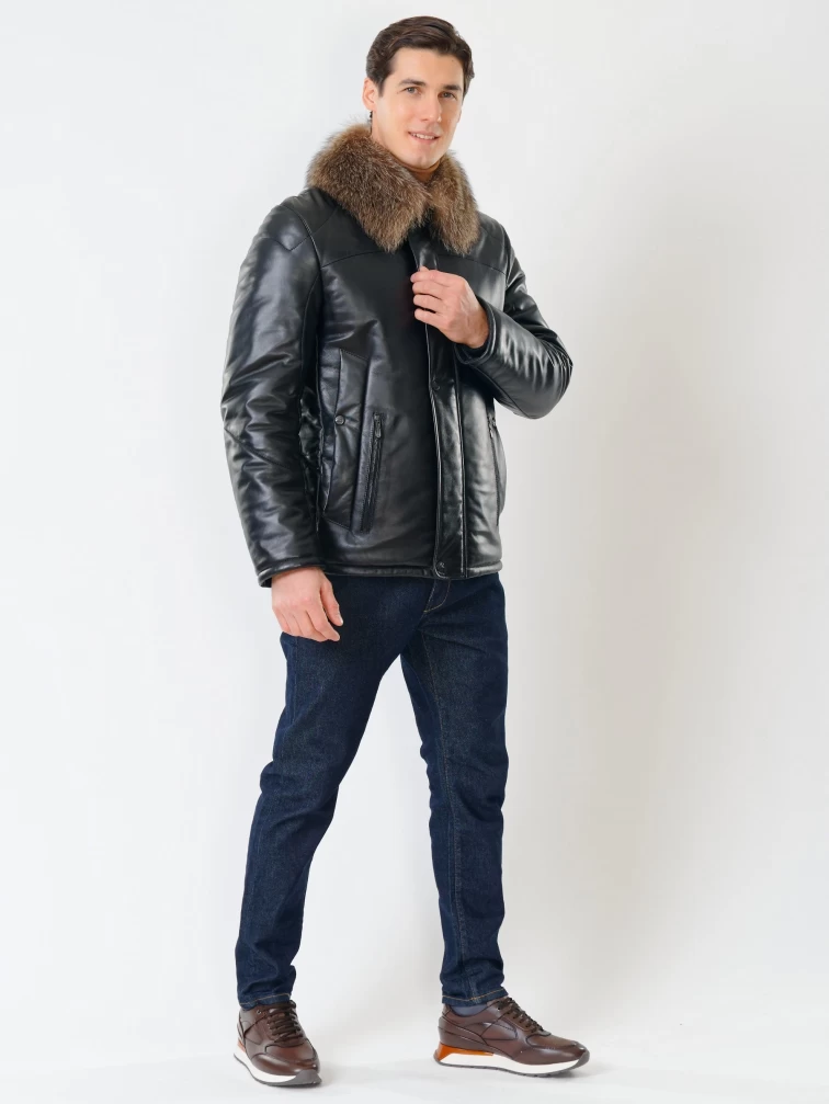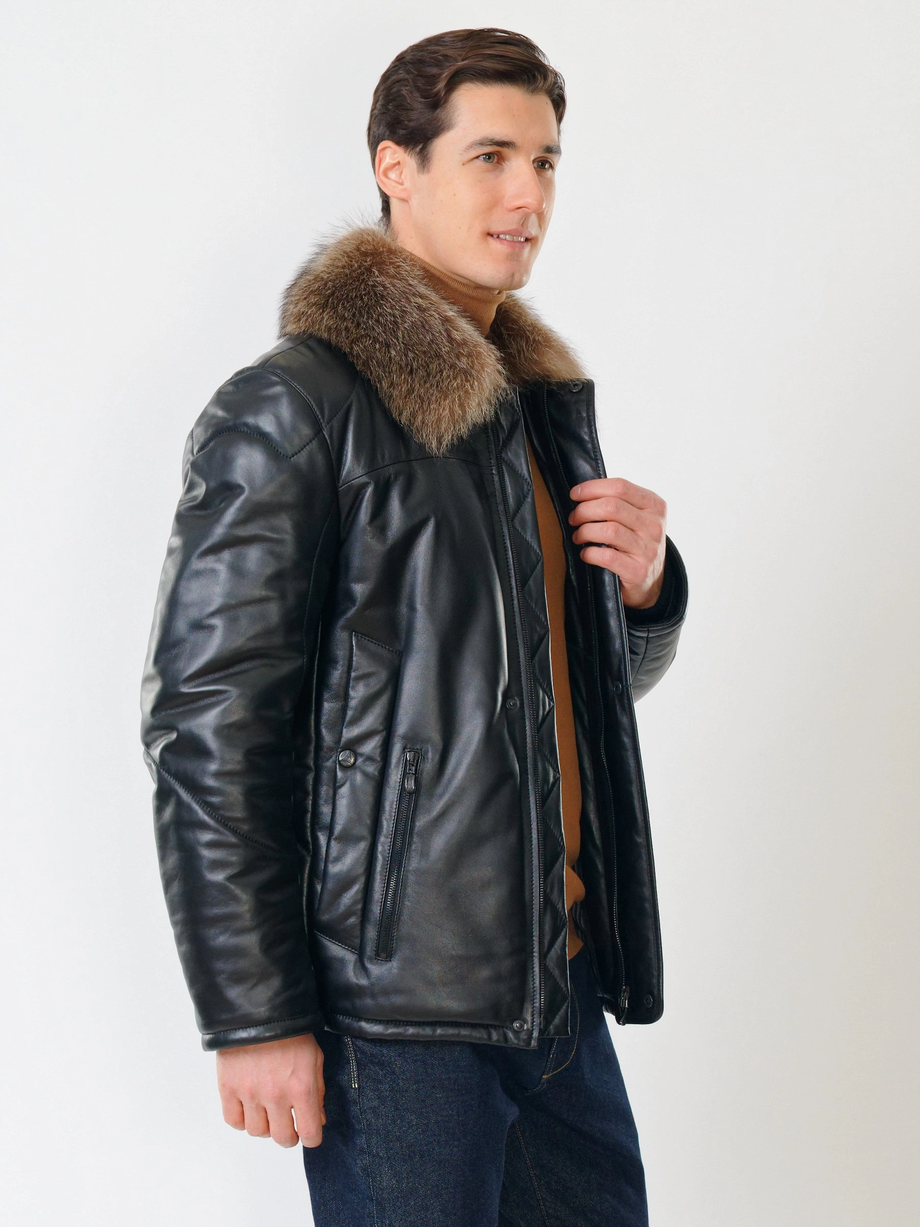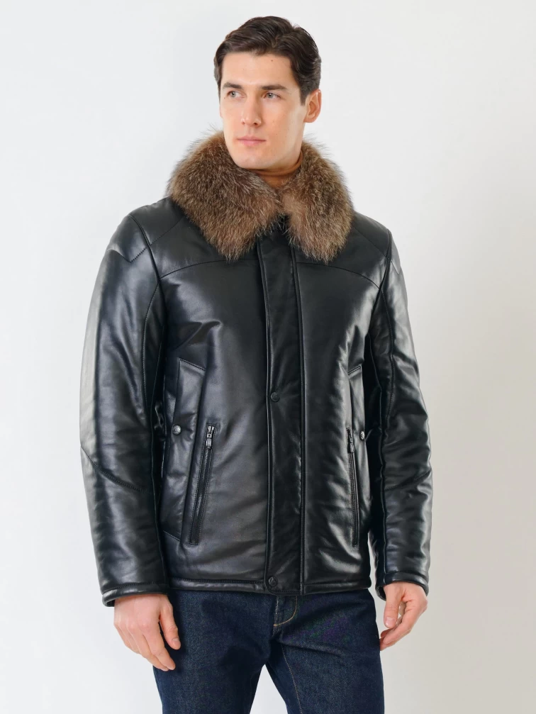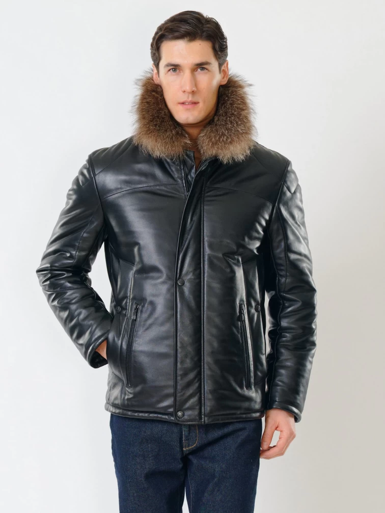 Товар мужской кожаный пуховик с воротником меха енота премиум класса джастин, черный, размер 48, артикул 40311 выполнен из натуральной кожи с застежкой молния. Рассчитан на сезон: осень-зима. Длина изделия 74 см, силуэт полуприлегающий.