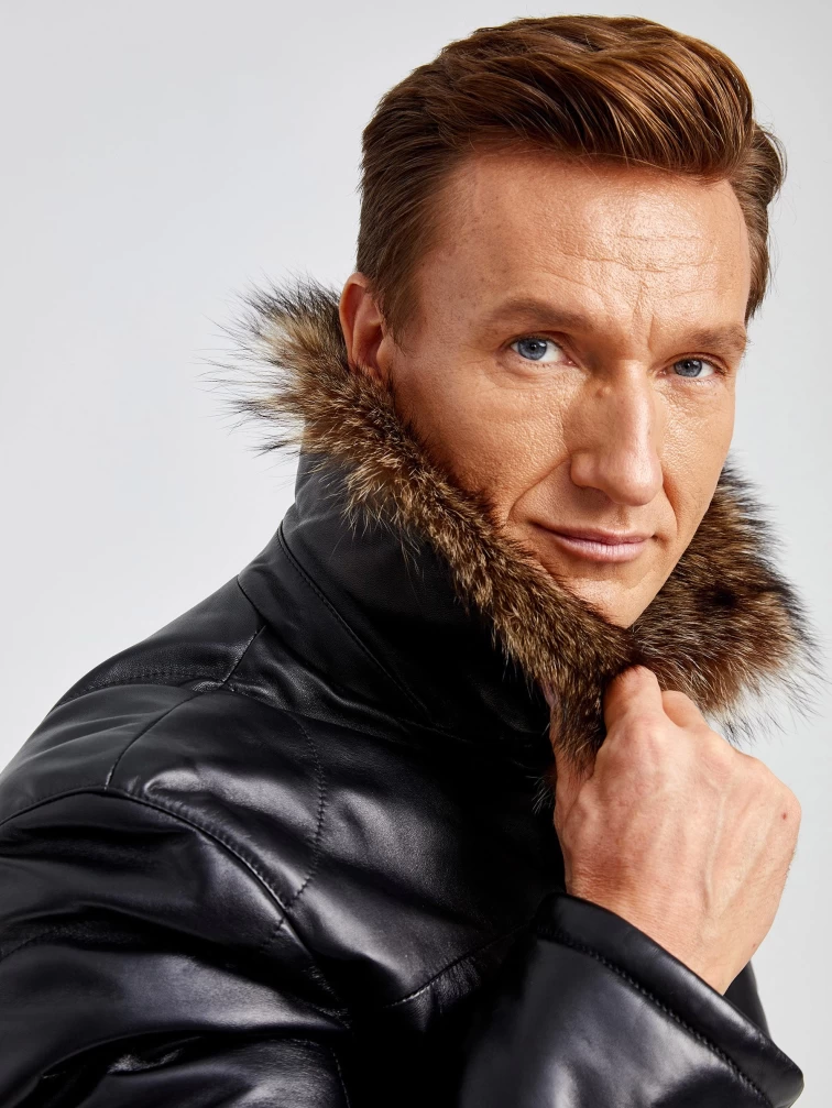 Мужской кожаный пуховик с воротником меха енота премиум класса Джастин, черный, размер 48, артикул 40422