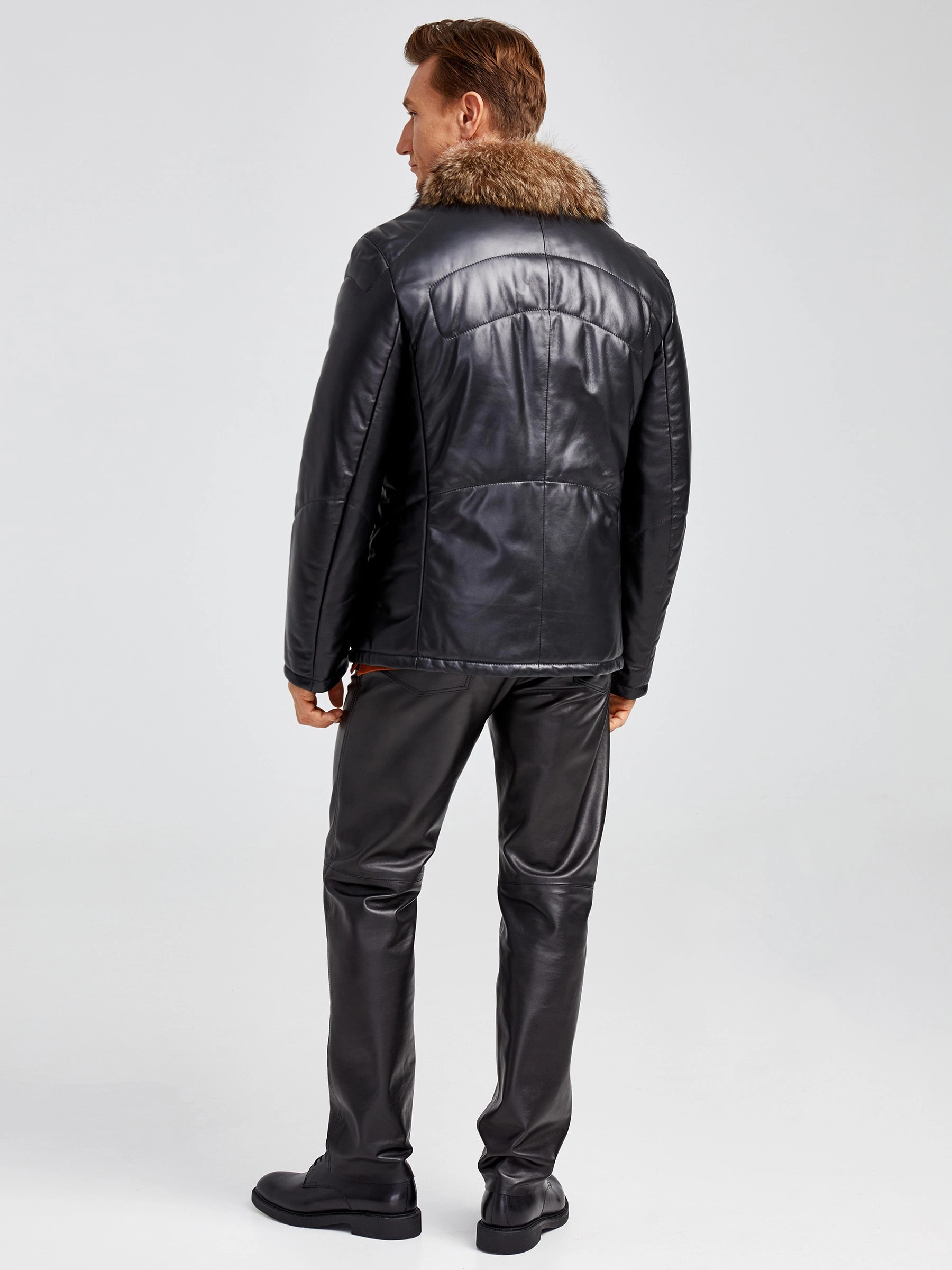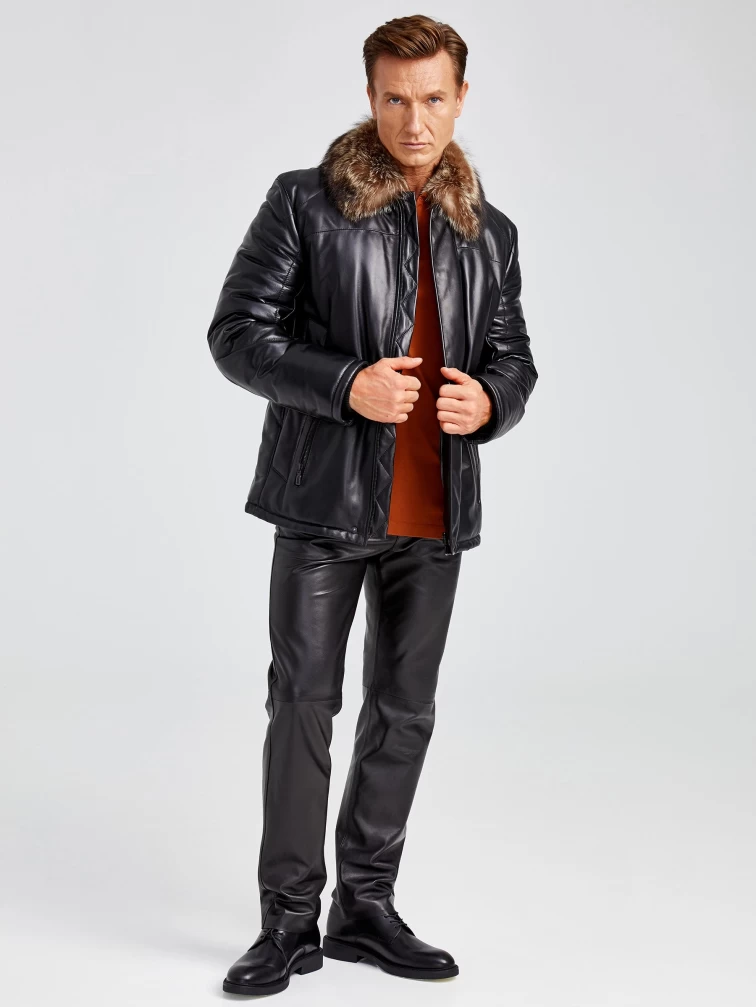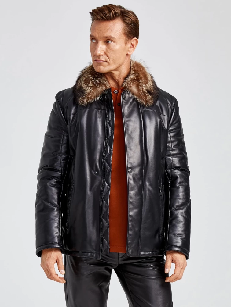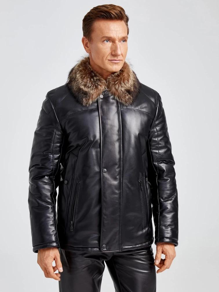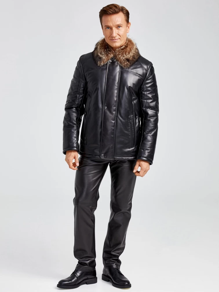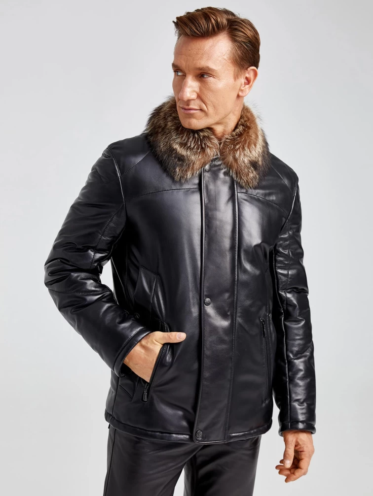 Товар мужской кожаный пуховик с воротником меха енота премиум класса джастин, черный, размер 48, артикул 40422 выполнен из натуральной кожи с застежкой молния. Рассчитан на сезон: осень-зима. Длина изделия 74 см, силуэт полуприлегающий.
