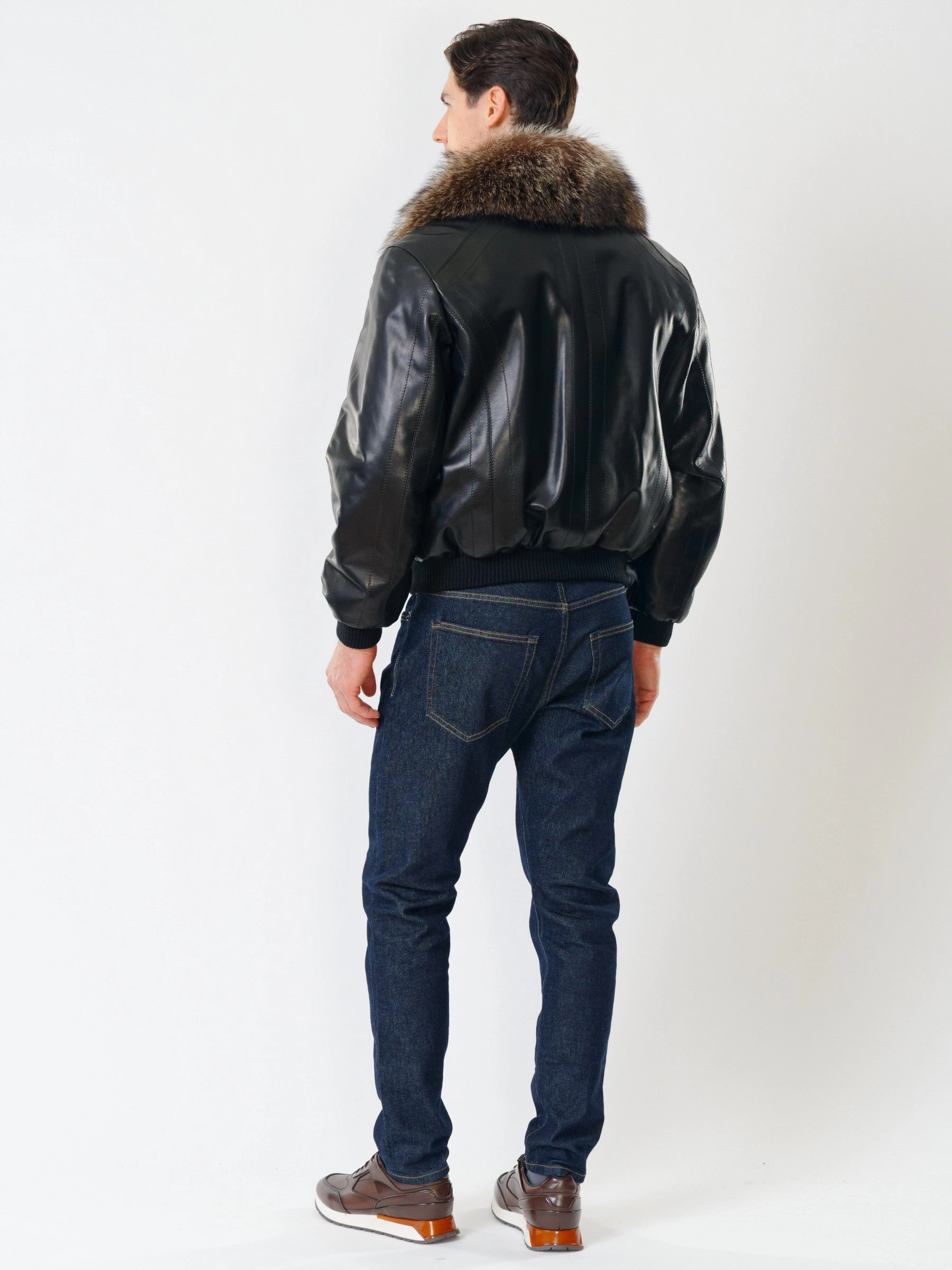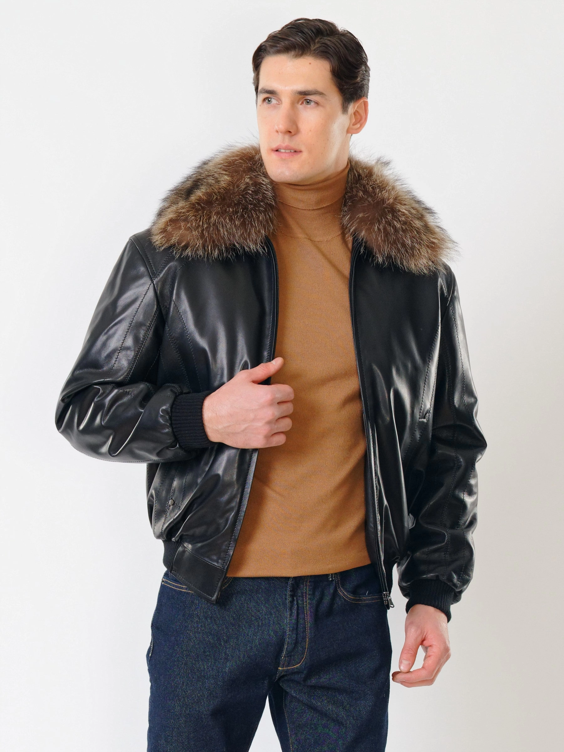 Мужская утепленная кожаная куртка бомбер на резинке с енотовым воротником Мауро-зима, черная, размер 64, артикул 40320