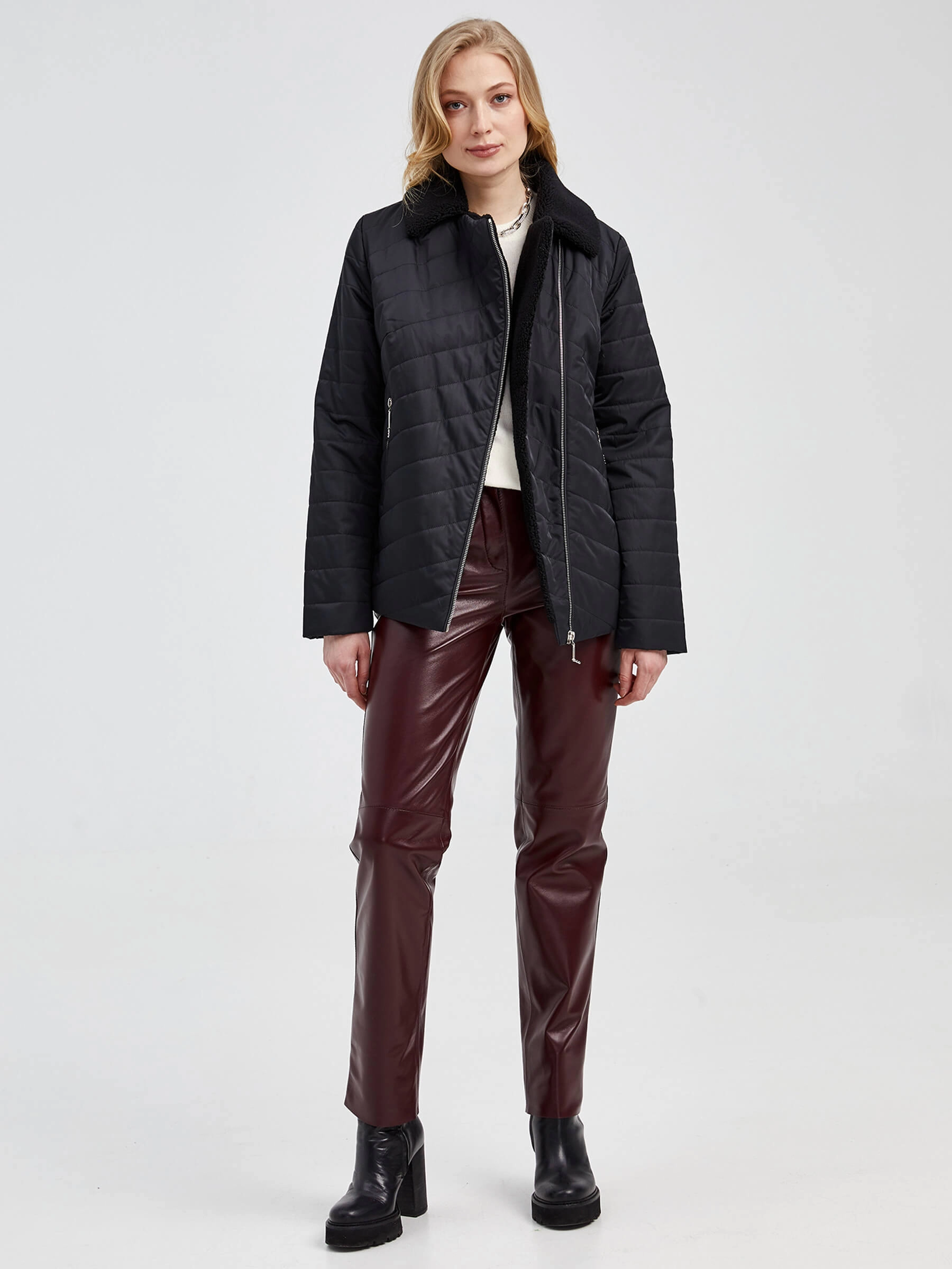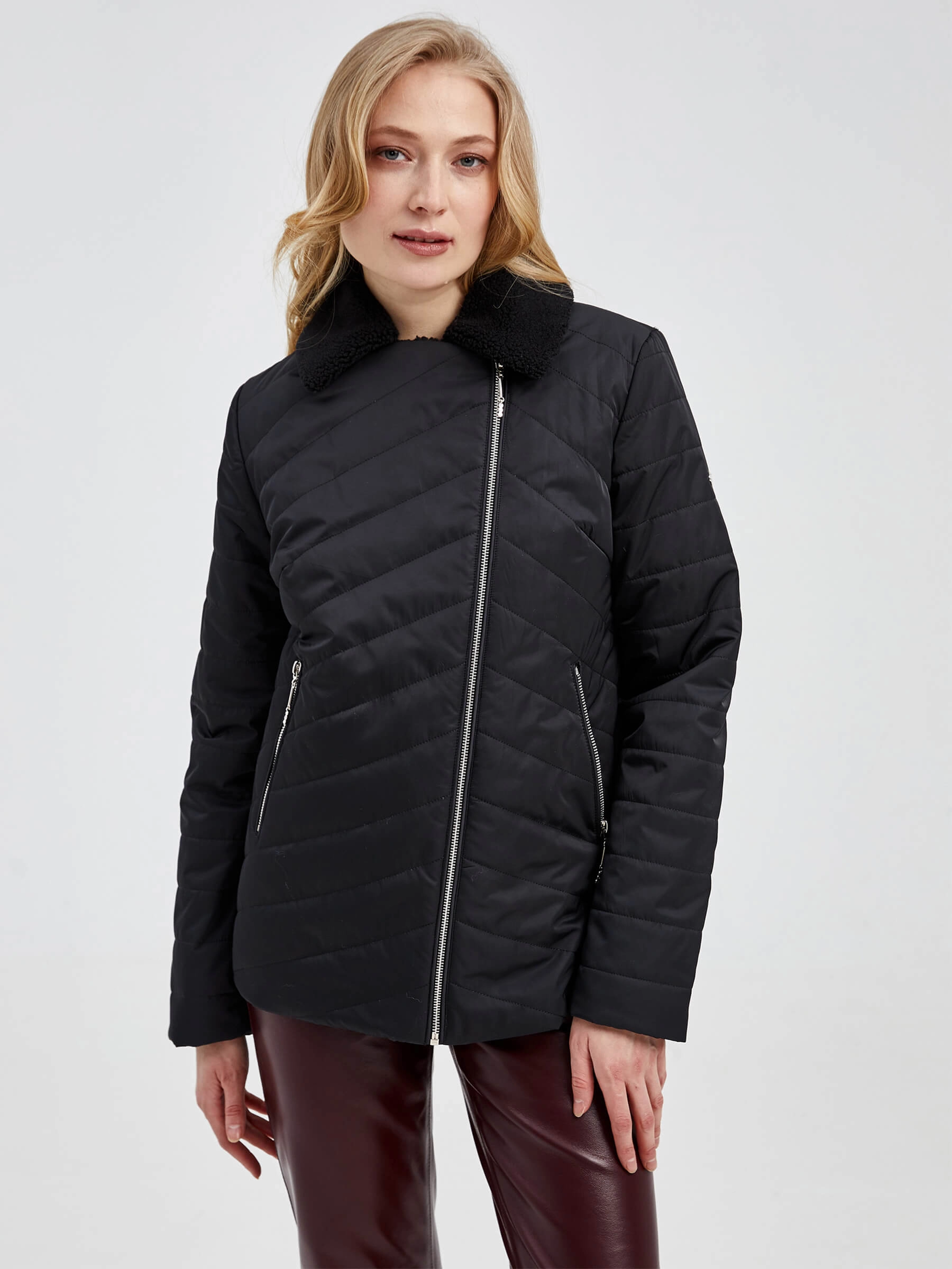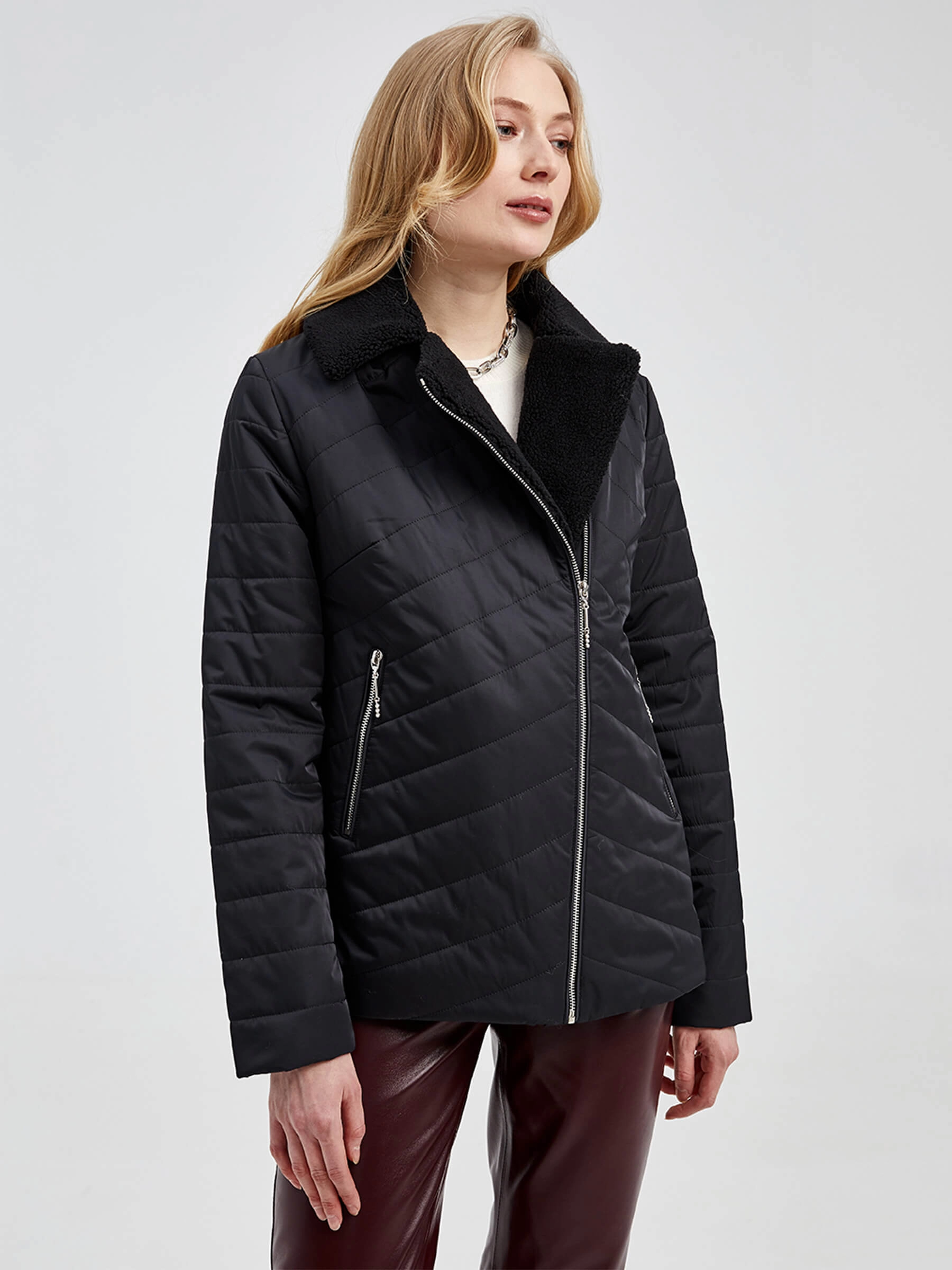Женская стеганая куртка. Наполнитель – синтепон. Воротник - отложной, застежка - молния, два боковых кармана на молнии.