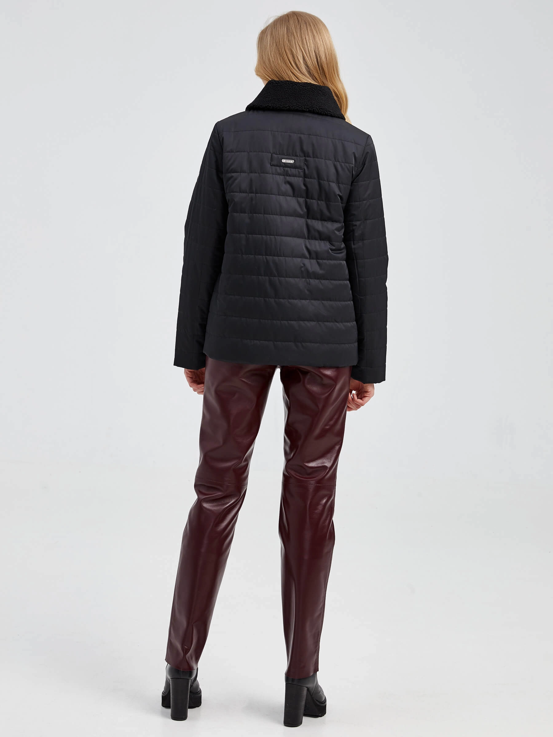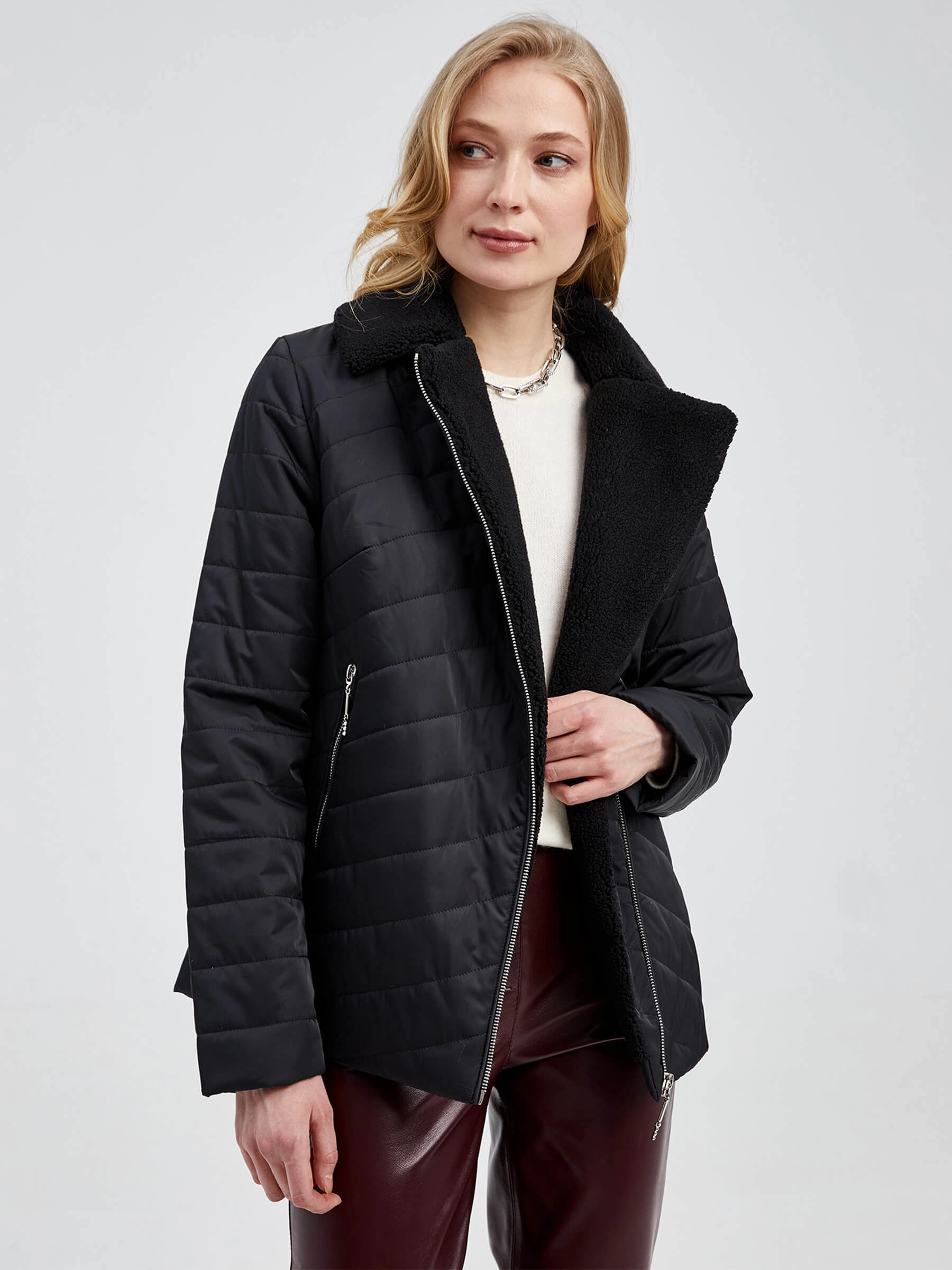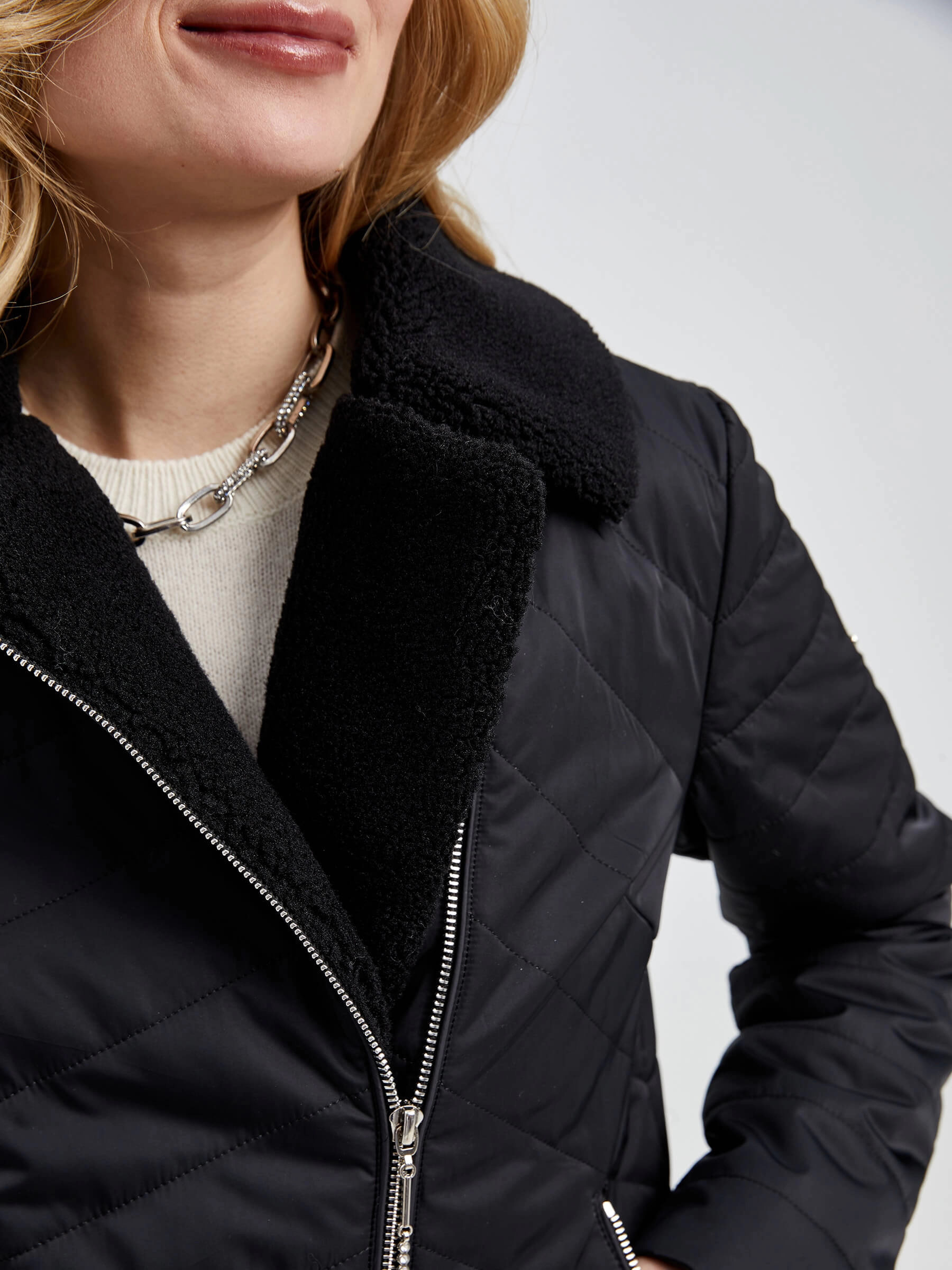 Женская стеганая куртка. Наполнитель – синтепон. Воротник - отложной, застежка - молния, два боковых кармана на молнии.