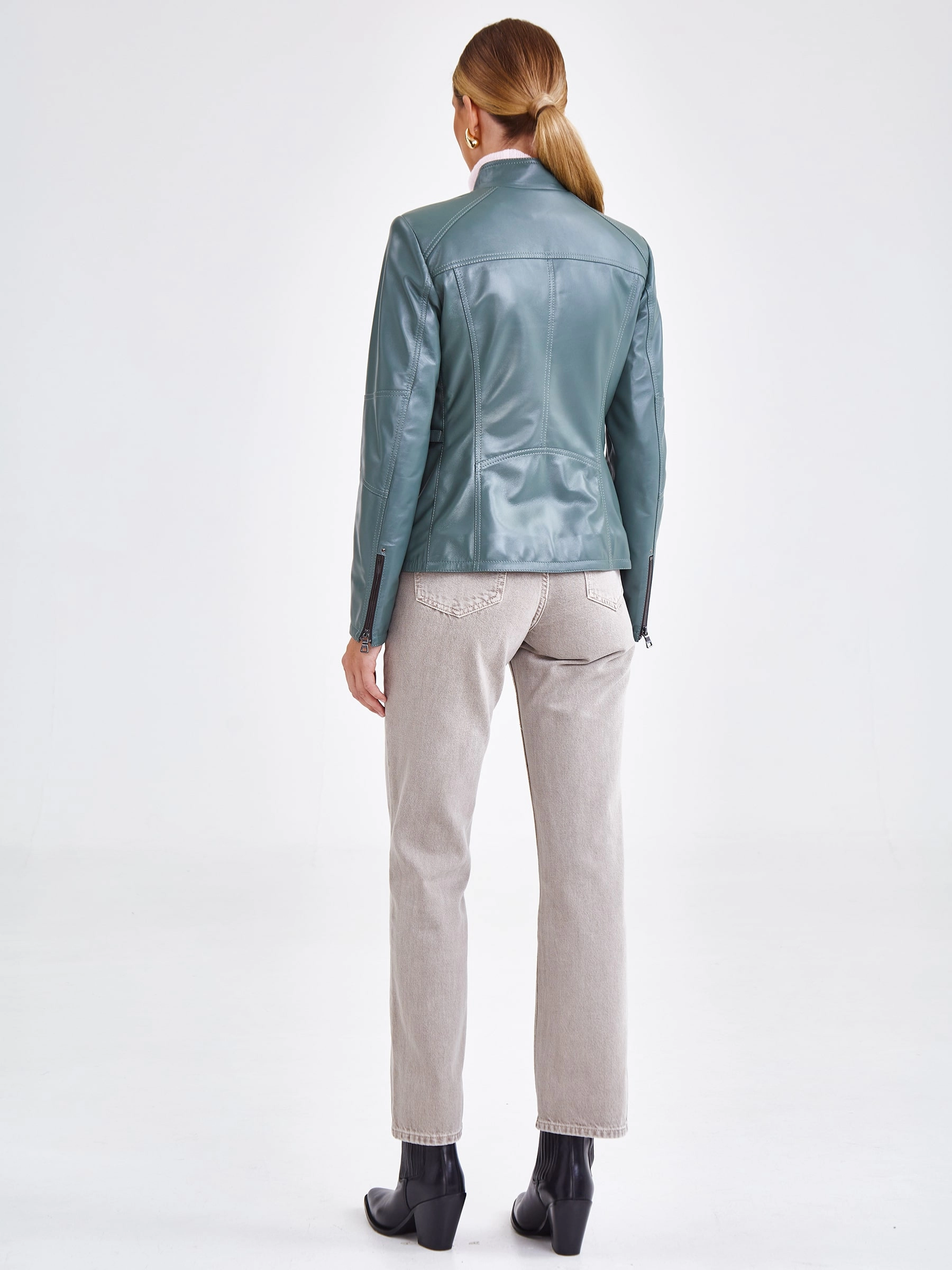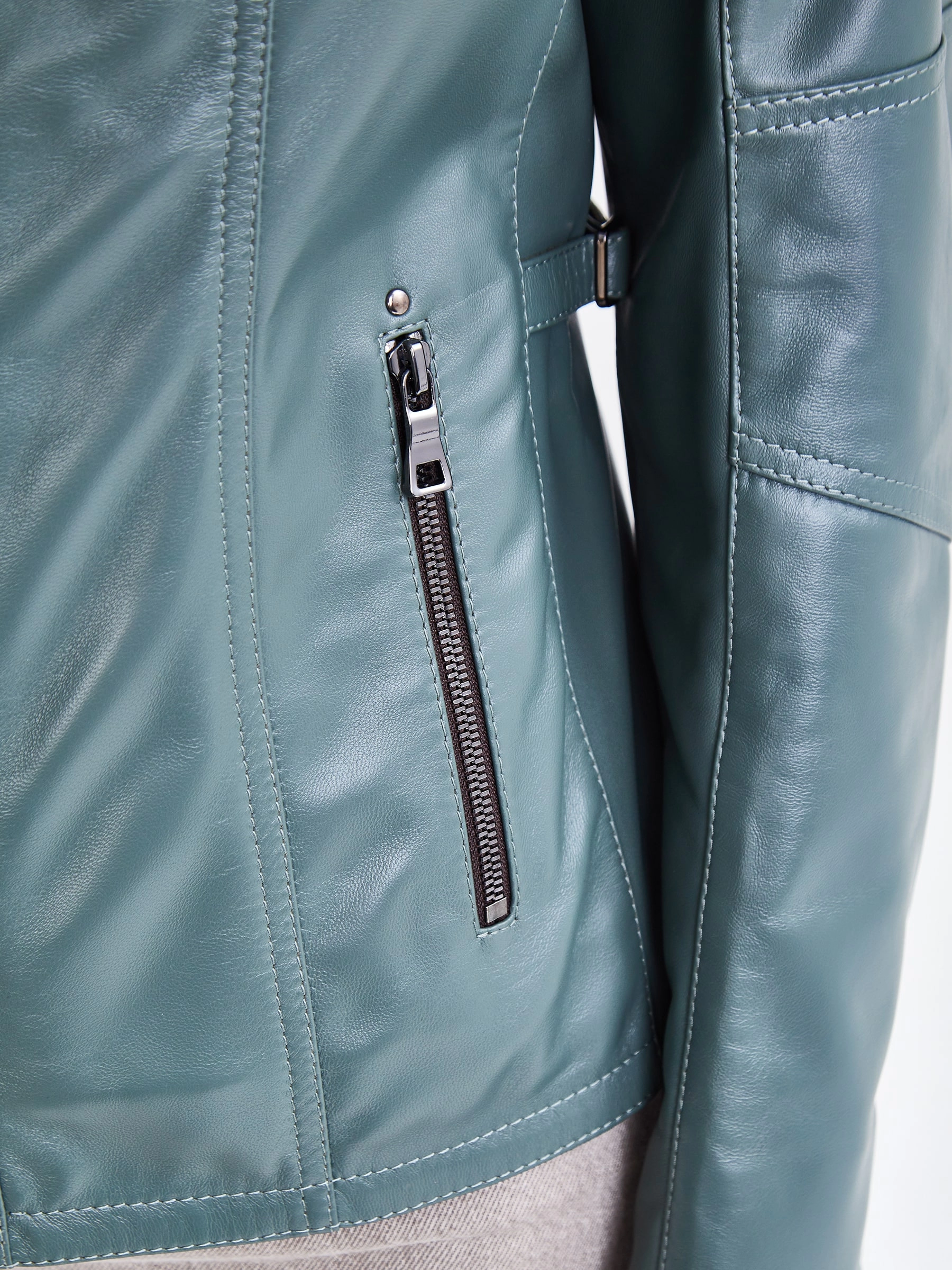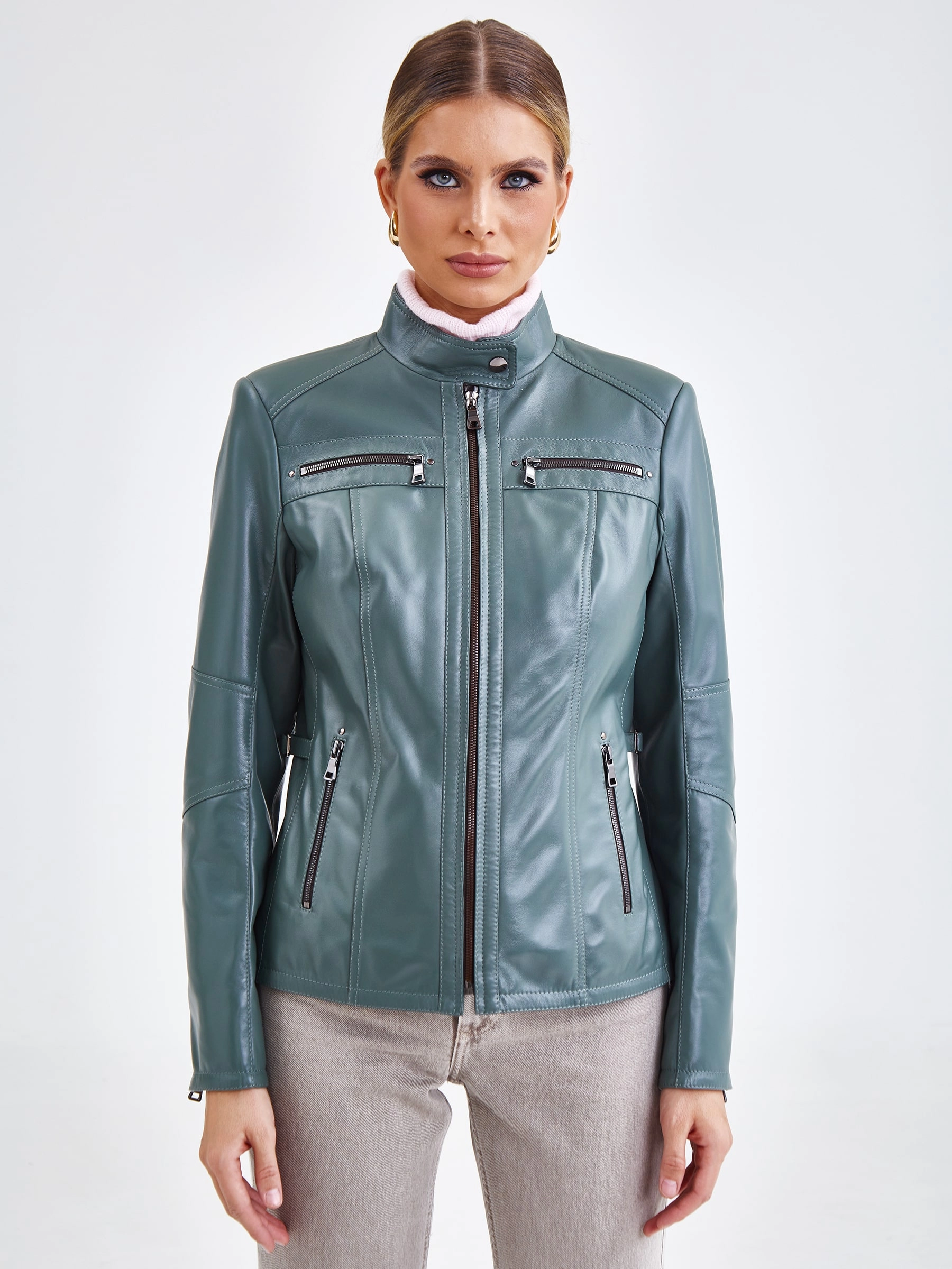 Короткая куртка из натуральной кожи на молнии с воротником-стойкой на кнопке и втачными рукавами. Полуприлегающий силуэт в повседневном стиле дополнен врезными и нагрудными карманами на молниях, а также регулируемыми боковыми патами на талии для точной посадки. Безупречно сочетается с джинсами, брюками, свитерами и базовыми футболками, создавая универсальный стильный образ. Качество кожи — премиальное!