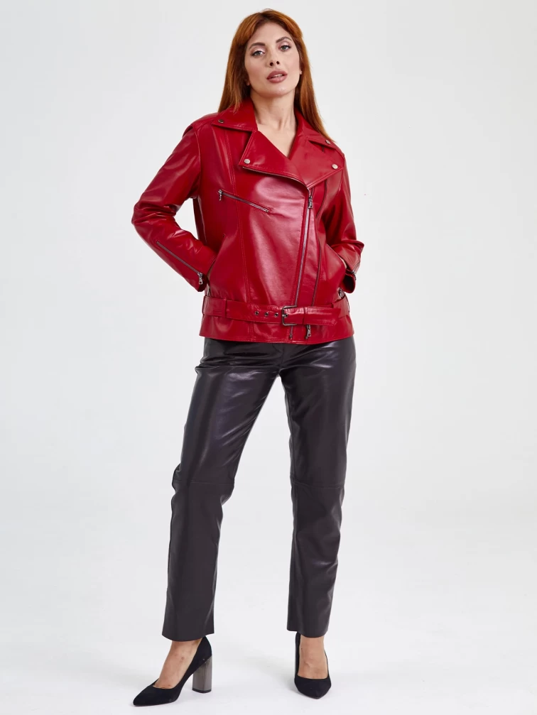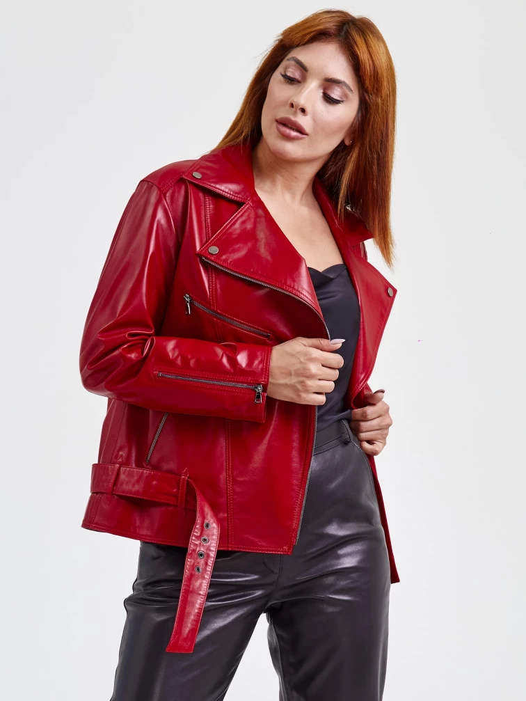 Кожаная женская куртка косуха с поясом 3013, красная, размер 46, артикул 91710