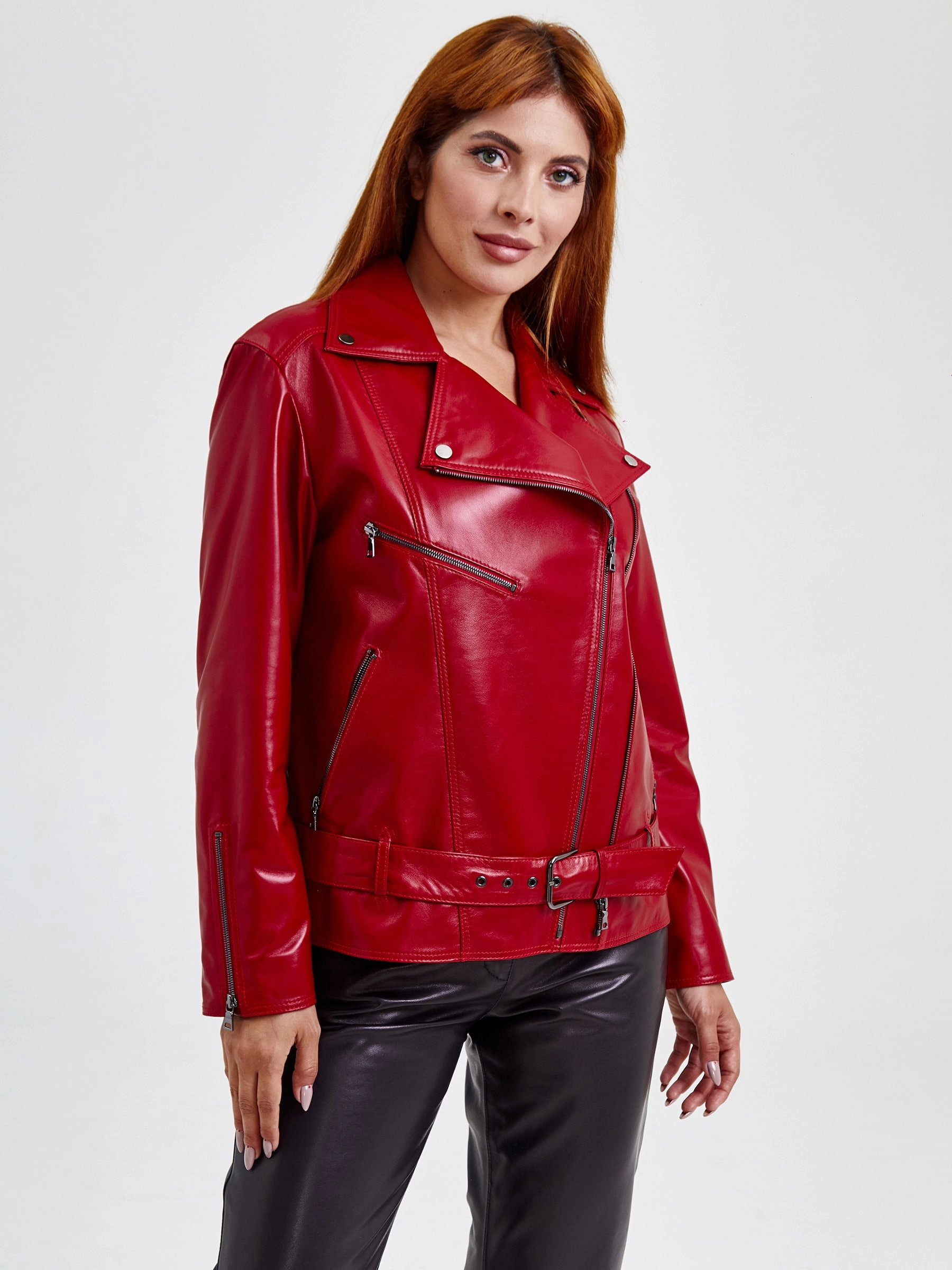 Товар кожаная женская куртка косуха с поясом 3013, красная, размер 46, артикул 91710 выполнен из натуральной кожи с застежкой молния. Рассчитан на сезон: весна-лето. Длина изделия 65 см, силуэт прямой.