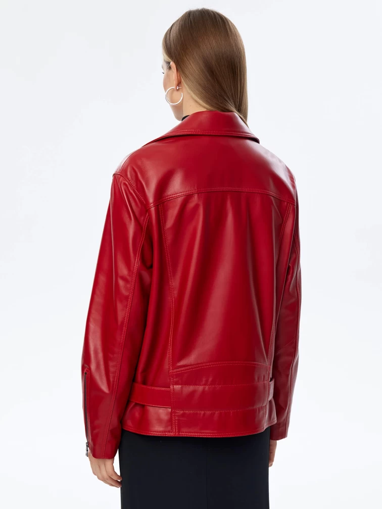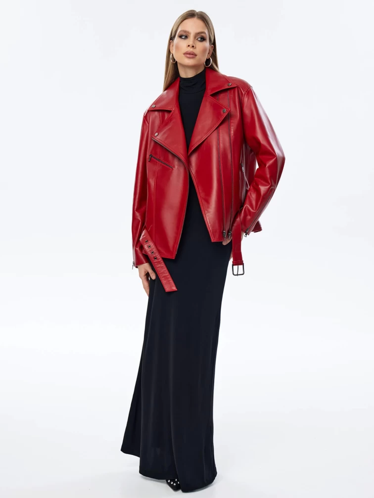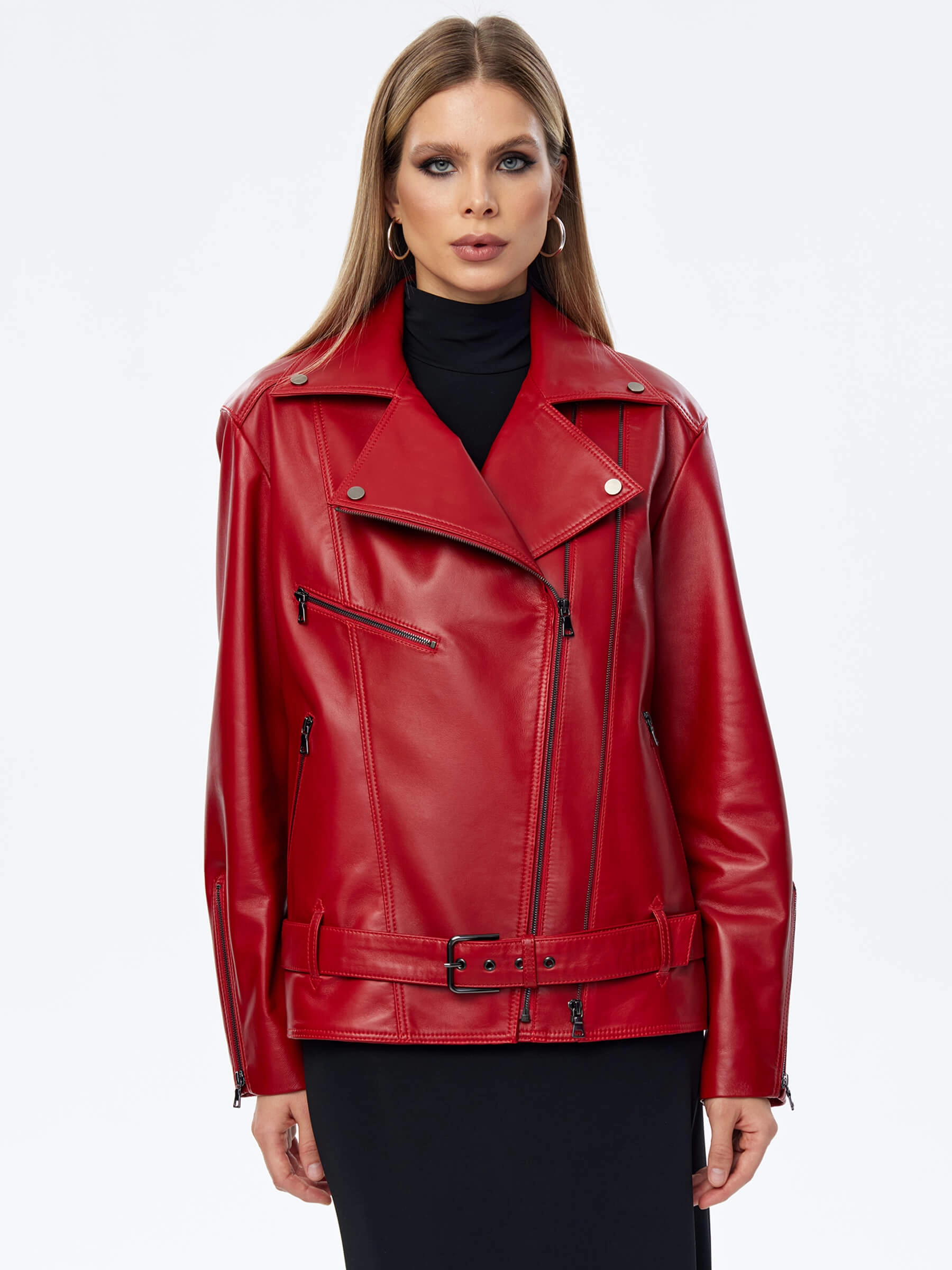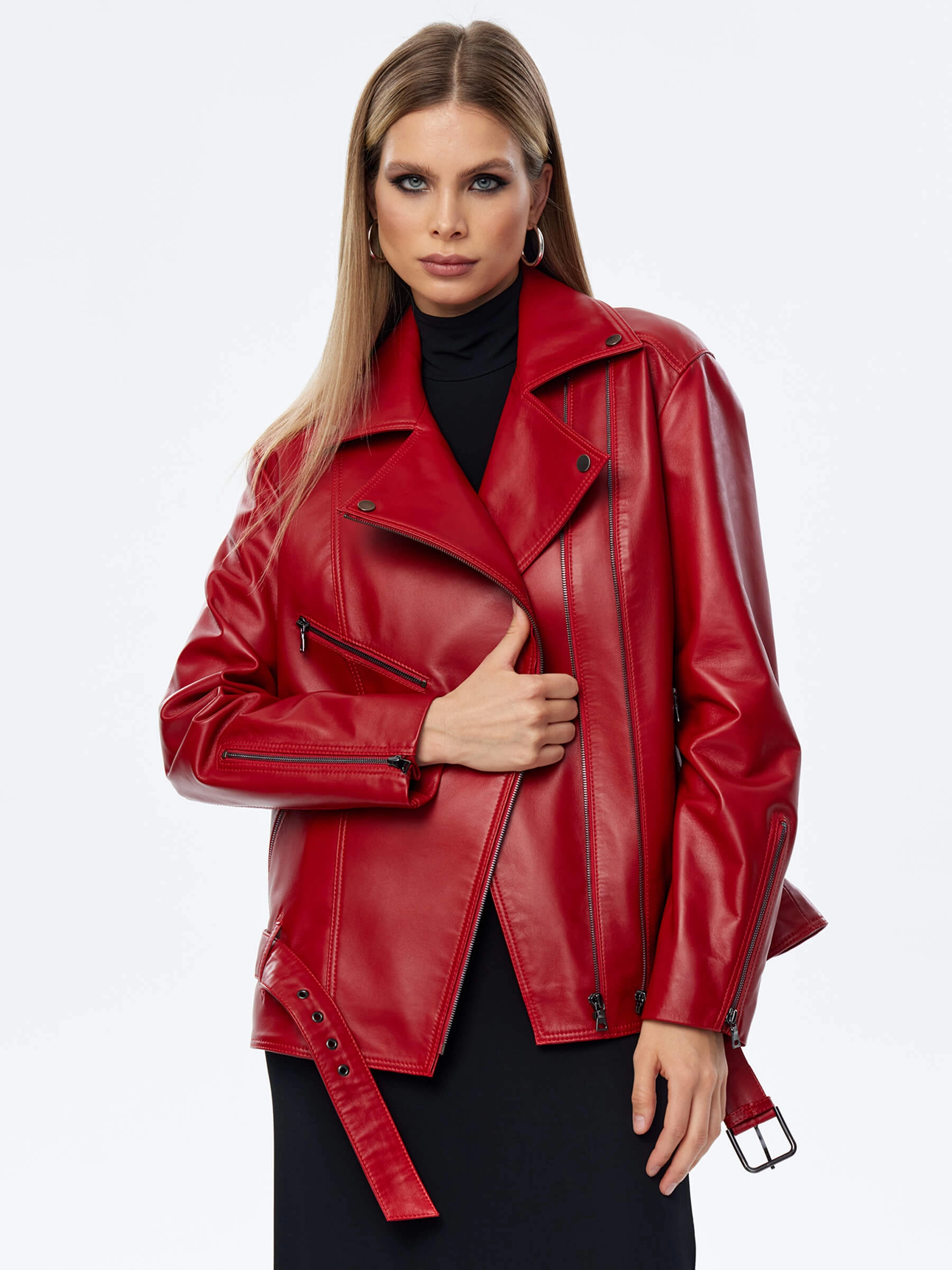 Товар кожаная женская куртка косуха с поясом 3013, красная, размер 46, артикул 91711 выполнен из натуральной кожи с застежкой молния. Рассчитан на сезон: весна-лето. Длина изделия 65 см, силуэт прямой.