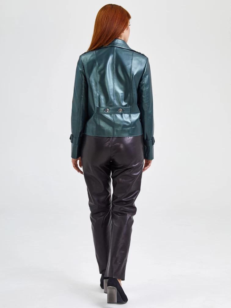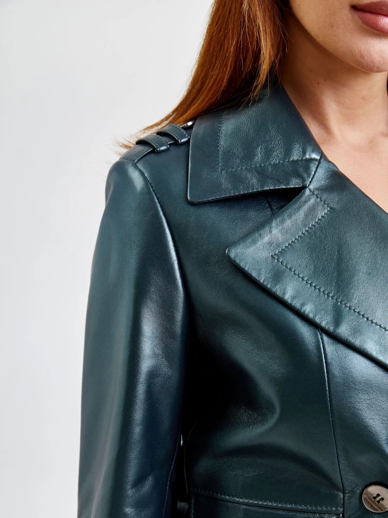 Товар двубортный кожаный женский пиджак 3014, зеленый, размер 48, артикул 91731 выполнен из натуральной кожи с застежкой пуговицы. Рассчитан на сезон: осень-зима. Длина изделия 57 см, силуэт прямой.
