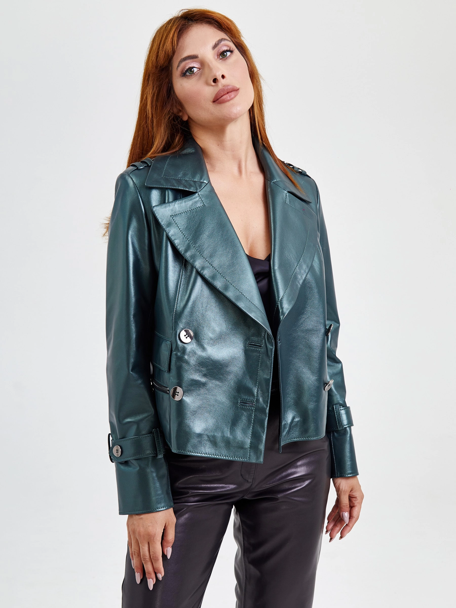 Двубортный кожаный женский пиджак 3014, зеленый, размер 48, артикул 91731