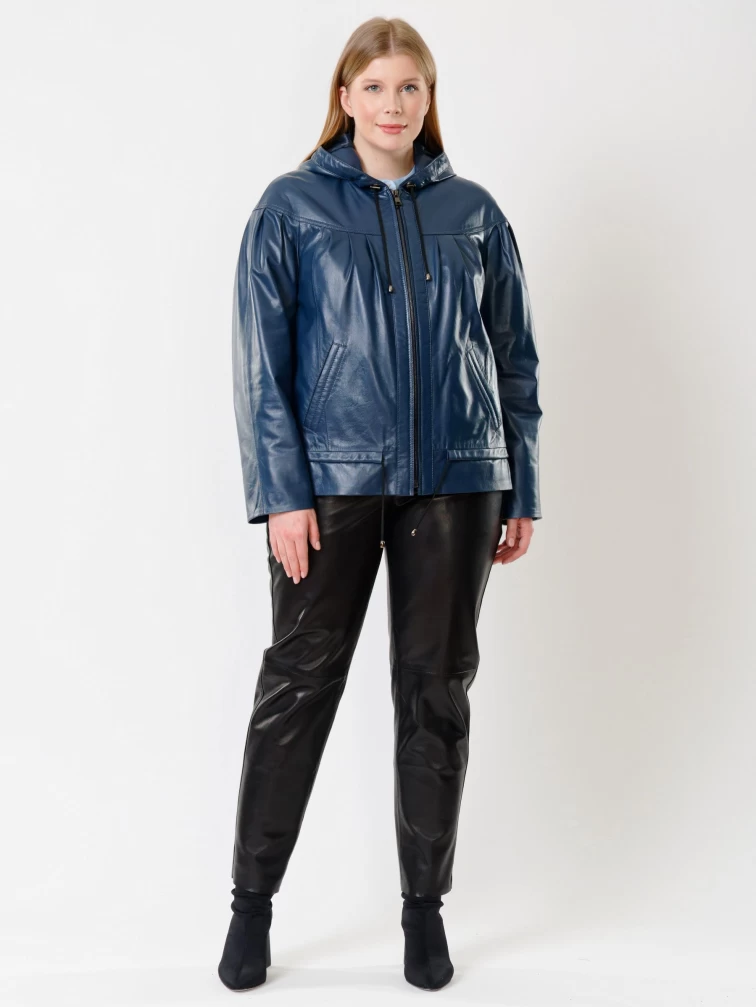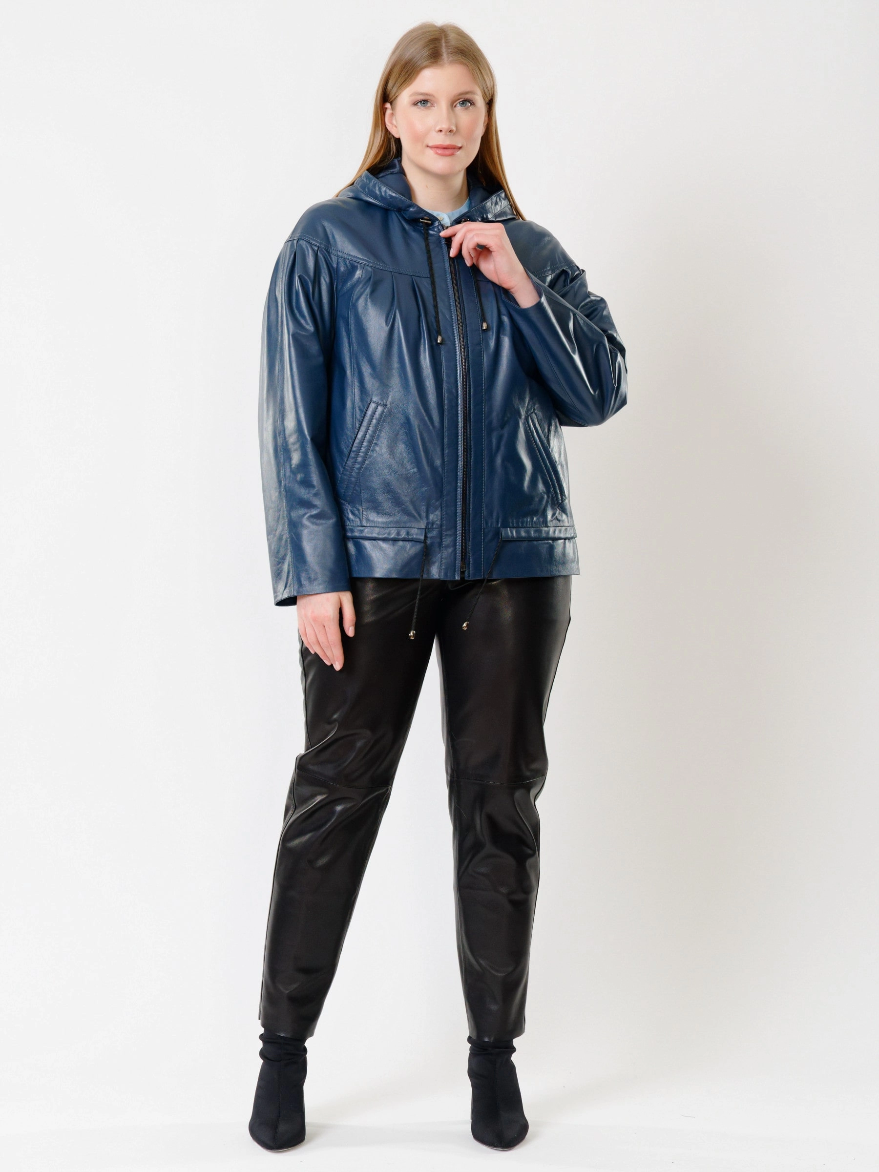 Кожаная женская куртка с капюшоном 303, синяя, размер 54, артикул 91190