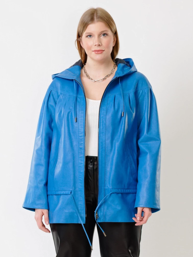 Товар кожаная женская куртка с капюшоном 303у, голубая, размер 54, артикул 91201 выполнен из натуральной кожи с застежкой молния. Рассчитан на сезон: весна-лето. Длина изделия 75 см, силуэт свободный.