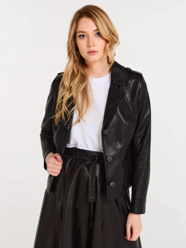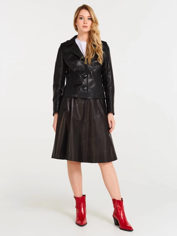 Товар короткая женская кожаная куртка пиджак 304, черная, размер 46, артикул 90380 выполнен из натуральной кожи с застежкой пуговицы. Рассчитан на сезон: весна-лето. Длина изделия 56 см, силуэт полуприлегающий.