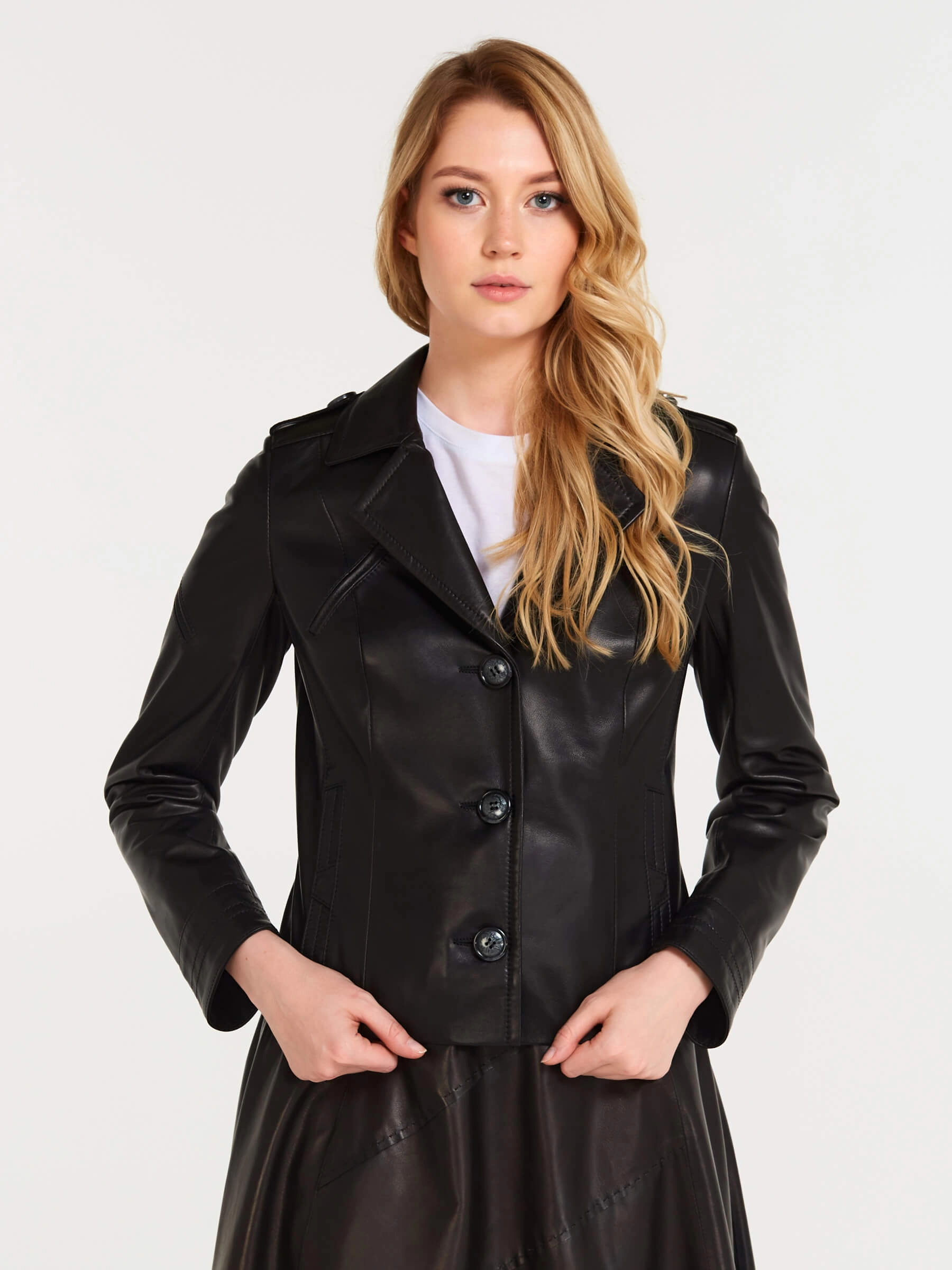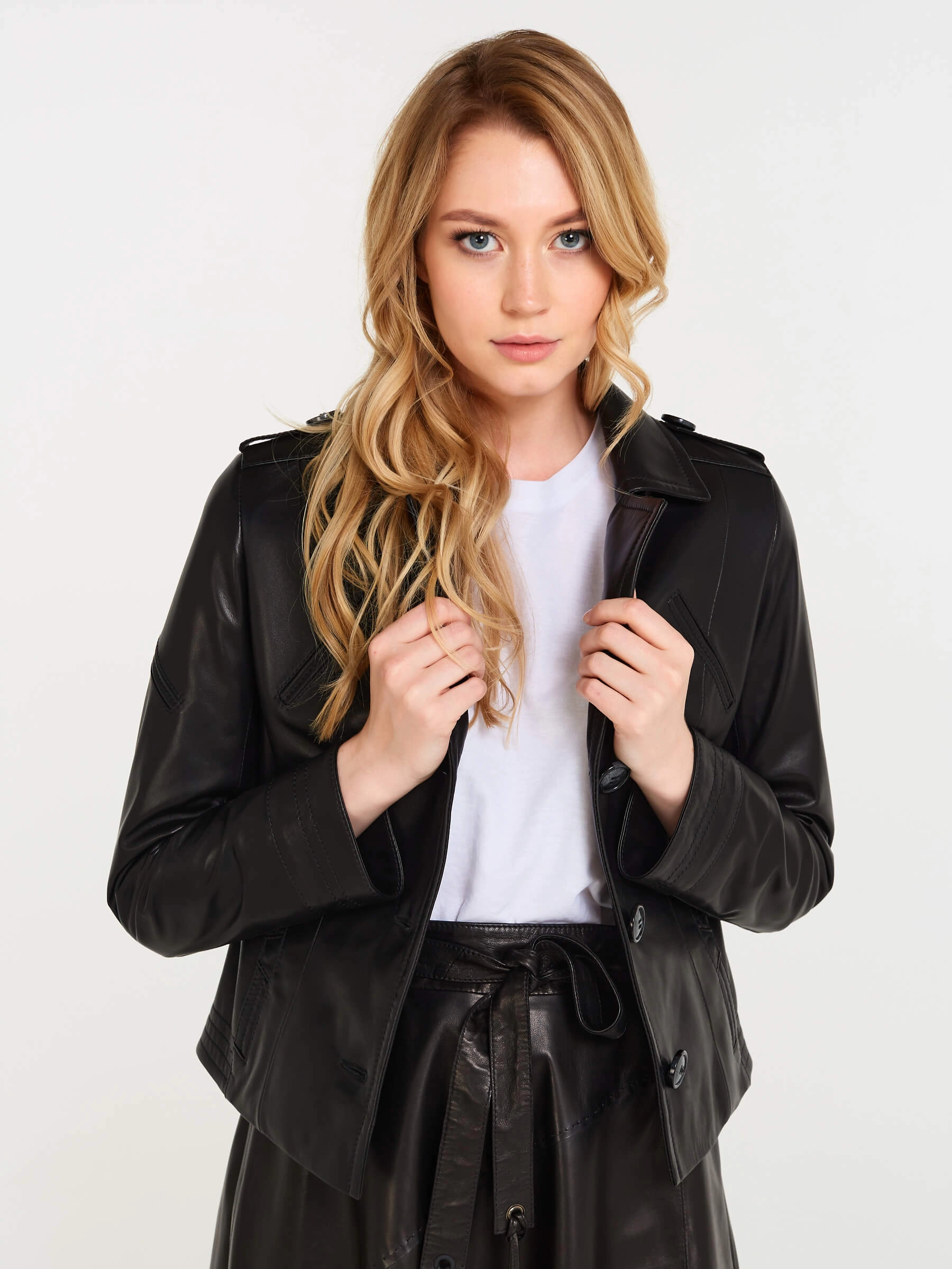 Короткая женская кожаная куртка пиджак 304, черная, размер 46, артикул 90380