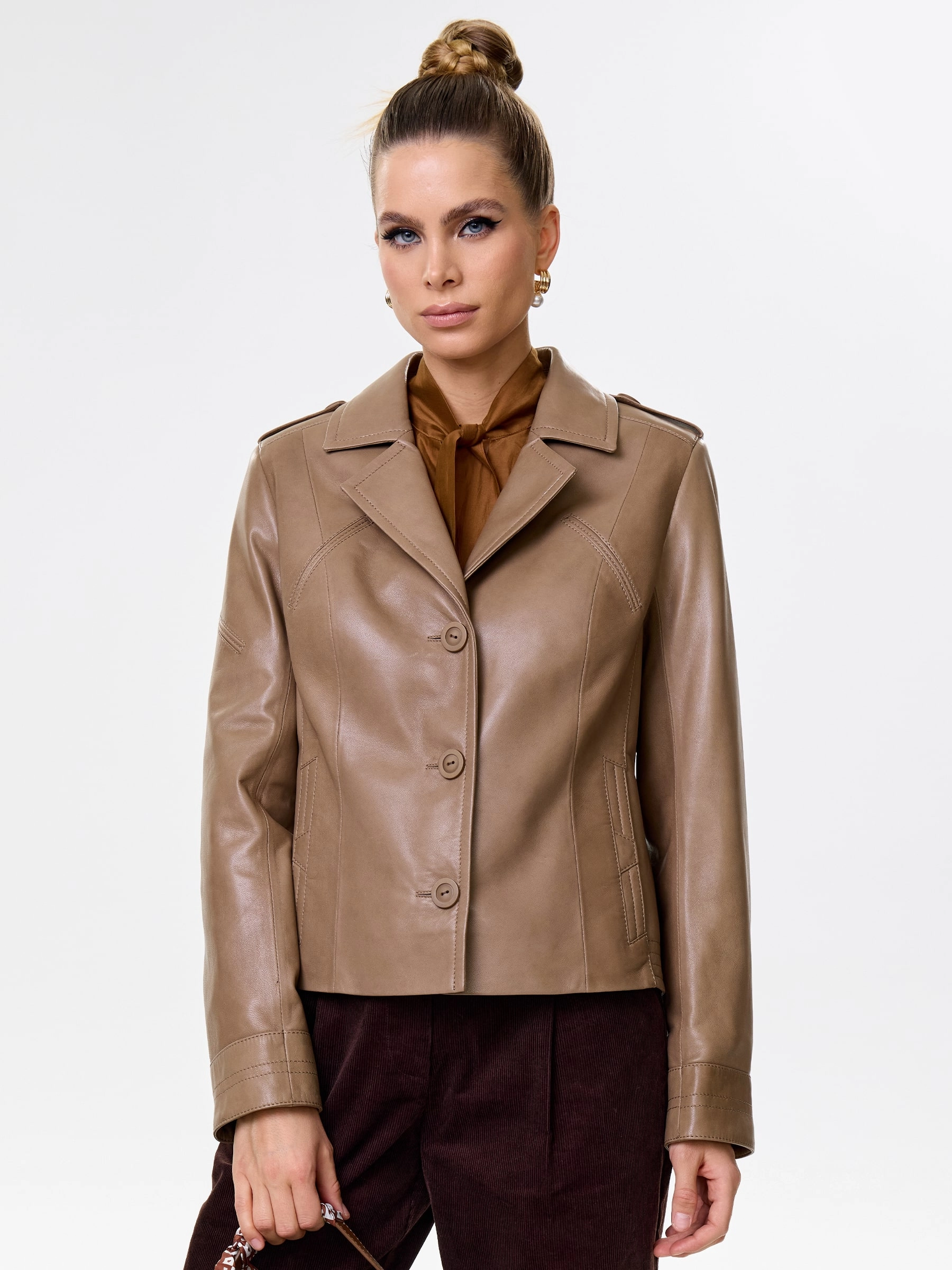 Короткая женская кожаная куртка пиджак 304, серо-коричневая, размер 46, артикул 90701