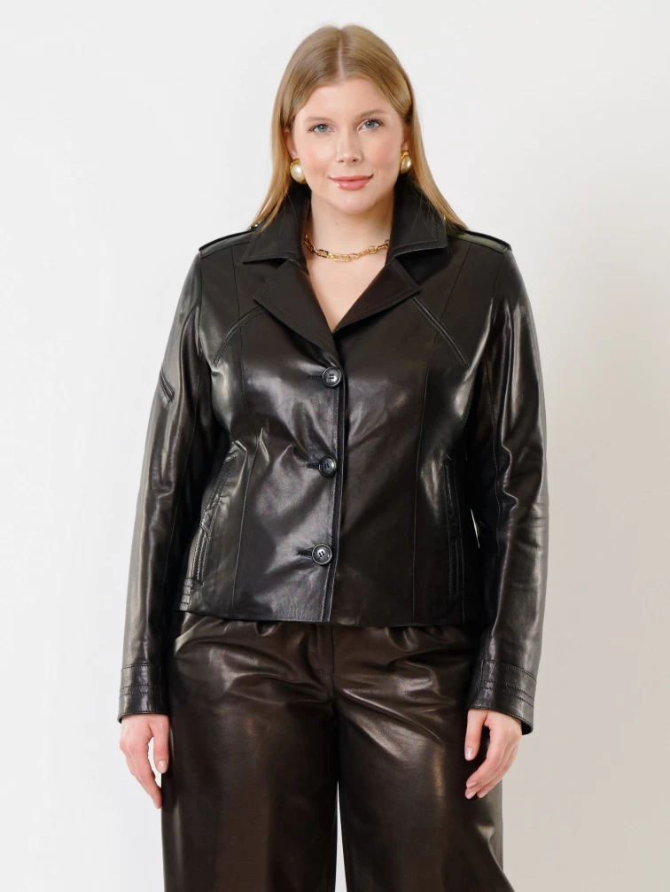 Короткая женская кожаная куртка пиджак 304, черная, размер 46, артикул 91213