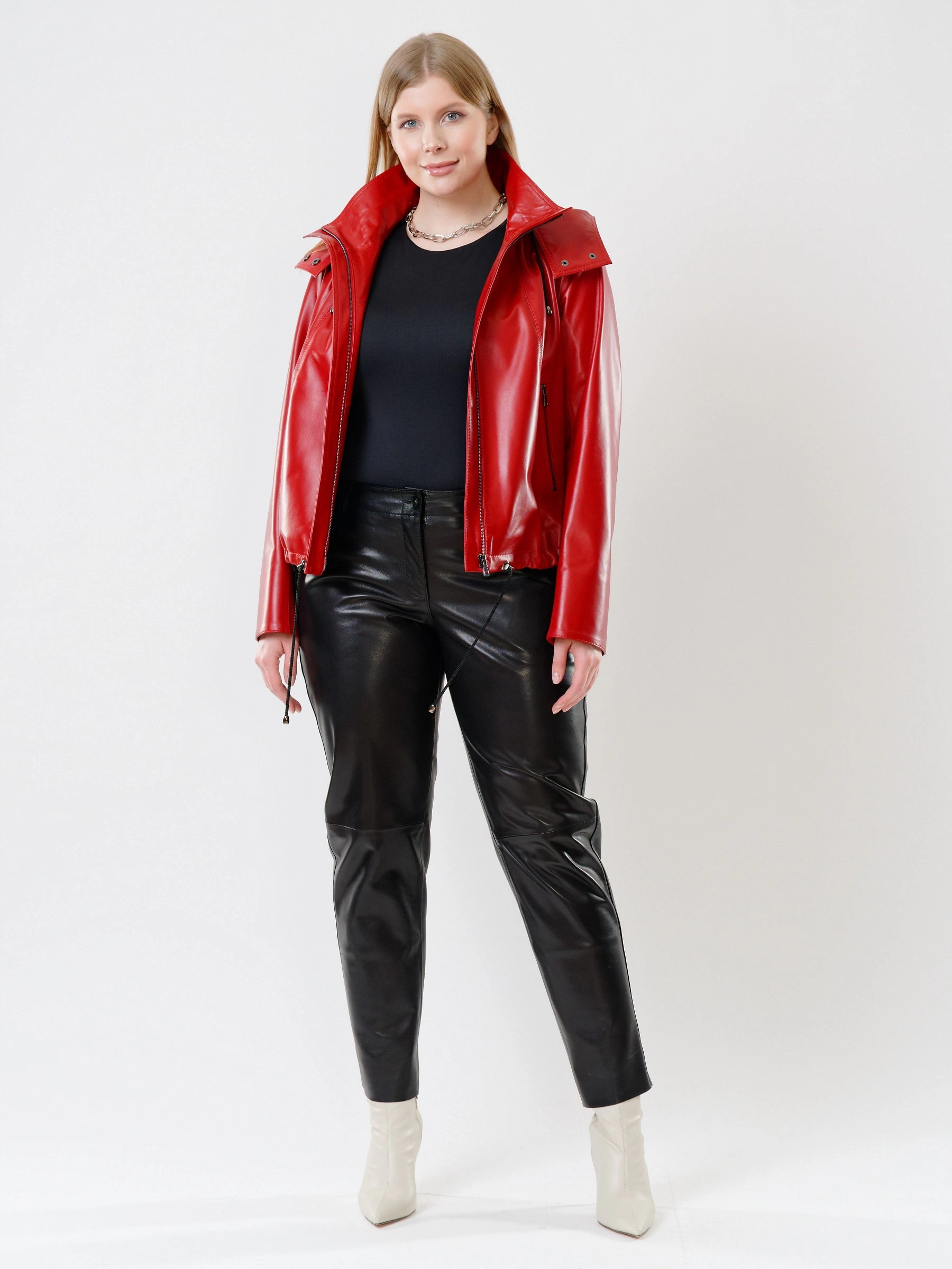 Кожаная женская куртка бомбер с капюшоном 305, красная, размер 48, артикул 91440