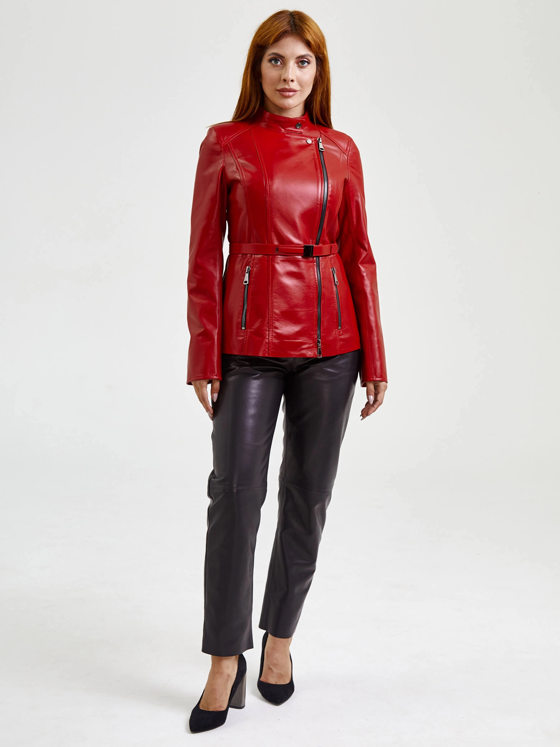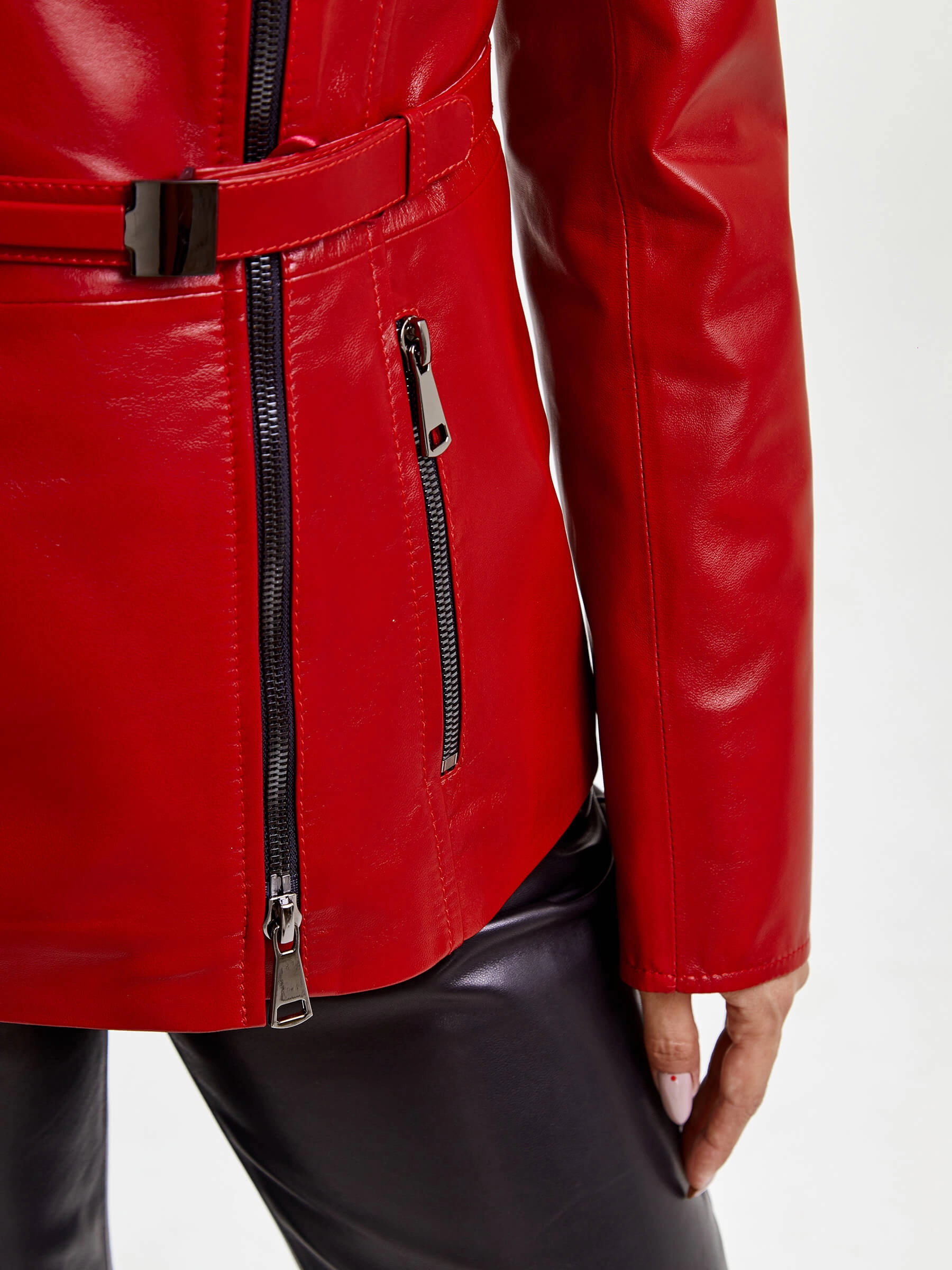 Женская кожаная куртка косуха с поясом 320(нв), красная, размер 46, артикул 90620