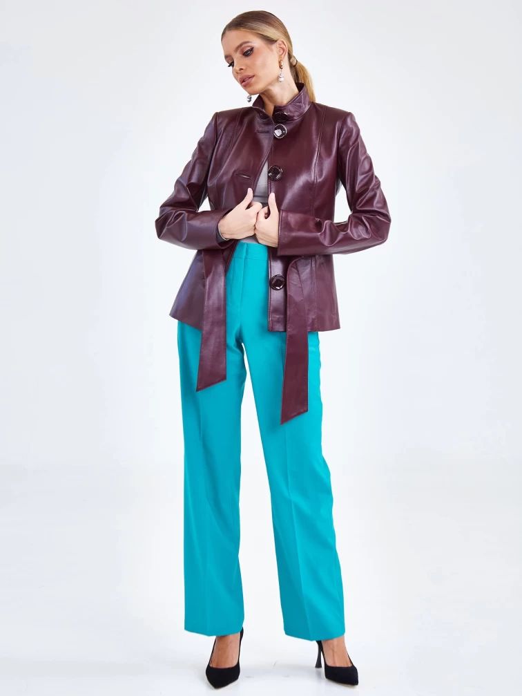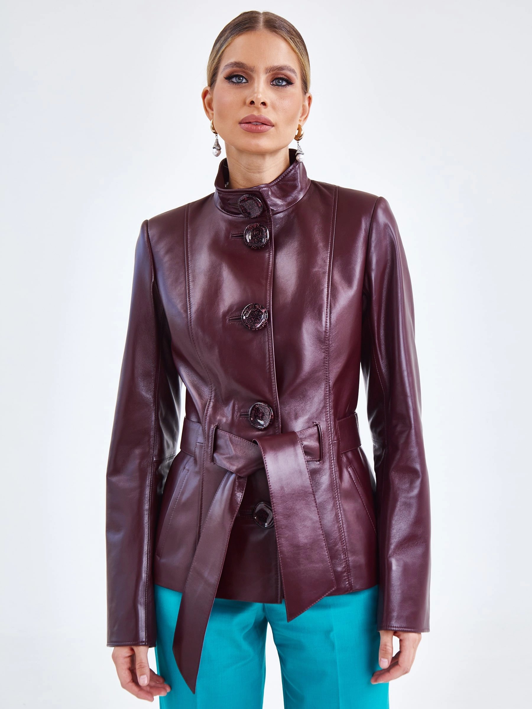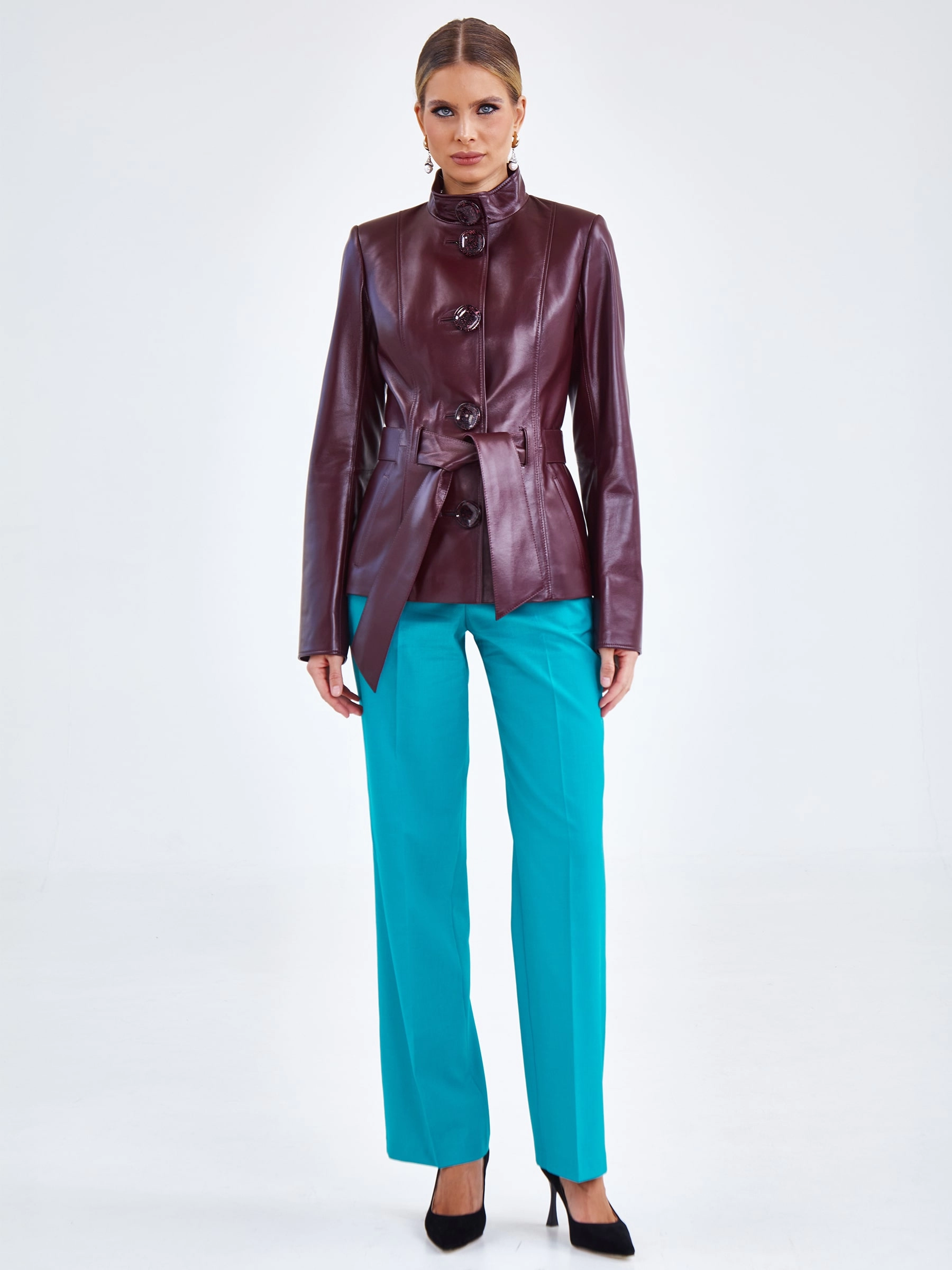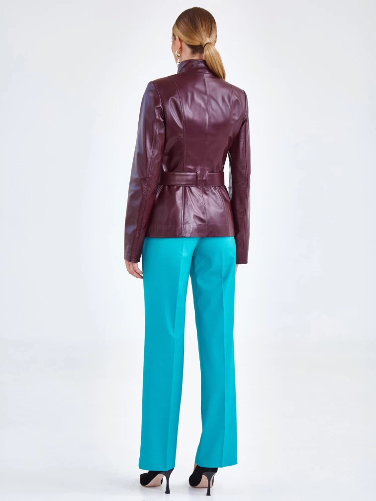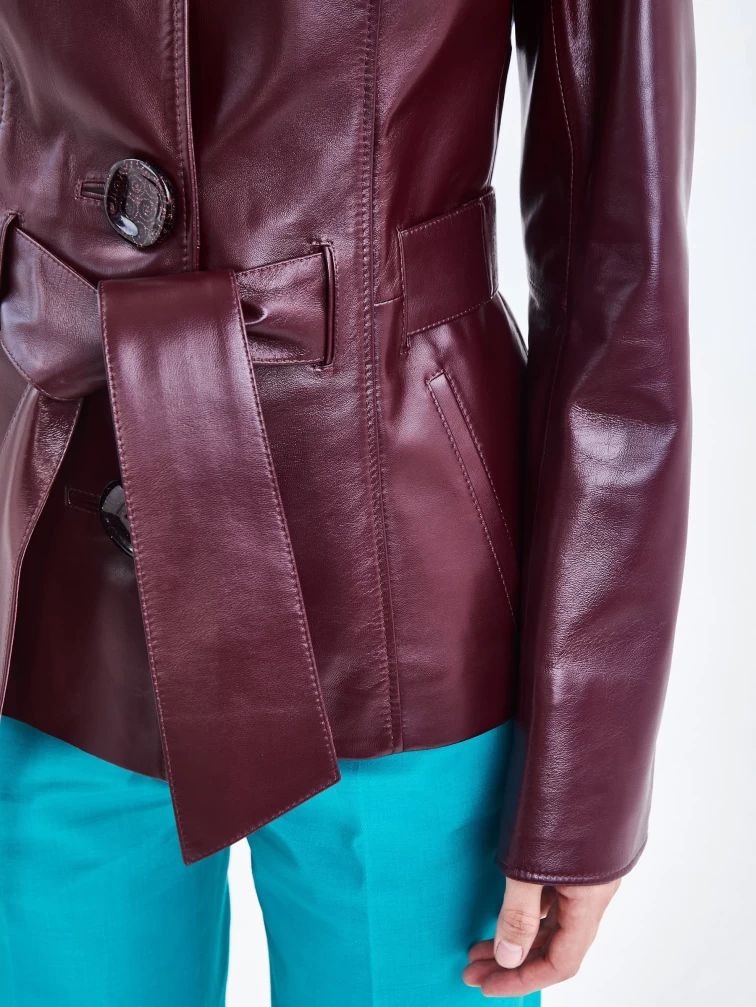 Товар кожаная женская куртка с поясом 334, бордовая, размер 56, артикул 90630 выполнен из натуральной кожи с застежкой пуговицы. Рассчитан на сезон: весна-лето. Длина изделия 66 см, силуэт приталенный .