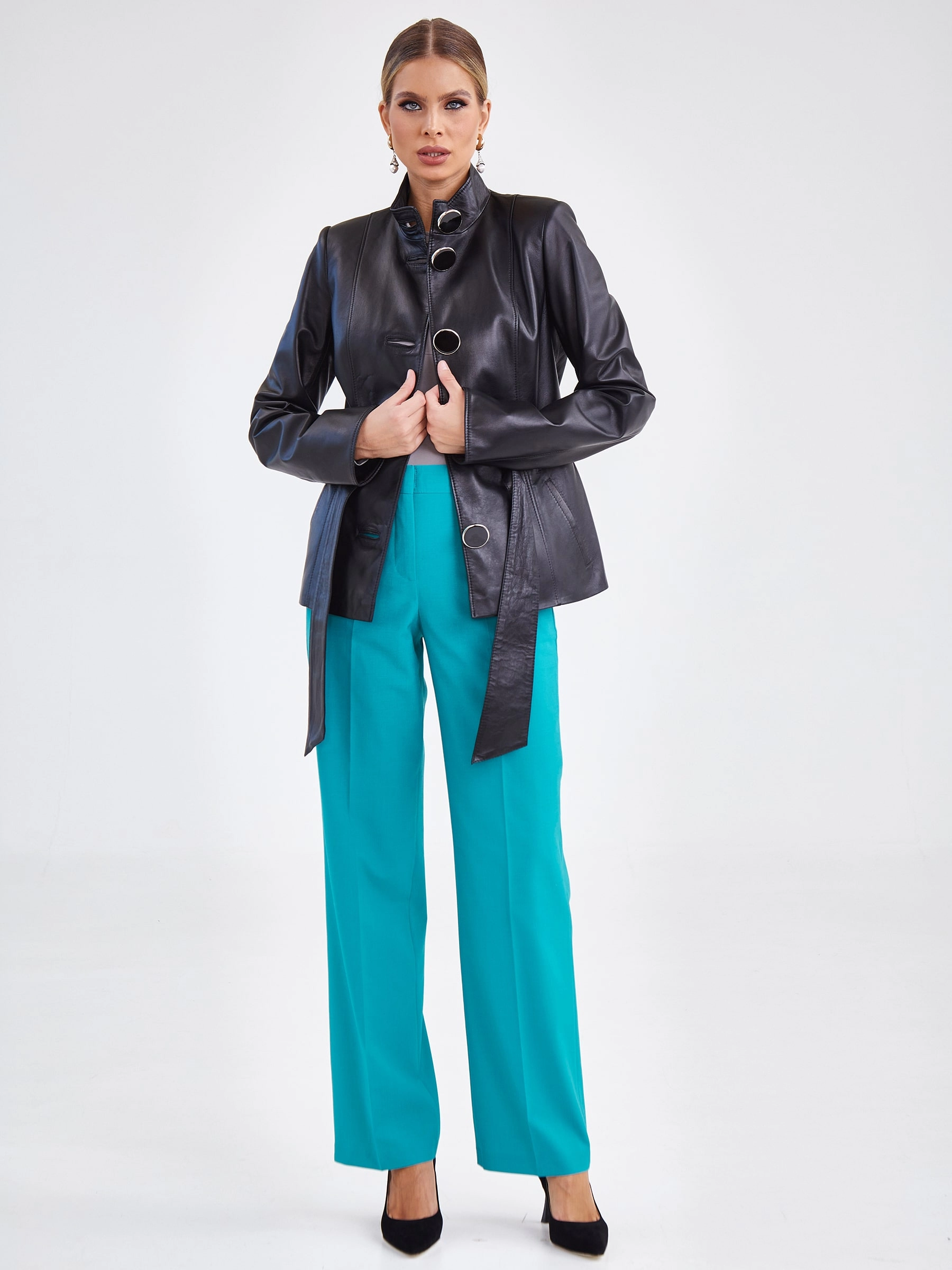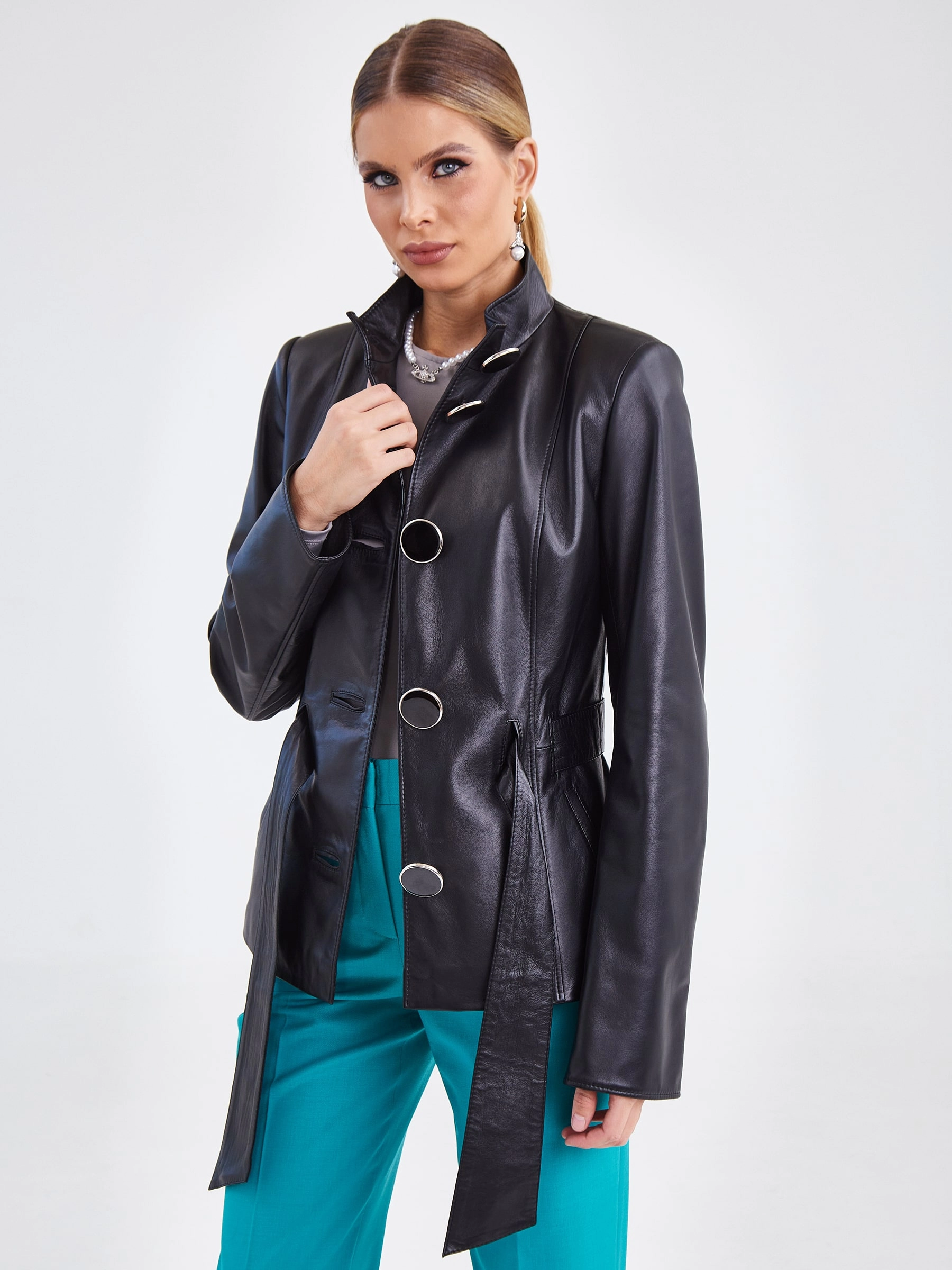 Товар кожаная женская куртка с поясом 334, черная, размер 40, артикул 15420 выполнен из натуральной кожи с застежкой пуговицы. Рассчитан на сезон: весна-лето. Длина изделия 66 см, силуэт приталенный .