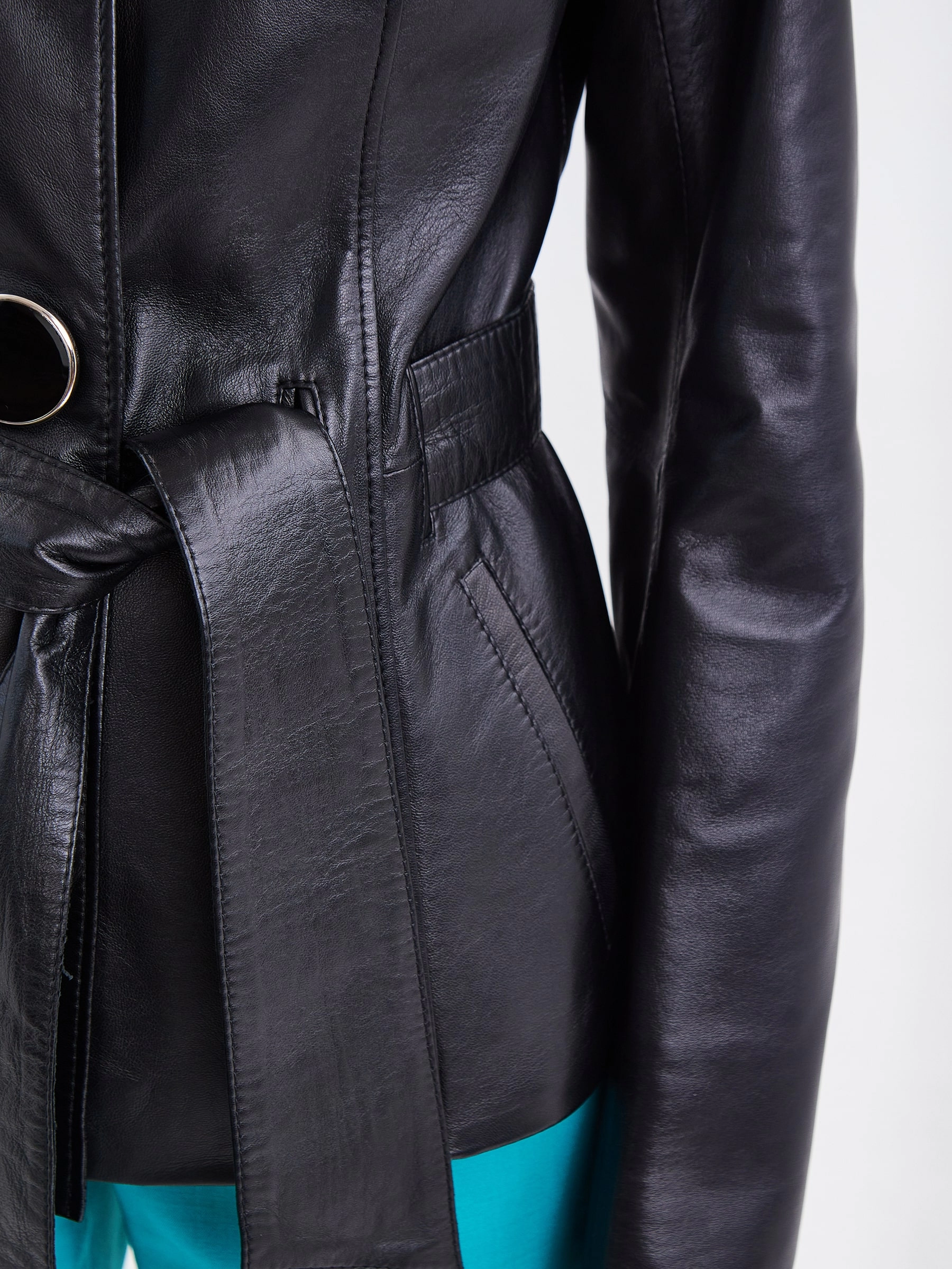 Кожаная женская куртка с поясом 334, черная, размер 40, артикул 15420