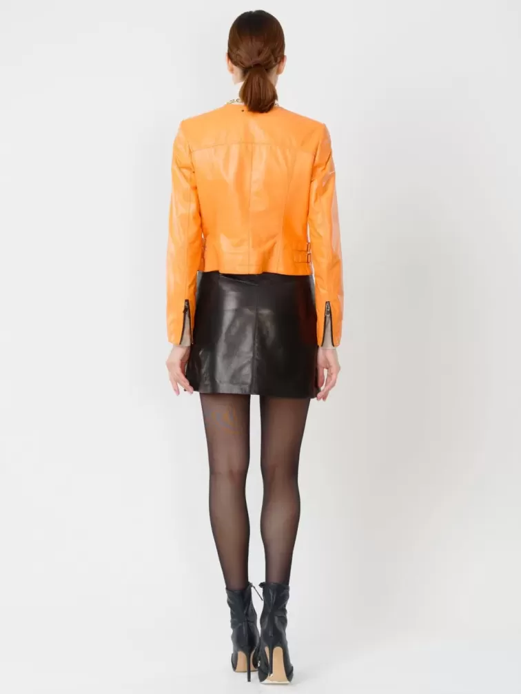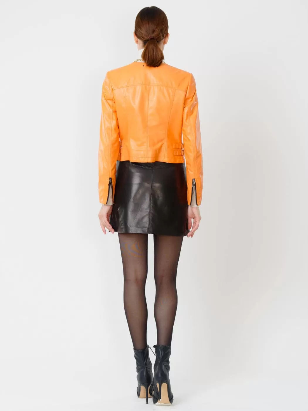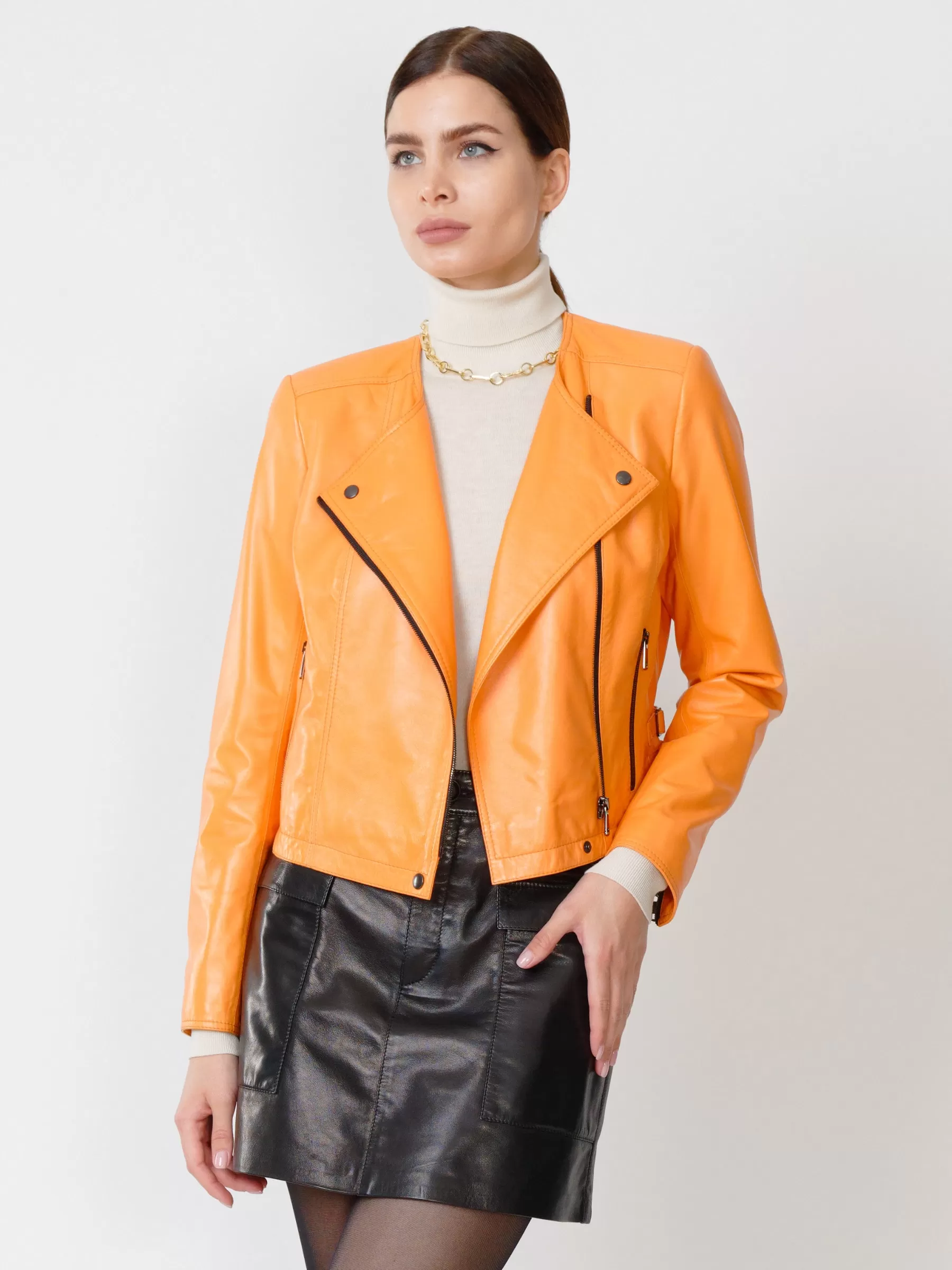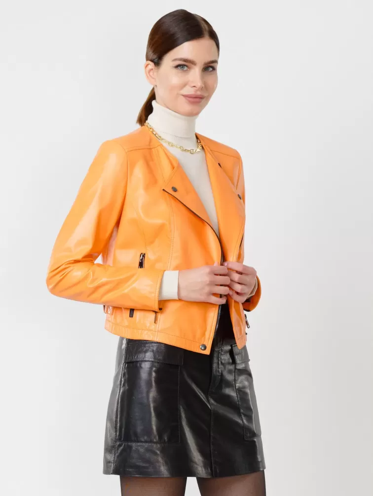 Товар кожаная женская куртка косуха 389, оранжевая, размер 46, артикул 90880 выполнен из натуральной кожи с застежкой молния. Рассчитан на сезон: весна-лето. Длина изделия 45 см, силуэт полуприлегающий.
