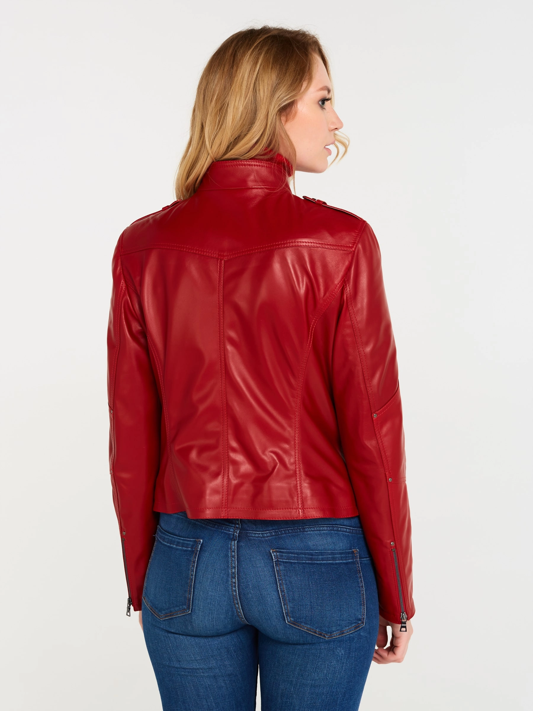 Товар кожаная куртка женская 399, красная, размер 48, артикул 18370 выполнен из натуральной кожи с застежкой молния. Рассчитан на сезон: весна-лето. Длина изделия 51 см, силуэт приталенный .